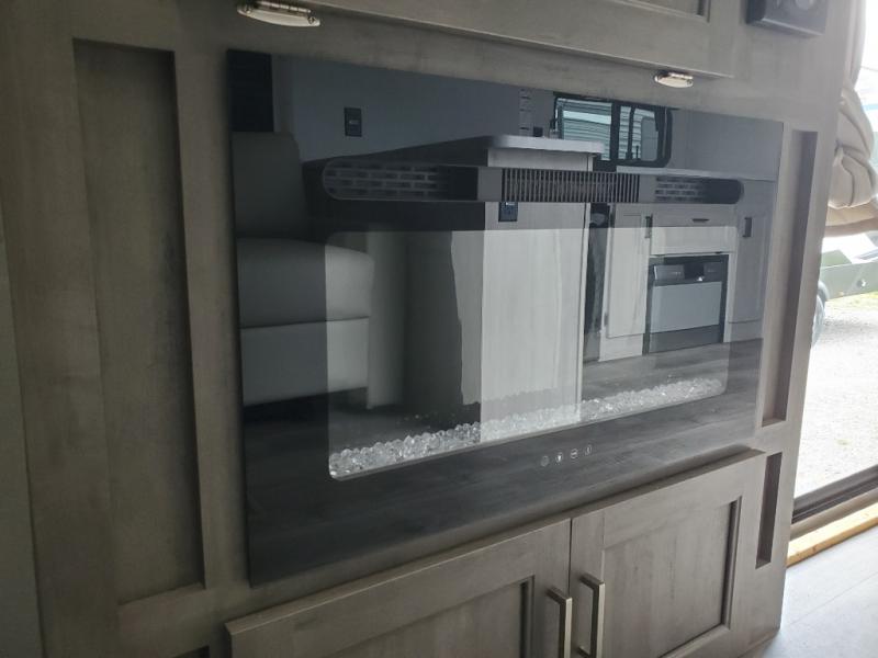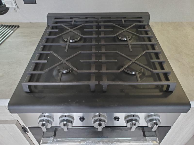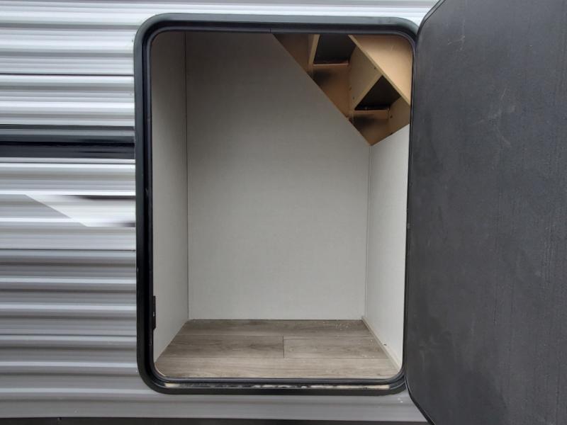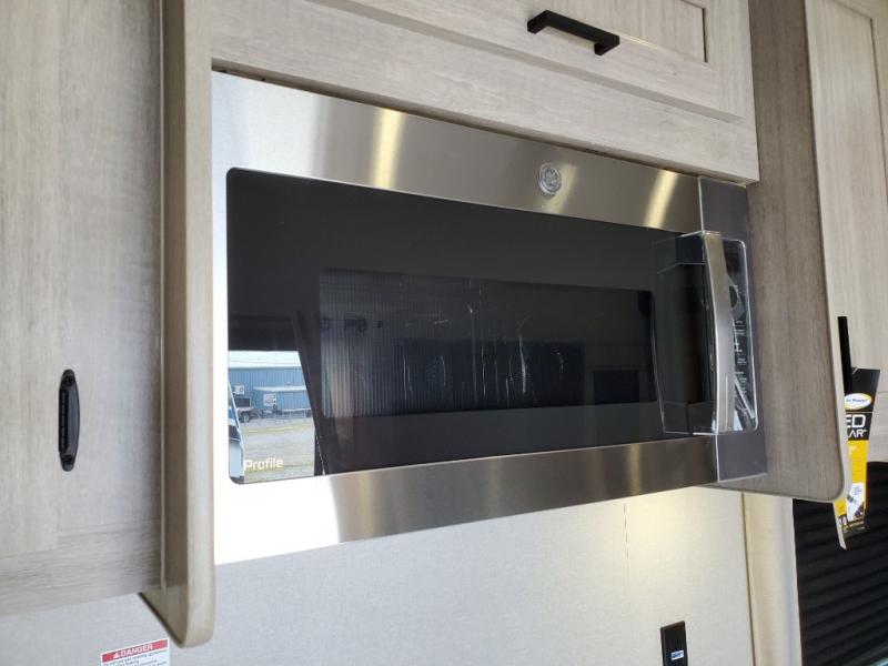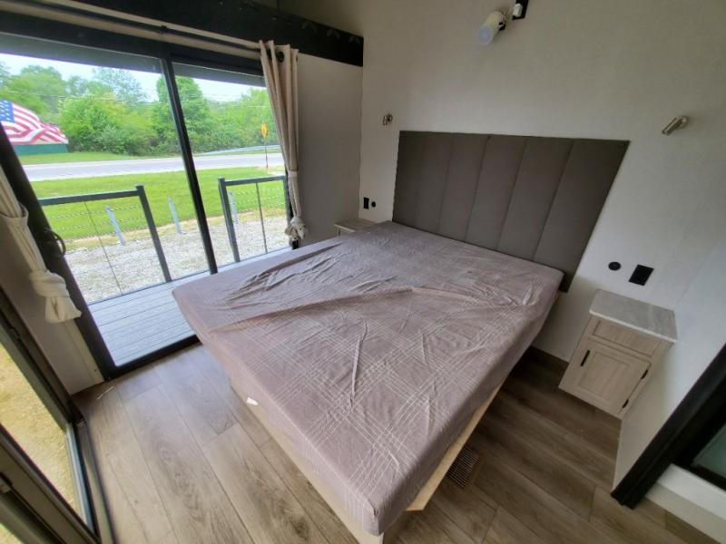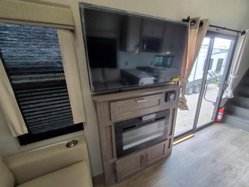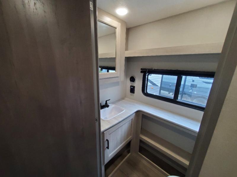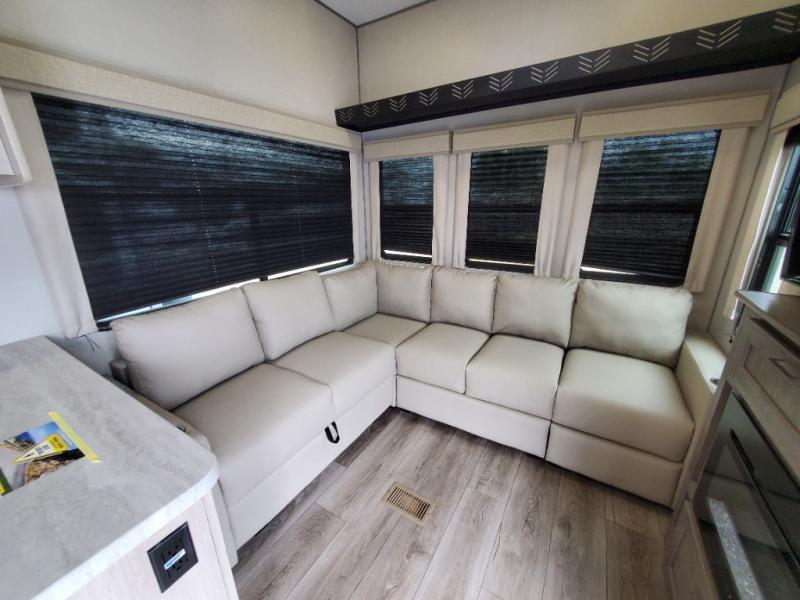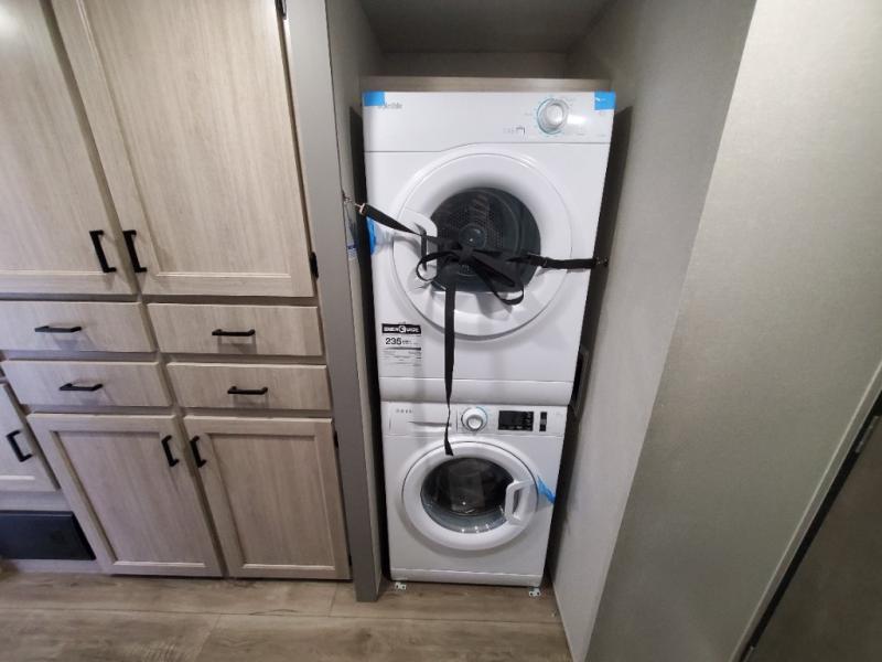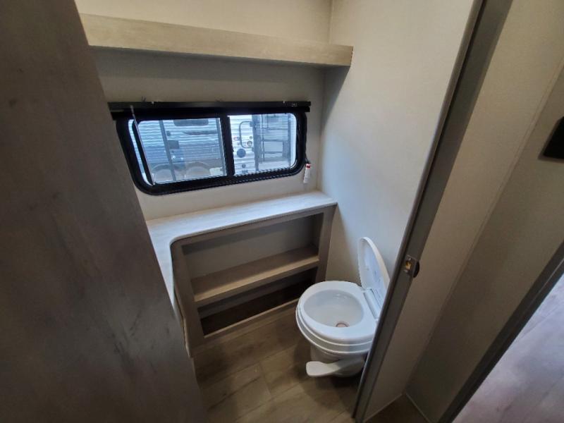 Plan to stay awhile in this spacious destination trailer with a loft! The loft includes cabinets so the little ones can keep their things picked up, and you'll appreciate tons of storage on the main level as well. You'll find your own space in the rear bedroom that includes a patio door that leads to the covered porch, a 60" x 74" queen bed, a wardrobe with drawers, plus a high ceiling that will make this space feel more open. There is a 48" x 30" shower with a seat to freshen up each day and a private toilet and sink so two people can use this space at once, or you can shut the two main doors to make one big bathroom! The front living area will be a favorite place to hang out since there is an L-shaped sectional sofa, and the full kitchen will allow you to make your best meals while you're away from home. The high kitchen/living room ceiling is another great feature on this unit, making your space more open!