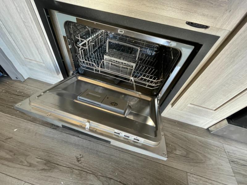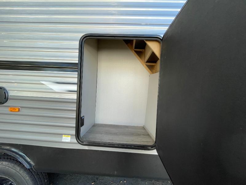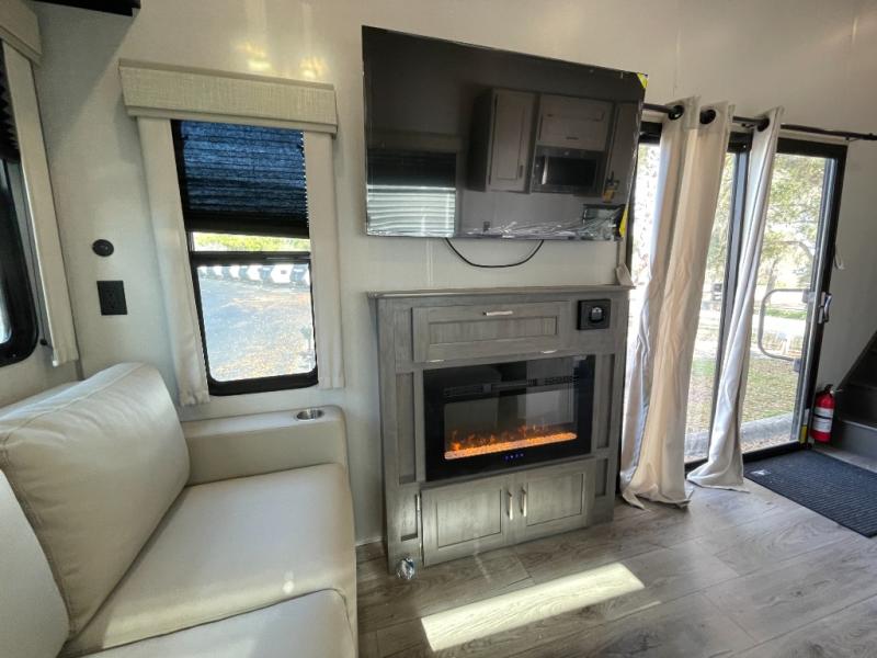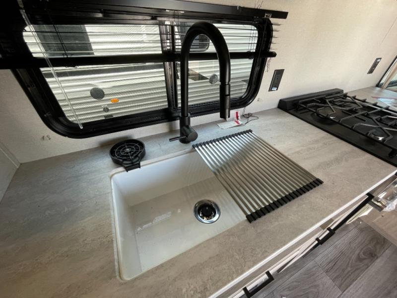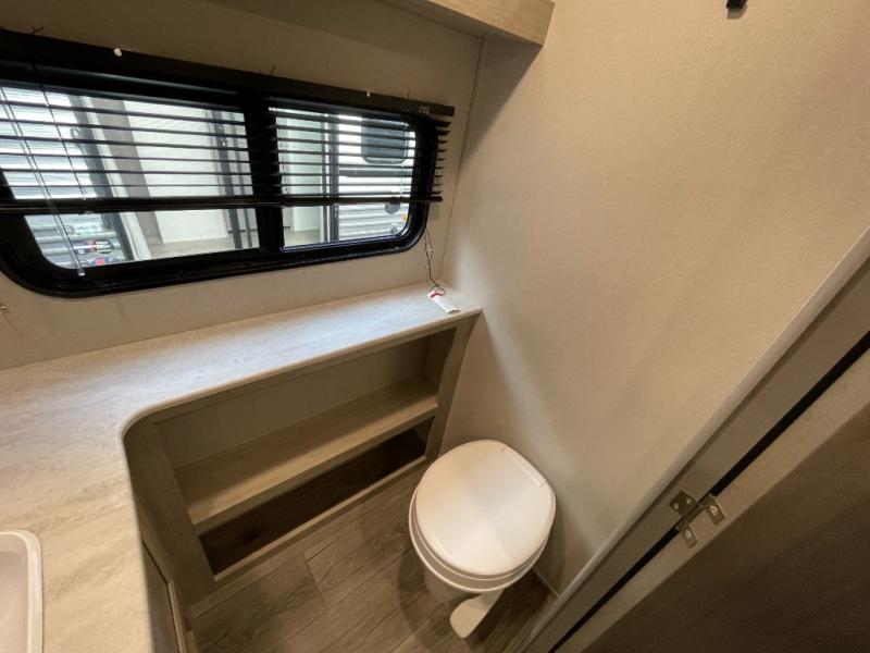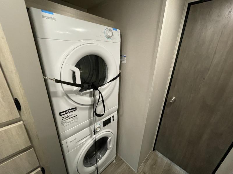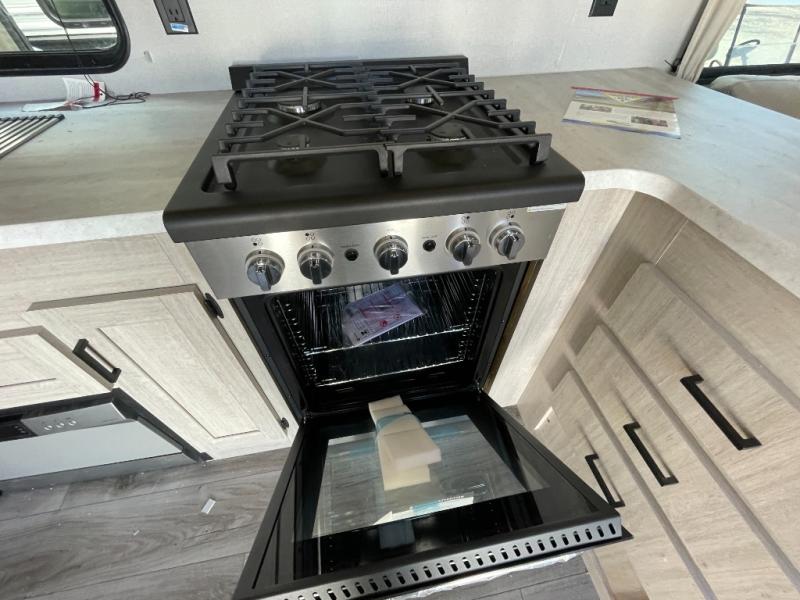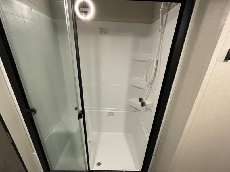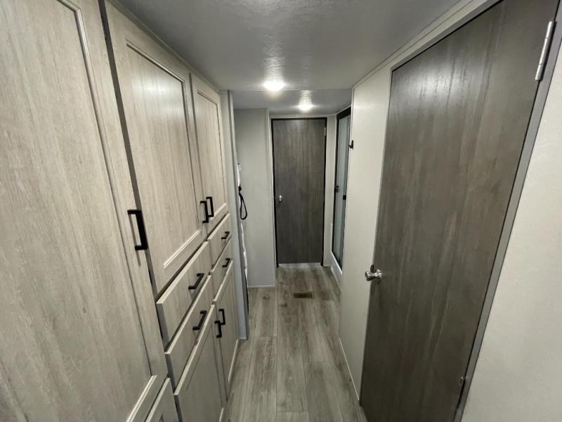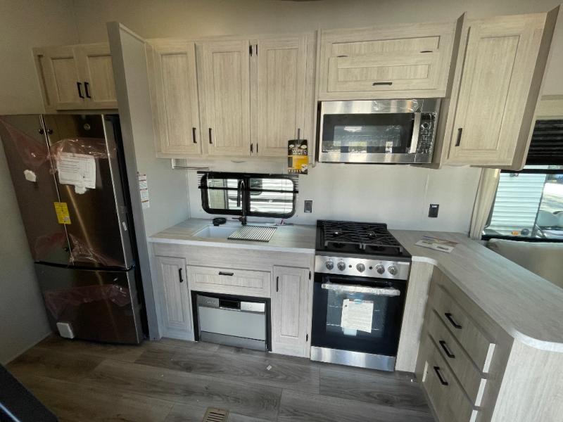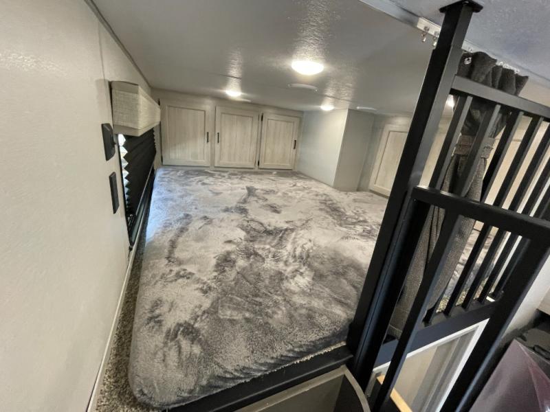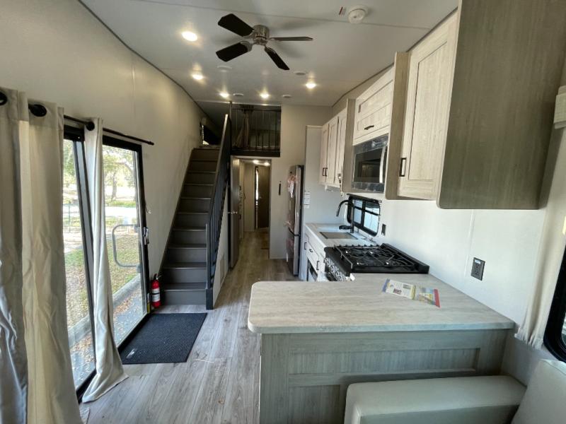 Plan to stay awhile in this spacious destination trailer with a loft! The loft includes cabinets so the little ones can keep their things picked up, and you'll appreciate tons of storage on the main level as well. You'll find your own space in the rear bedroom that includes a patio door that leads to the covered porch, a 60" x 74" queen bed, a wardrobe with drawers, plus a high ceiling that will make this space feel more open. There is a 48" x 30" shower with a seat to freshen up each day and a private toilet and sink so two people can use this space at once, or you can shut the two main doors to make one big bathroom! The front living area will be a favorite place to hang out since there is an L-shaped sectional sofa, and the full kitchen will allow you to make your best meals while you're away from home. The high kitchen/living room ceiling is another great feature on this unit, making your space more open!