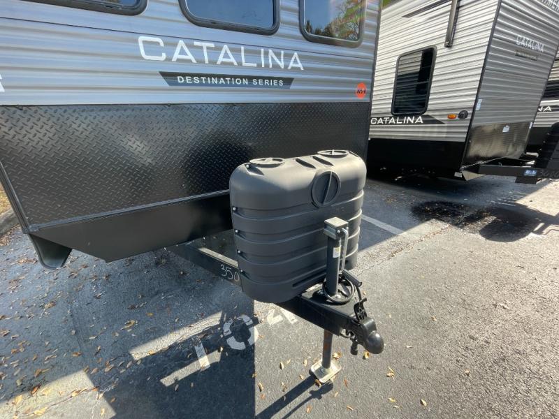 With any Catalina Destination trailer by Coachmen, you will enjoy comfortable extended stays wherever you decide to set up camp! The full length frame outriggers add strength to each unit, along with a seamless Alpha Roof membrane and Norco electromagnetic, powder coated chassis. You will love the open views provided by the large front bay windows, plus there are GE appliances, woodplank linoleum flooring, and hard valance window treatments to make your space feel more like home. Head outside to find a convenient "Leash Link" quick hookup D-ring for your furry friends, premium JBL exterior speakers, flush mount baggage doors for your gear, and the list of amenities goes on!