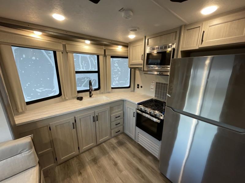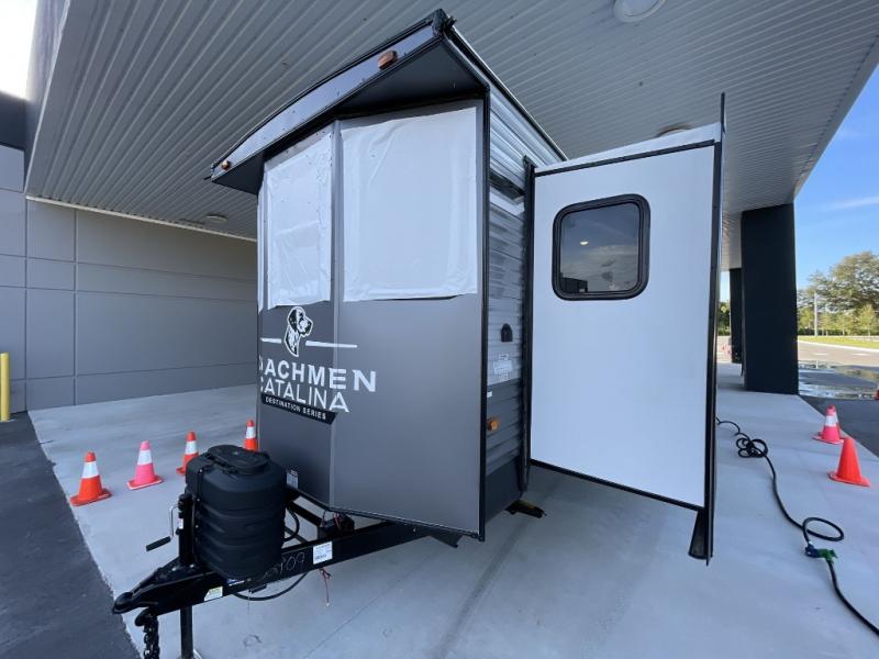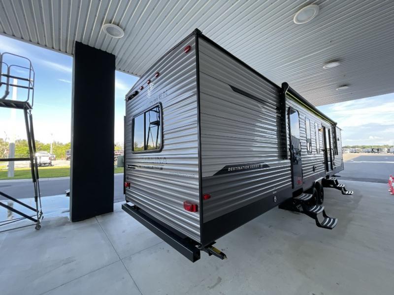 With any Catalina Destination trailer by Coachmen, you will enjoy comfortable extended stays wherever you decide to set up camp! The full length frame outriggers add strength to each unit, along with a seamless Alpha Roof membrane and Norco electromagnetic, powder coated chassis. You will love the open views provided by the large front bay windows, plus there are GE appliances, woodplank linoleum flooring, and hard valance window treatments to make your space feel more like home. Head outside to find a convenient "Leash Link" quick hookup D-ring for your furry friends, premium JBL exterior speakers, flush mount baggage doors for your gear, and the list of amenities goes on!