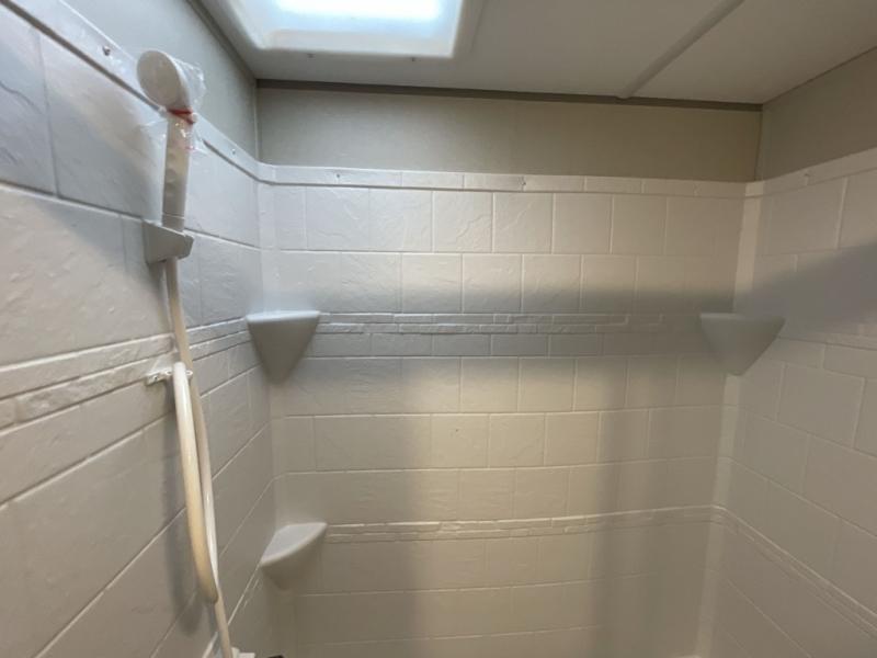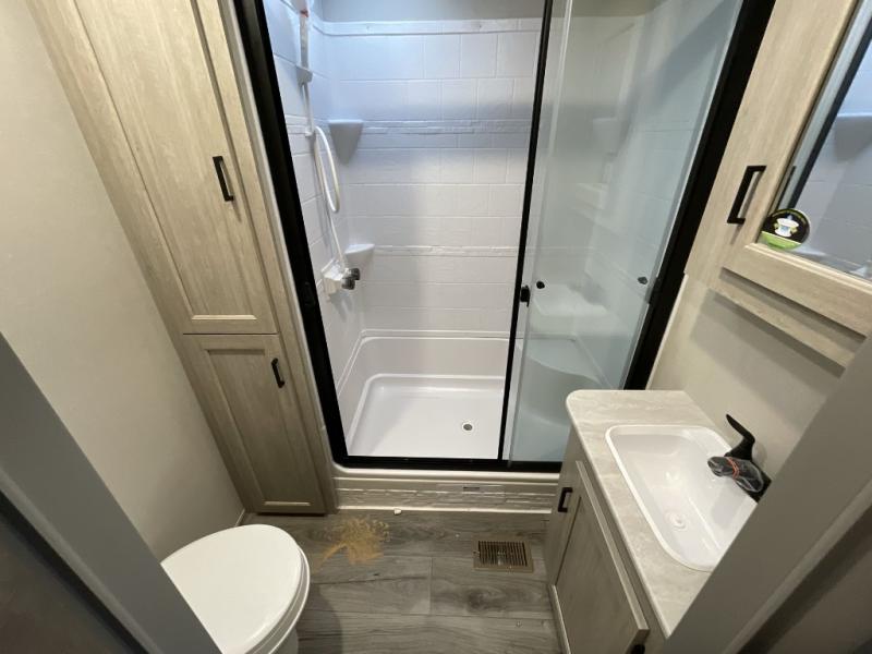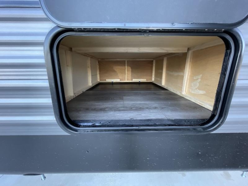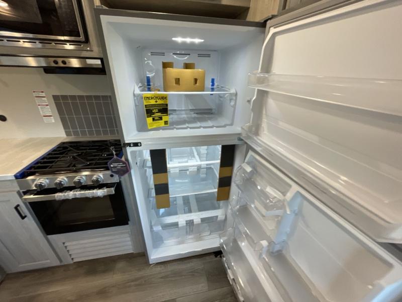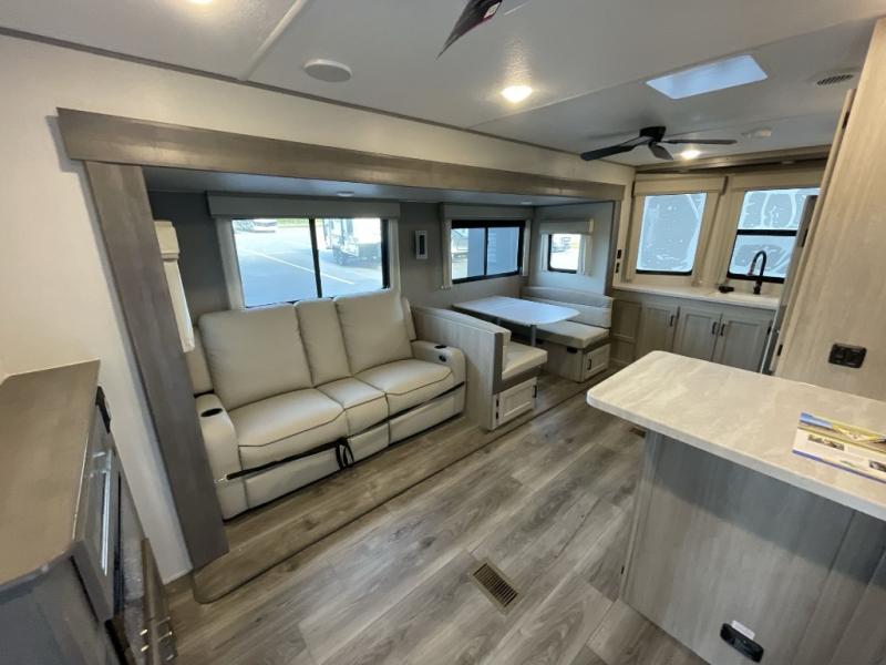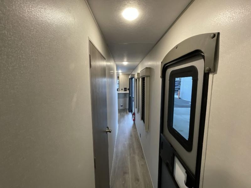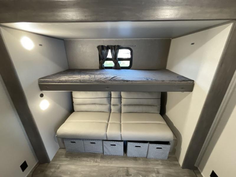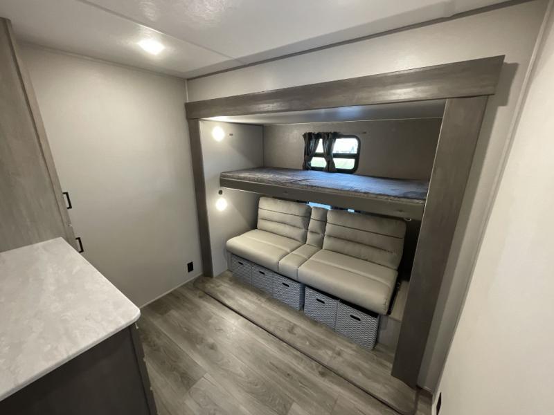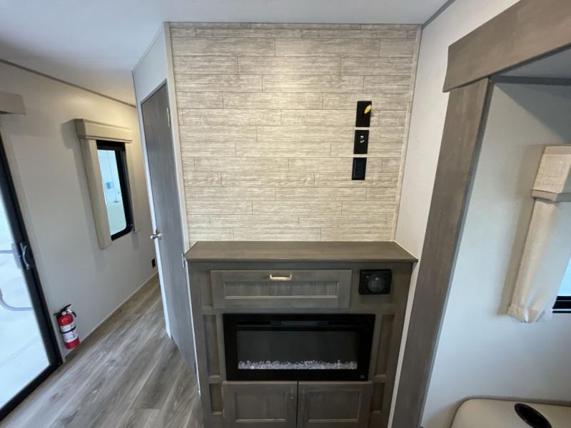 Pack up your clothes and groceries and head out for a long weekend at your own place with this destination trailer! You can enter through the main patio door or near the rear bedroom and full bathroom. You will find storage throughout in the wardrobes, linen cabinet, pantry and more! The kids will surely head to the middle bunkhouse featuring a jackknife sofa with a flip-up bunk and storage totes beneath. Someone will probably relax on the theater seating by the fireplace, or you can all play a game at the booth dinette. The ceiling fans will keep you cooler in the summer months along with the air conditioner. And the cook will love the front kitchen layout and all the appliances to keep everyone fed.