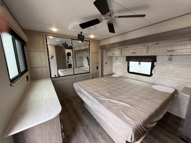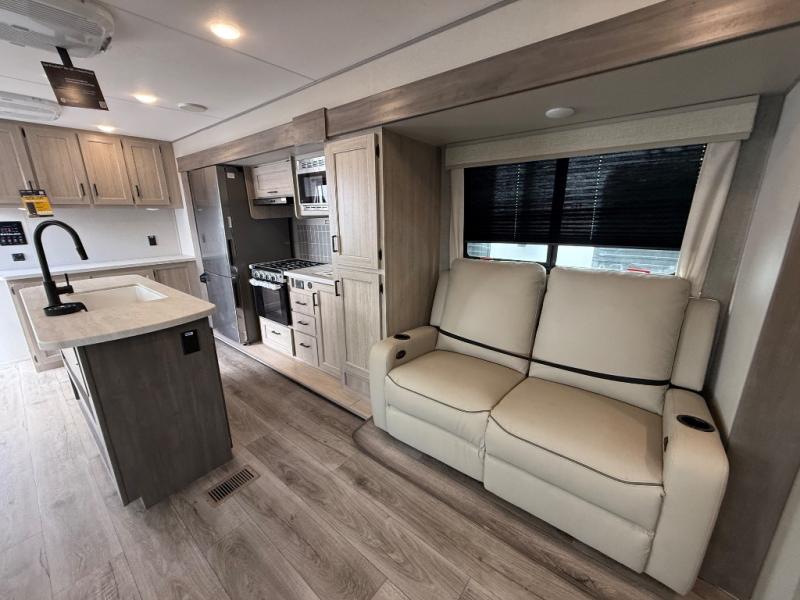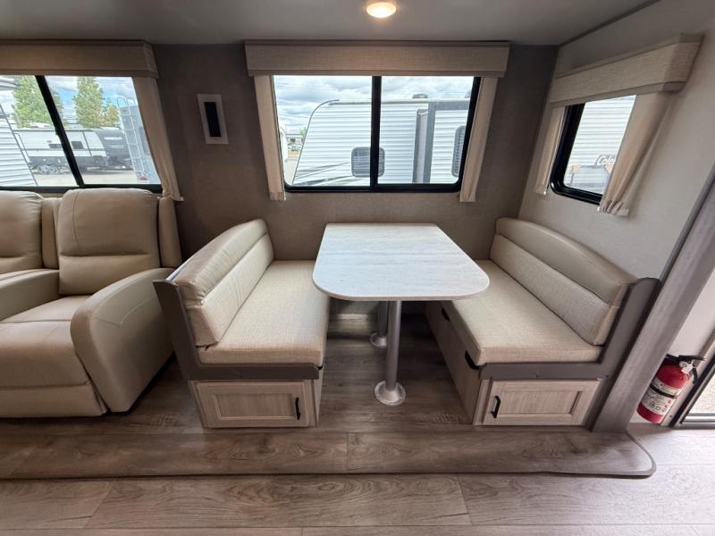 You'll feel right at home in this spacious destination trailer with triple slides. The front entertainment center and front living room includes theater seating, dual recliner lounges, and a booth dinette for ample seating space. You might like to add the free standing dinette option if you prefer that type of seating. The cook will love the spacious kitchen with an island, a residential refrigerator, a pantry and an extra countertop space. The full bathroom offers a shower with a seat and linen storage with washer/dryer prep for added convivence. Head to the rear bedroom for a great night's rest on the king bed slide out, and you can store all your clothes in the dresser with drawers or rear wardrobe with interior storage shelves!