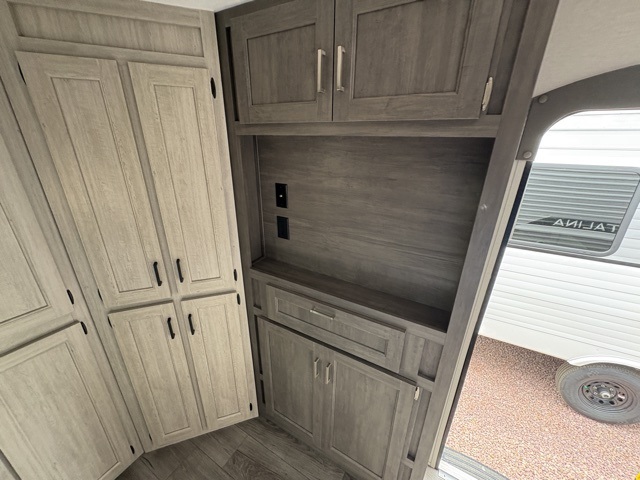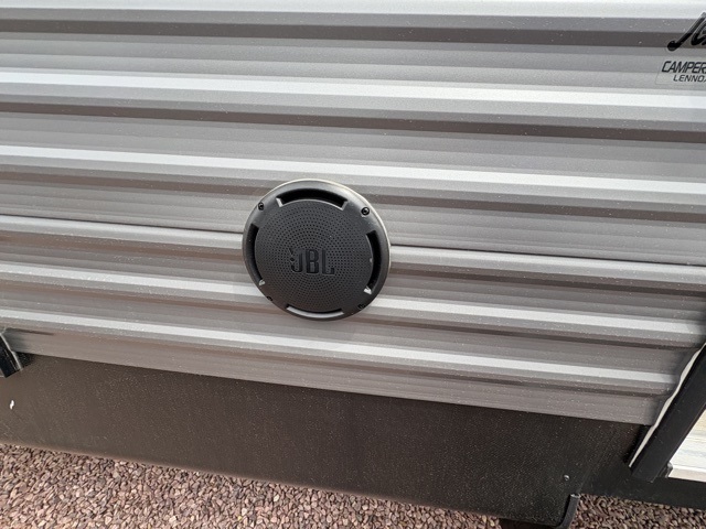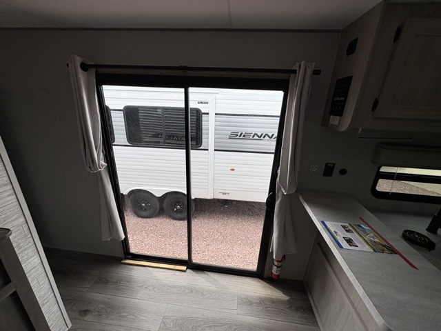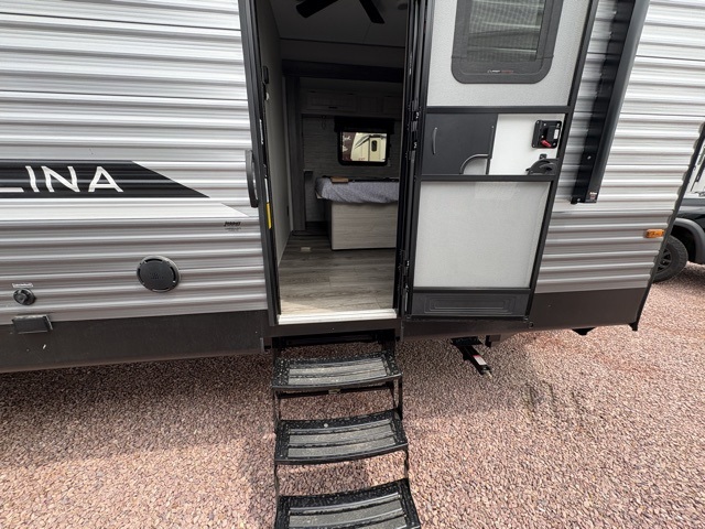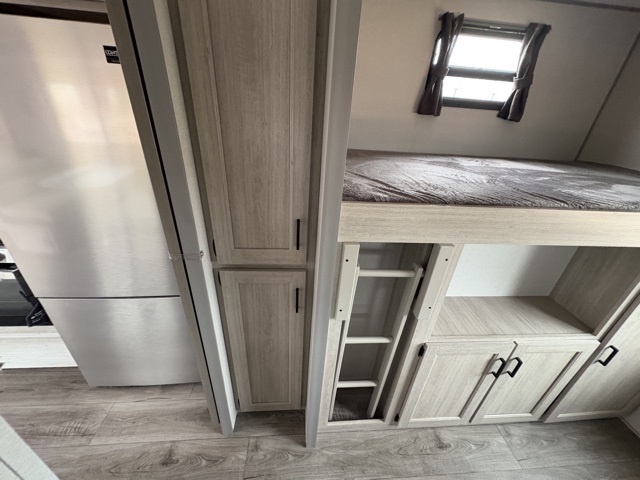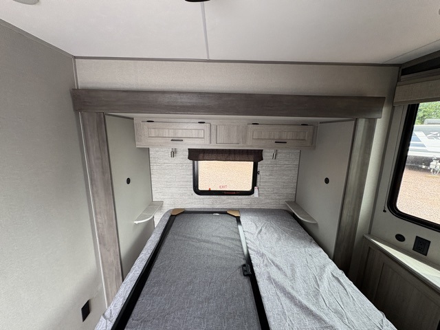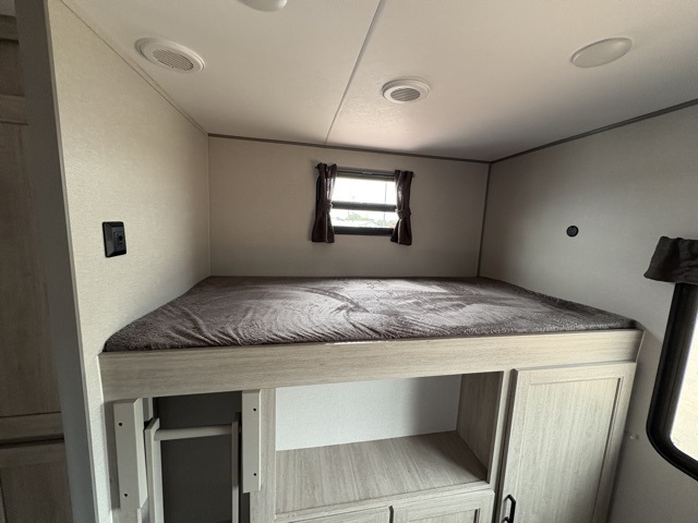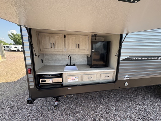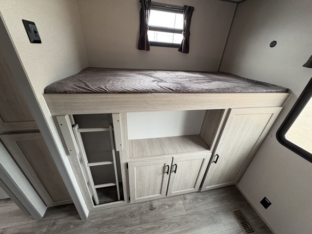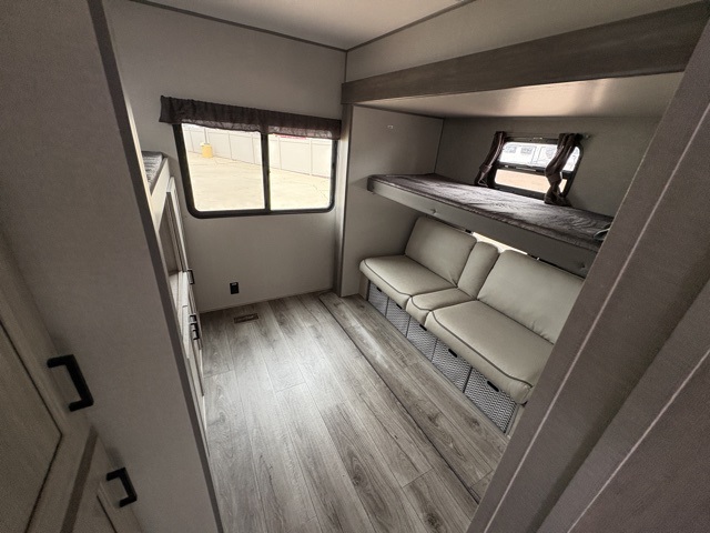 This is the perfect trailer to enjoy long vacations with friends and family. The rear bunkhouse includes a jackknife sofa and flip-up bunk within a slide out, plus storage totes beneath the sofa and a loft bed/bunk across the room. When you want to do a little entertaining, the main living area will be the perfect spot to do so with its tri-fold sofa, booth dinette, and entertainment center with a fireplace. You might even want to choose the theater seating option if you prefer.. The private front bedroom with its own exterior entry door features a queen bed slide out as a nice retreat, and with a separate entry door you can easily slip out for late-night star gazing, a quiet evening out under the optional 21' patio awning, or an early morning walk. And you might want to add the optional full size camp kitchen outside if you enjoy cooking outdoors!