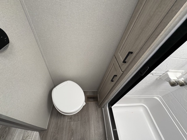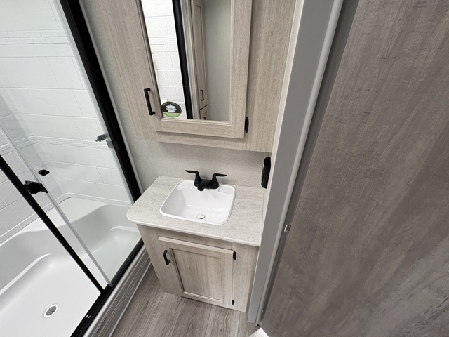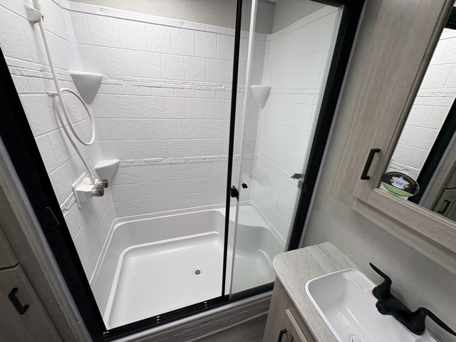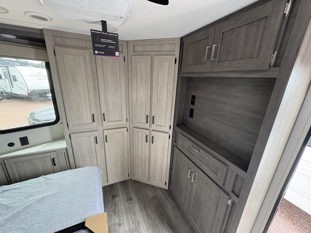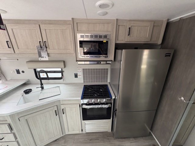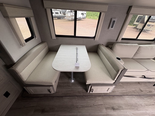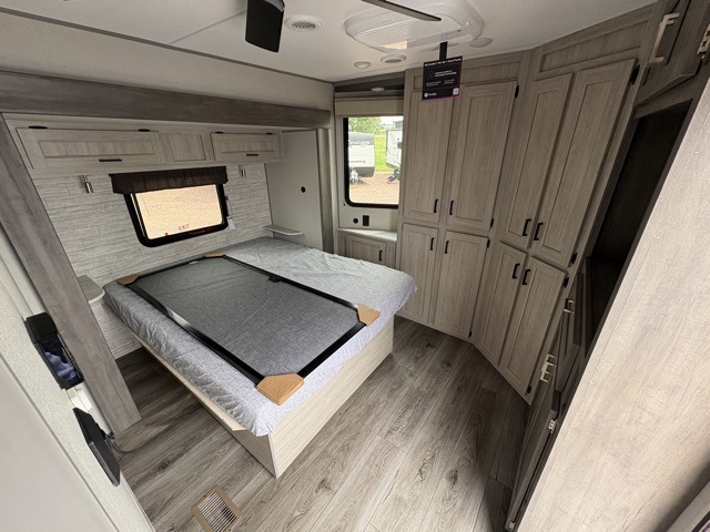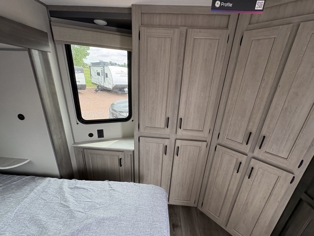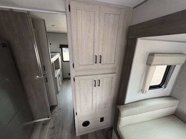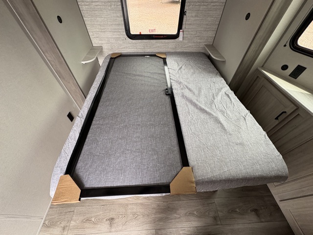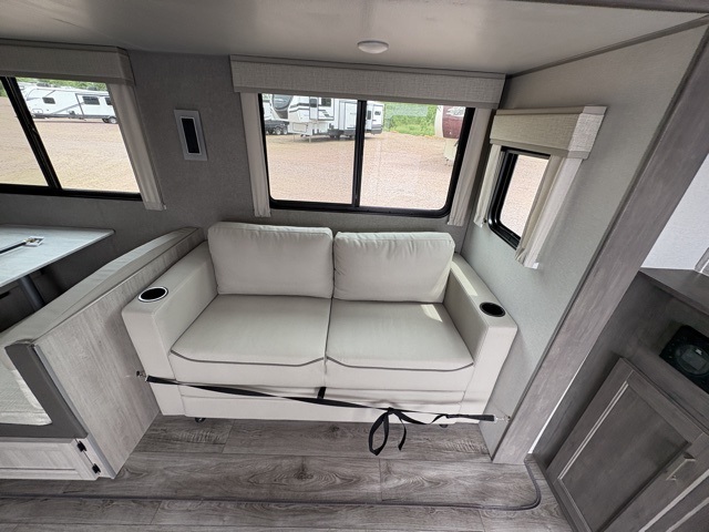 This is the perfect trailer to enjoy long vacations with friends and family. The rear bunkhouse includes a jackknife sofa and flip-up bunk within a slide out, plus storage totes beneath the sofa and a loft bed/bunk across the room. When you want to do a little entertaining, the main living area will be the perfect spot to do so with its tri-fold sofa, booth dinette, and entertainment center with a fireplace. You might even want to choose the theater seating option if you prefer.. The private front bedroom with its own exterior entry door features a queen bed slide out as a nice retreat, and with a separate entry door you can easily slip out for late-night star gazing, a quiet evening out under the optional 21' patio awning, or an early morning walk. And you might want to add the optional full size camp kitchen outside if you enjoy cooking outdoors!