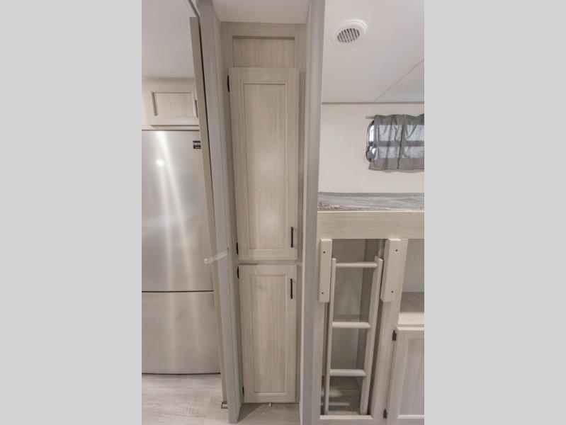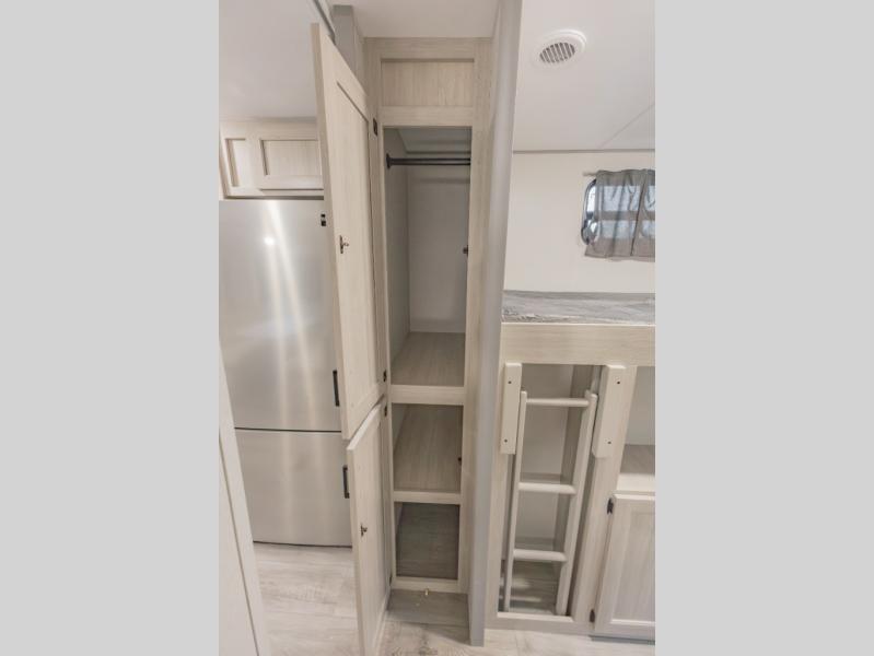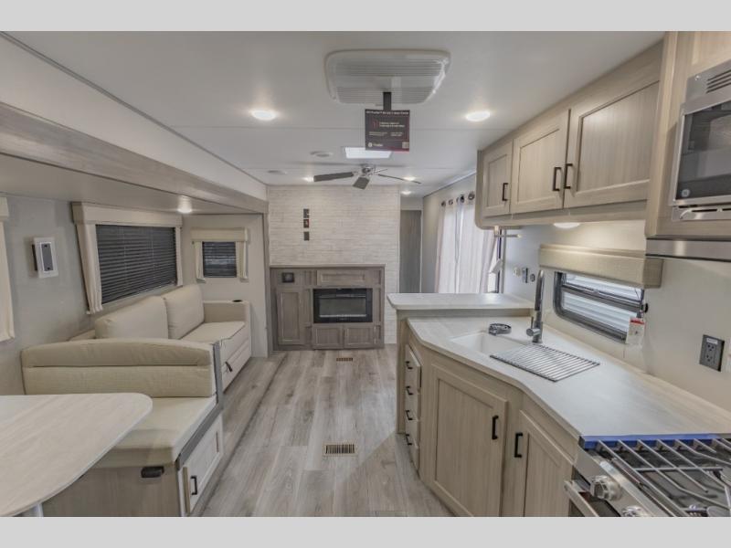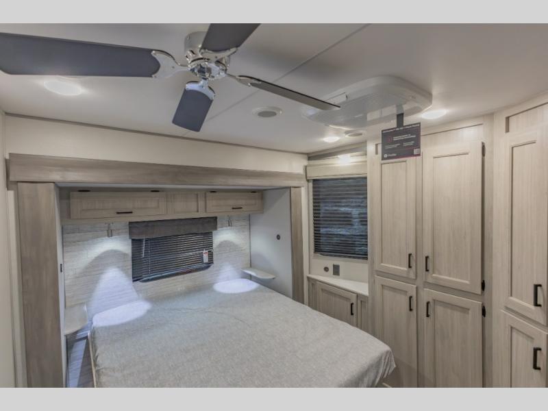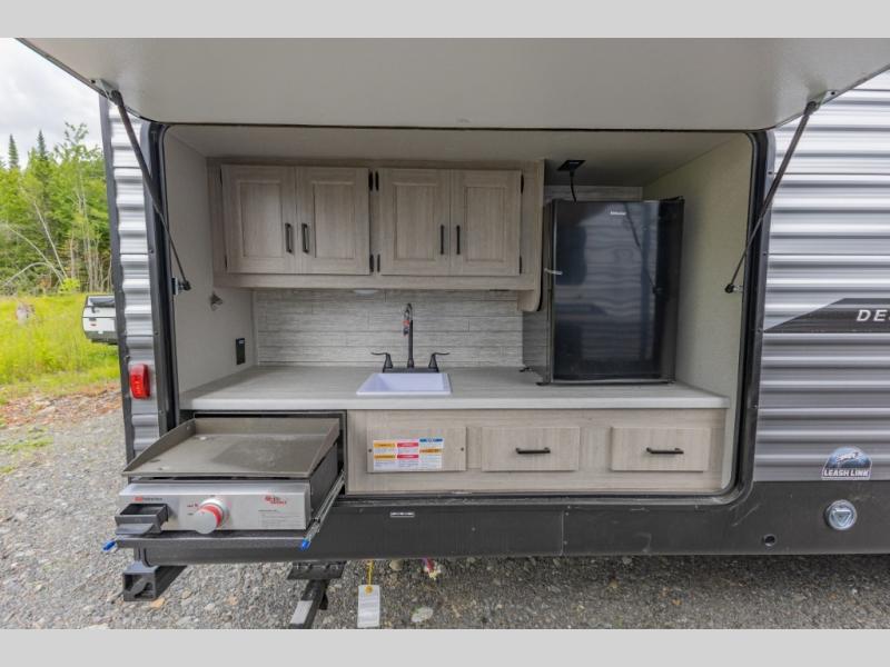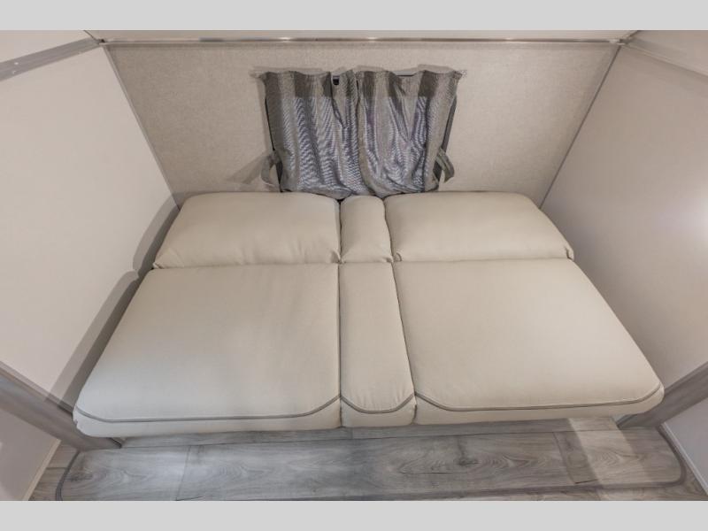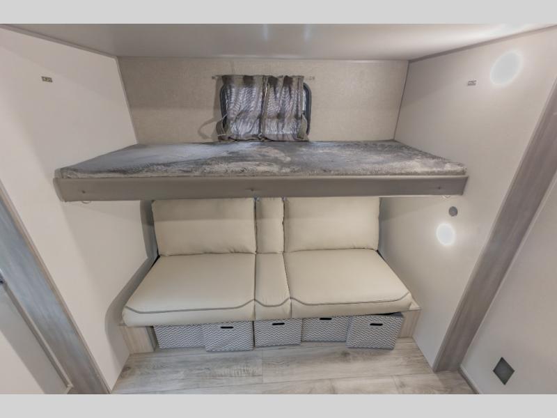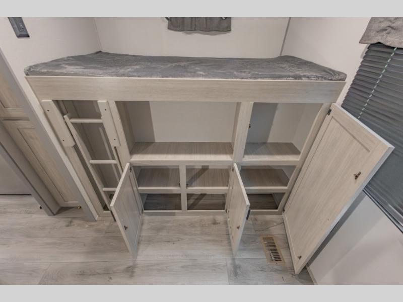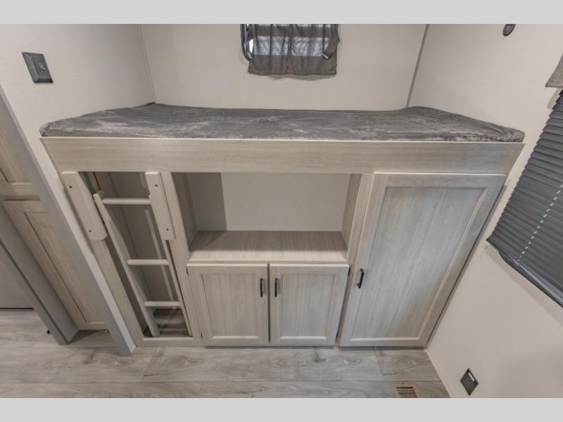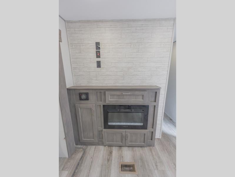 This is the perfect trailer to enjoy long vacations with friends and family. The rear bunkhouse includes a jackknife sofa and flip-up bunk within a slide out, plus storage totes beneath the sofa and a loft bed/bunk across the room. When you want to do a little entertaining, the main living area will be the perfect spot to do so with its tri-fold sofa, booth dinette, and entertainment center with a fireplace. You might even want to choose the theater seating option if you prefer.. The private front bedroom with its own exterior entry door features a queen bed slide out as a nice retreat, and with a separate entry door you can easily slip out for late-night star gazing, a quiet evening out under the optional 21' patio awning, or an early morning walk. And you might want to add the optional full size camp kitchen outside if you enjoy cooking outdoors!