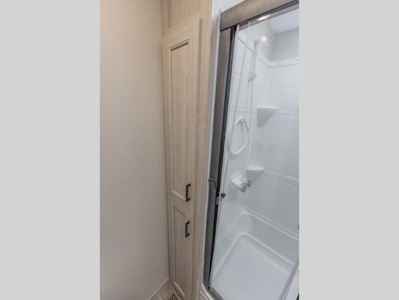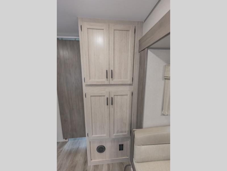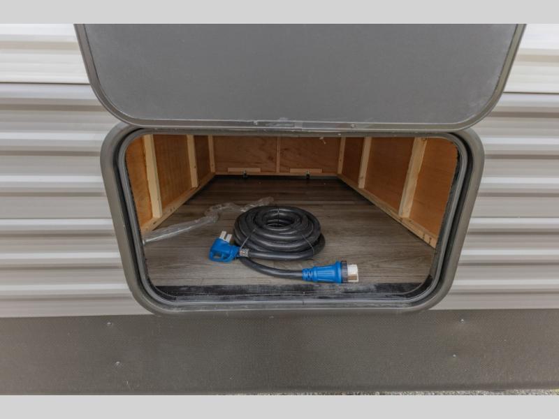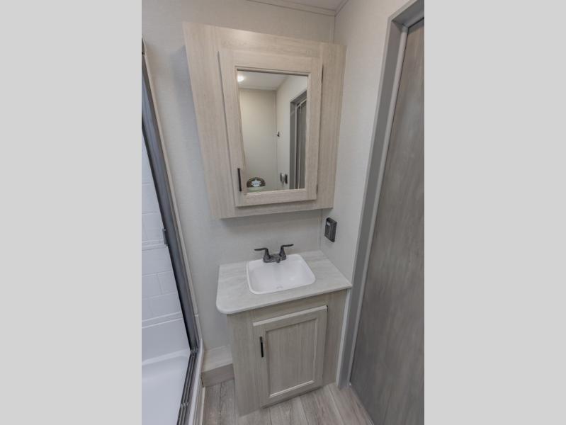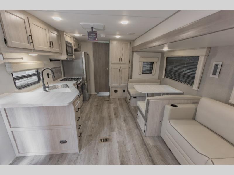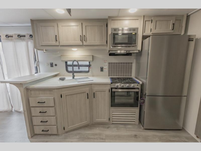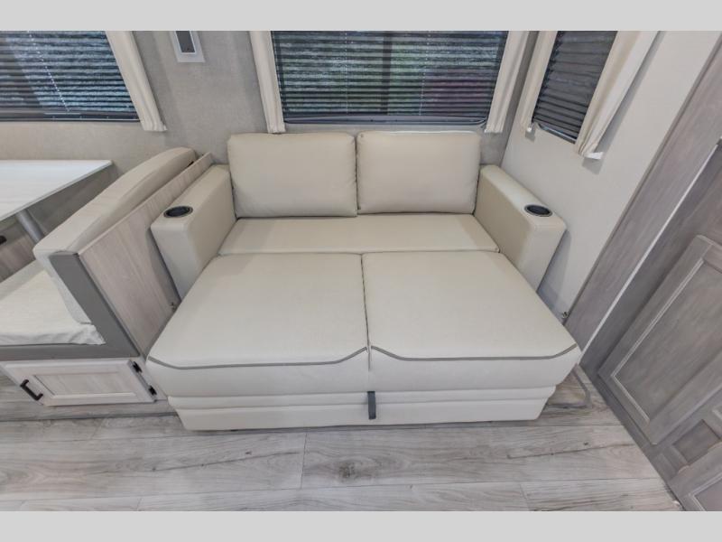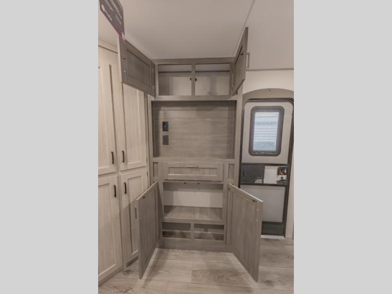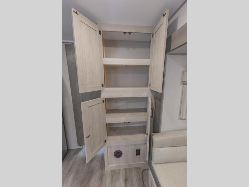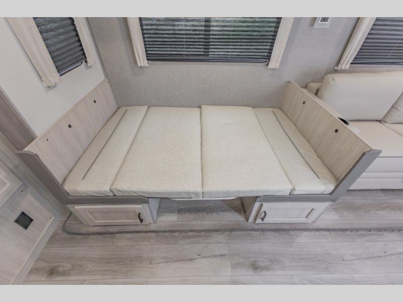This is the perfect trailer to enjoy long vacations with friends and family. The rear bunkhouse includes a jackknife sofa and flip-up bunk within a slide out, plus storage totes beneath the sofa and a loft bed/bunk across the room. When you want to do a little entertaining, the main living area will be the perfect spot to do so with its tri-fold sofa, booth dinette, and entertainment center with a fireplace. You might even want to choose the theater seating option if you prefer.. The private front bedroom with its own exterior entry door features a queen bed slide out as a nice retreat, and with a separate entry door you can easily slip out for late-night star gazing, a quiet evening out under the optional 21' patio awning, or an early morning walk. And you might want to add the optional full size camp kitchen outside if you enjoy cooking outdoors!