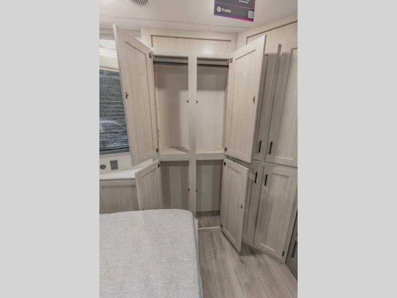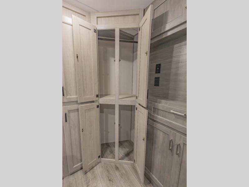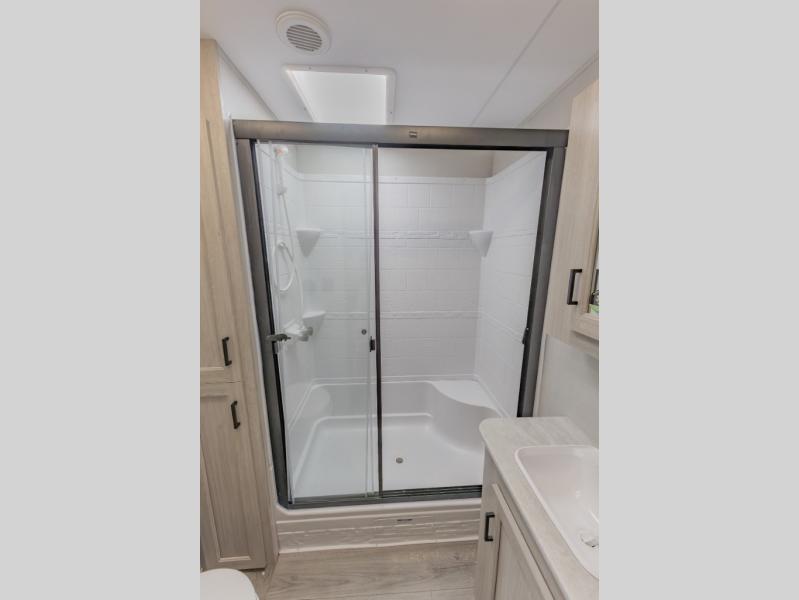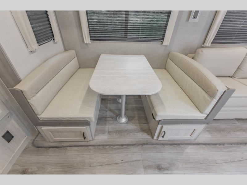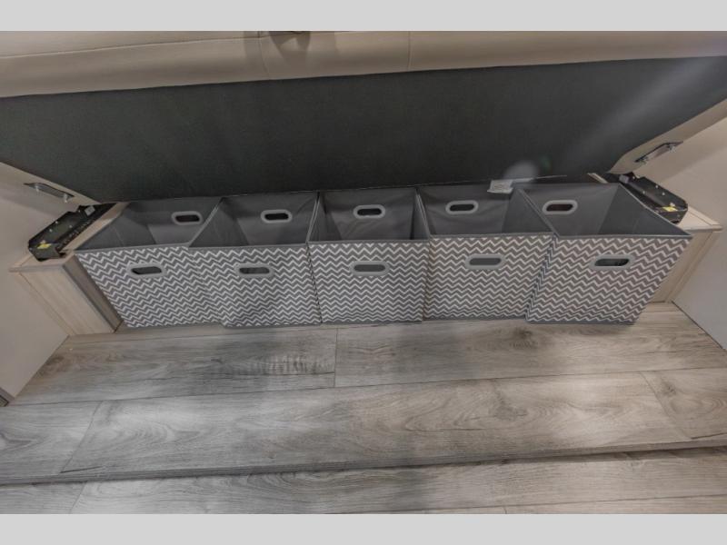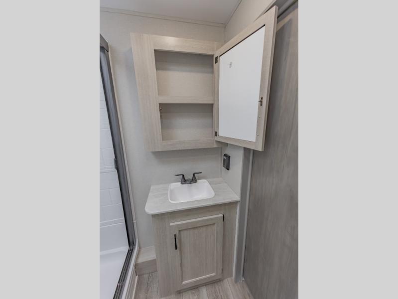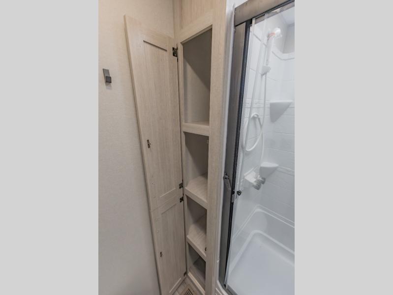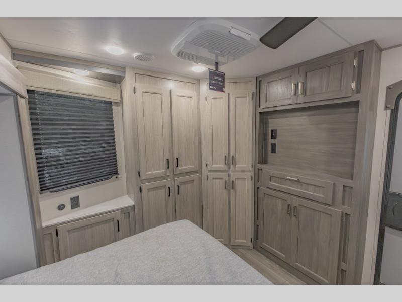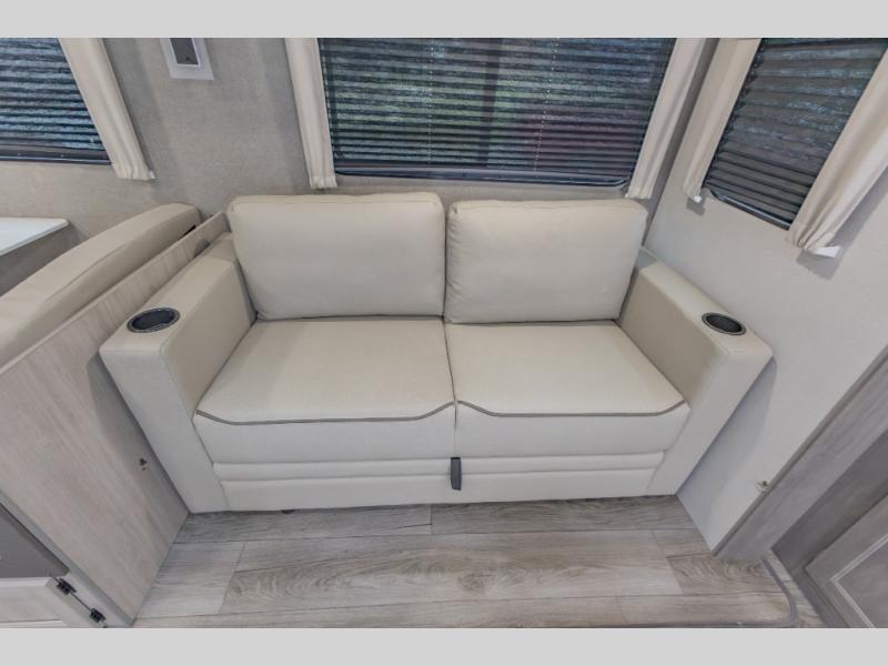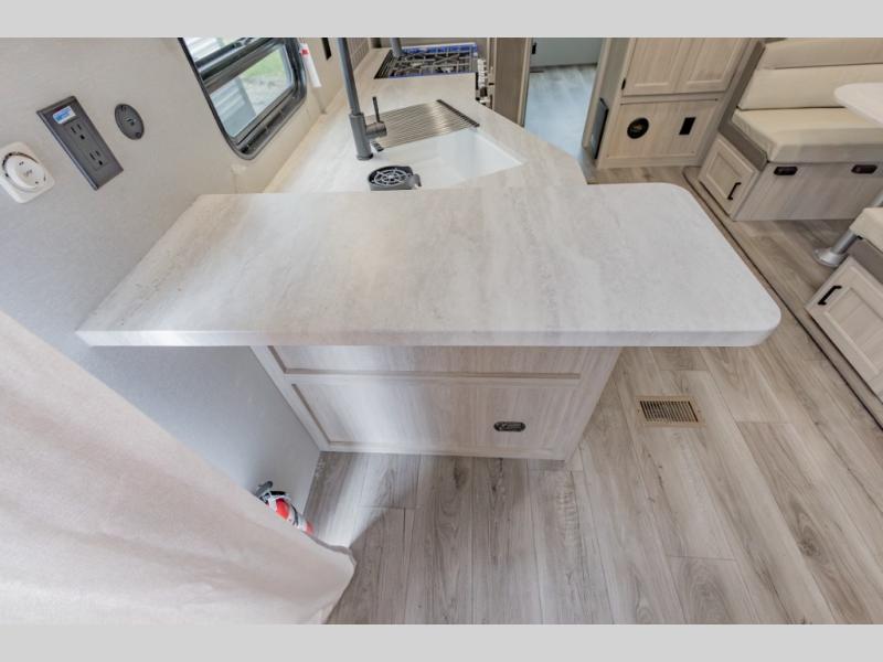 This is the perfect trailer to enjoy long vacations with friends and family. The rear bunkhouse includes a jackknife sofa and flip-up bunk within a slide out, plus storage totes beneath the sofa and a loft bed/bunk across the room. When you want to do a little entertaining, the main living area will be the perfect spot to do so with its tri-fold sofa, booth dinette, and entertainment center with a fireplace. You might even want to choose the theater seating option if you prefer.. The private front bedroom with its own exterior entry door features a queen bed slide out as a nice retreat, and with a separate entry door you can easily slip out for late-night star gazing, a quiet evening out under the optional 21' patio awning, or an early morning walk. And you might want to add the optional full size camp kitchen outside if you enjoy cooking outdoors!