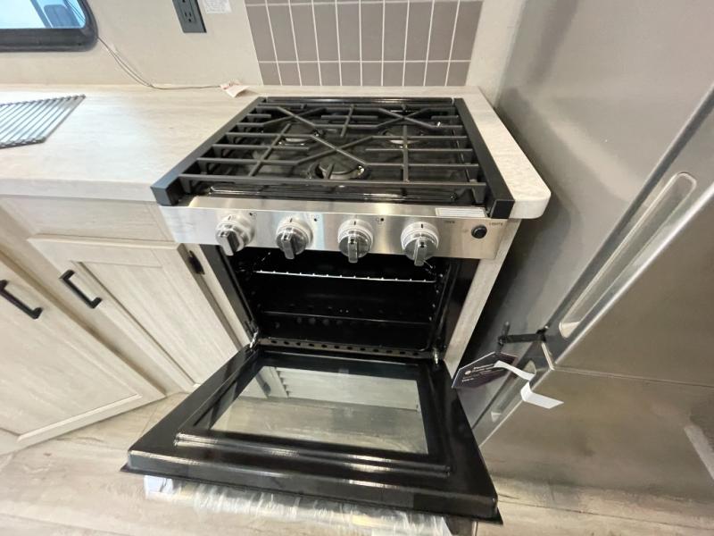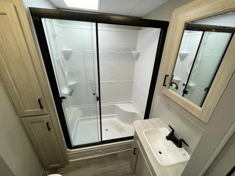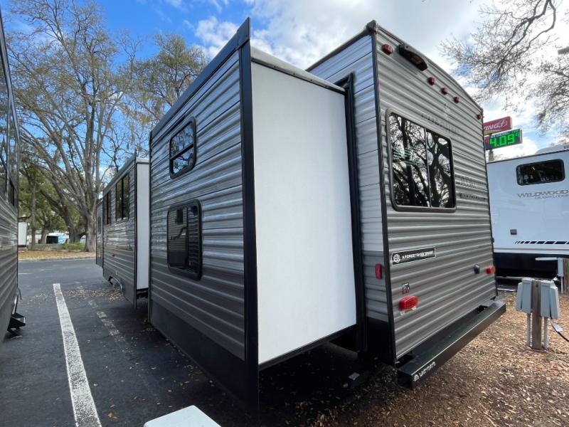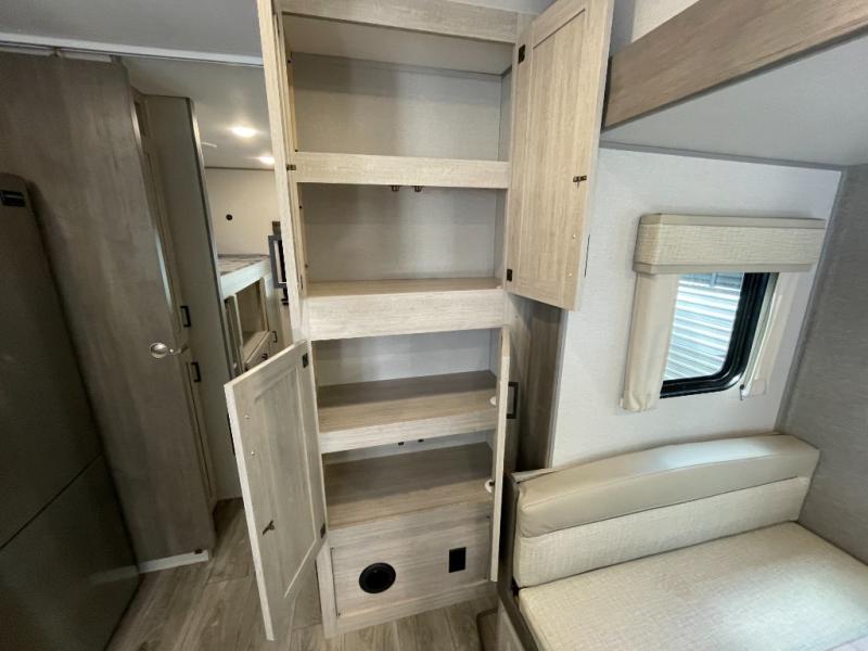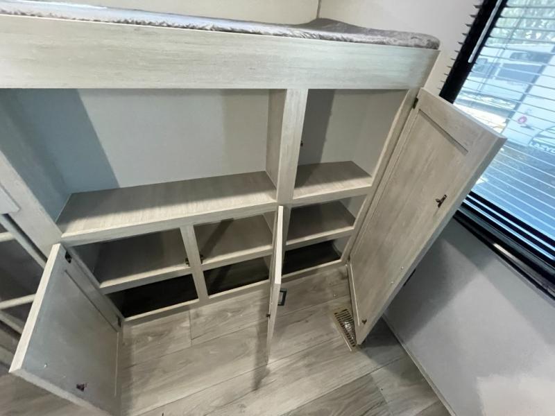 This is the perfect trailer to enjoy long vacations with friends and family. The rear bunkhouse includes a jackknife sofa and flip-up bunk within a slide out, plus storage totes beneath the sofa and a loft bed/bunk across the room. When you want to do a little entertaining, the main living area will be the perfect spot to do so with its tri-fold sofa, booth dinette, and entertainment center with a fireplace. You might even want to choose the theater seating option if you prefer.. The private front bedroom with its own exterior entry door features a queen bed slide out as a nice retreat, and with a separate entry door you can easily slip out for late-night star gazing, a quiet evening out under the optional 21' patio awning, or an early morning walk. And you might want to add the optional full size camp kitchen outside if you enjoy cooking outdoors!