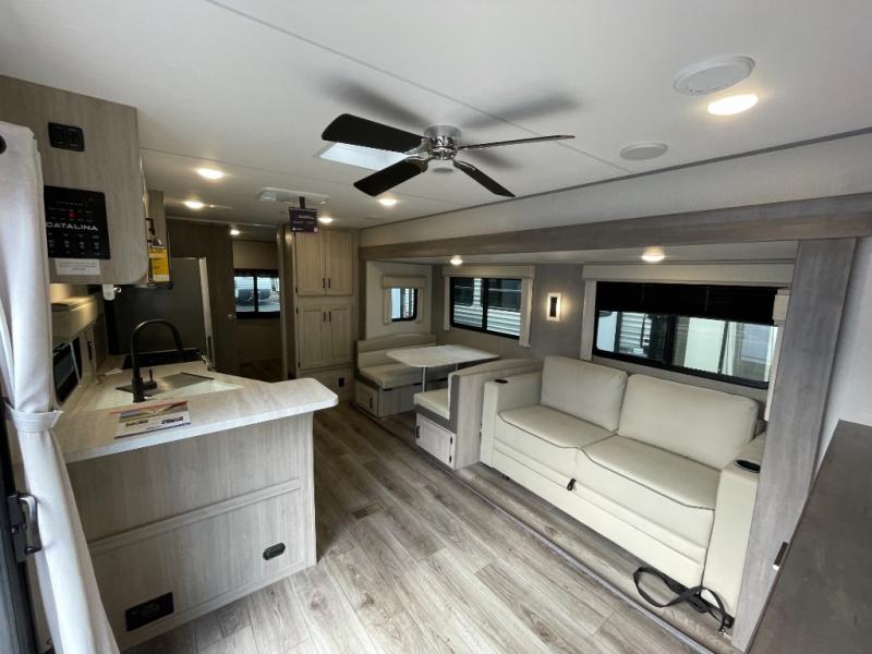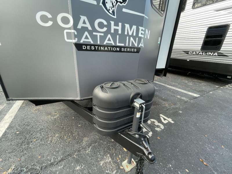 With any Catalina Destination trailer by Coachmen, you will enjoy comfortable extended stays wherever you decide to set up camp! The full length frame outriggers add strength to each unit, along with a seamless Alpha Roof membrane and Norco electromagnetic, powder coated chassis. You will love the open views provided by the large front bay windows, plus there are GE appliances, woodplank linoleum flooring, and hard valance window treatments to make your space feel more like home. Head outside to find a convenient "Leash Link" quick hookup D-ring for your furry friends, premium JBL exterior speakers, flush mount baggage doors for your gear, and the list of amenities goes on!