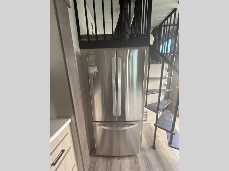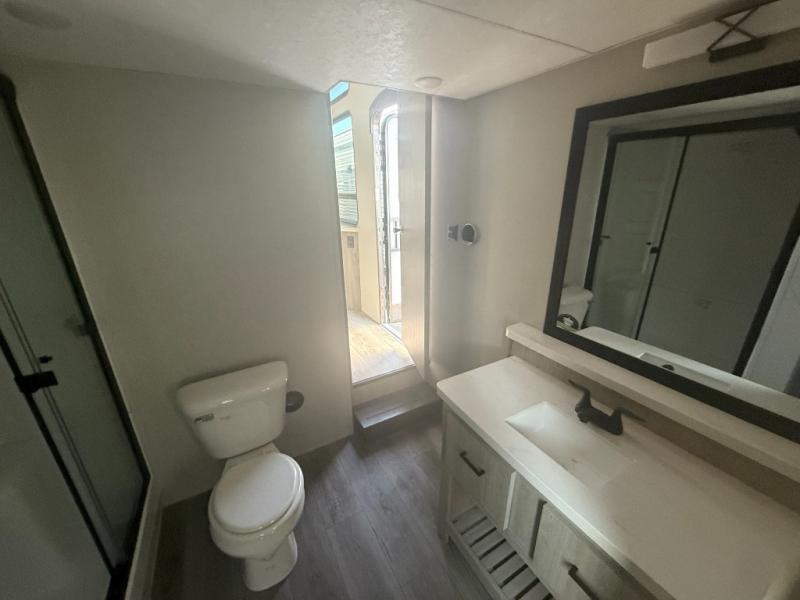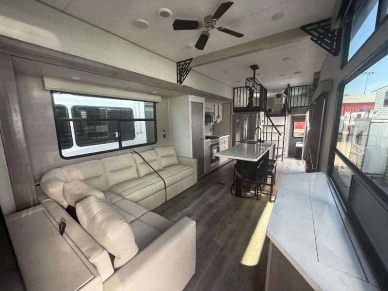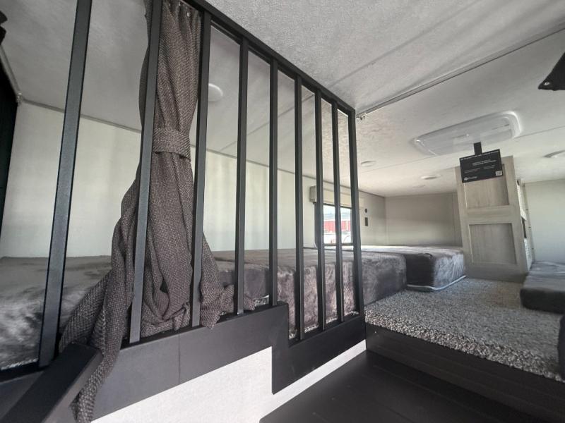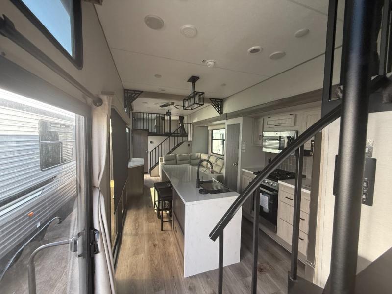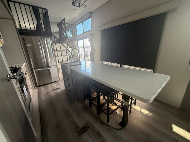 This unit with dual lofts and tons of sleeping space is ideal for a larger group! Lofts at either end of the unit overlook the living area and have a total of five bunk mats, with four 42" x 74" and one smaller 28" x 74". Downstairs there's a private bedroom with a queen bed and fireplace. The main living area has a huge hide-a-bed sectional sofa so you can fit even more guests, or just relax and watch the TV on the power lift in the entertainment center. The kitchen is well-equipped with a residential refrigerator, microwave, and pantry. The centerpiece here is a kitchen island with a deep basin farm-style sink and bar stool seating so your group can gather together and make new memories! The full bath in the rear has a roomy 48" x 30" shower with glass door, and a linen closet.