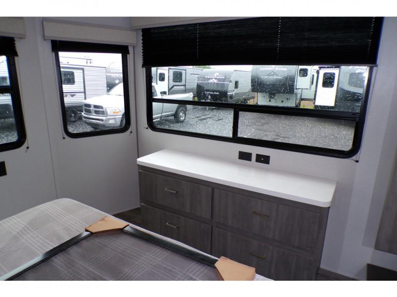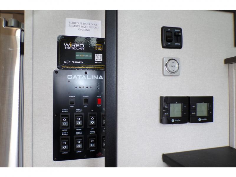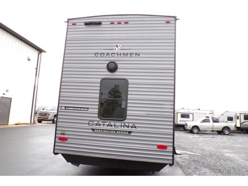 With any Catalina Destination trailer by Coachmen, you will enjoy comfortable extended stays wherever you decide to set up camp! The full length frame outriggers add strength to each unit, along with a seamless Alpha Roof membrane and Norco electromagnetic, powder coated chassis. You will love the open views provided by the large front bay windows, plus there are GE appliances, woodplank linoleum flooring, and hard valance window treatments to make your space feel more like home. Head outside to find a convenient "Leash Link" quick hookup D-ring for your furry friends, premium JBL exterior speakers, flush mount baggage doors for your gear, and the list of amenities goes on!