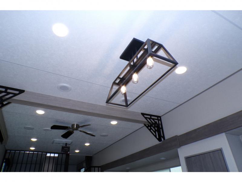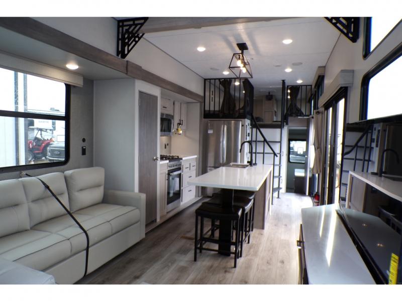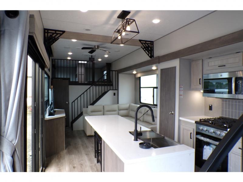 This unit with dual lofts and tons of sleeping space is ideal for a larger group! Lofts at either end of the unit overlook the living area and have a total of five bunk mats, with four 42" x 74" and one smaller 28" x 74". Downstairs there's a private bedroom with a queen bed and fireplace. The main living area has a huge hide-a-bed sectional sofa so you can fit even more guests, or just relax and watch the TV on the power lift in the entertainment center. The kitchen is well-equipped with a residential refrigerator, microwave, and pantry. The centerpiece here is a kitchen island with a deep basin farm-style sink and bar stool seating so your group can gather together and make new memories! The full bath in the rear has a roomy 48" x 30" shower with glass door, and a linen closet.