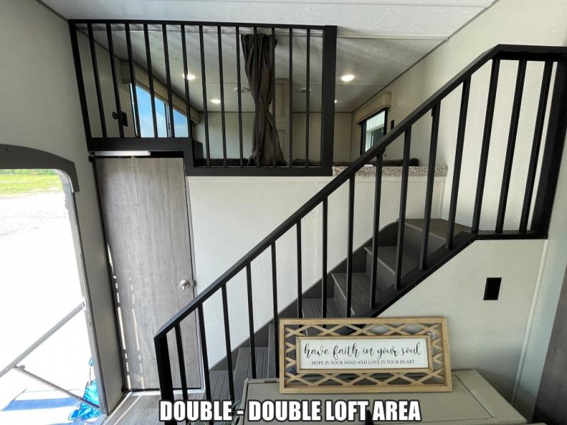 This unit with dual lofts and tons of sleeping space is ideal for a larger group! Lofts at either end of the unit overlook the living area and have a total of five bunk mats, with four 42" x 74" and one smaller 28" x 74". Downstairs there's a private bedroom with a queen bed and fireplace. The main living area has a huge hide-a-bed sectional sofa so you can fit even more guests, or just relax and watch the TV on the power lift in the entertainment center. The kitchen is well-equipped with a residential refrigerator, microwave, and pantry. The centerpiece here is a kitchen island with a deep basin farm-style sink and bar stool seating so your group can gather together and make new memories! The full bath in the rear has a roomy 48" x 30" shower with glass door, and a linen closet.