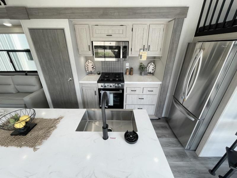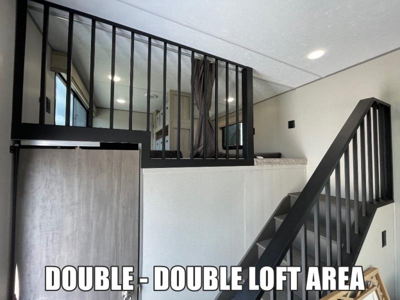 This unit with dual lofts and tons of sleeping space is ideal for a larger group! Lofts at either end of the unit overlook the living area and have a total of five bunk mats, with four 42" x 74" and one smaller 28" x 74". Downstairs there's a private bedroom with a queen bed and fireplace. The main living area has a huge hide-a-bed sectional sofa so you can fit even more guests, or just relax and watch the TV on the power lift in the entertainment center. The kitchen is well-equipped with a residential refrigerator, microwave, and pantry. The centerpiece here is a kitchen island with a deep basin farm-style sink and bar stool seating so your group can gather together and make new memories! The full bath in the rear has a roomy 48" x 30" shower with glass door, and a linen closet.