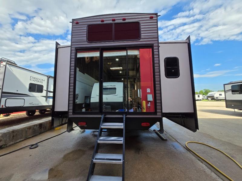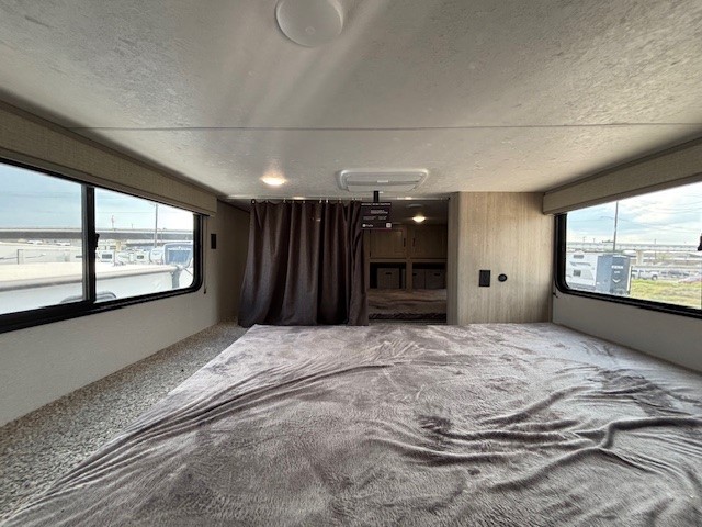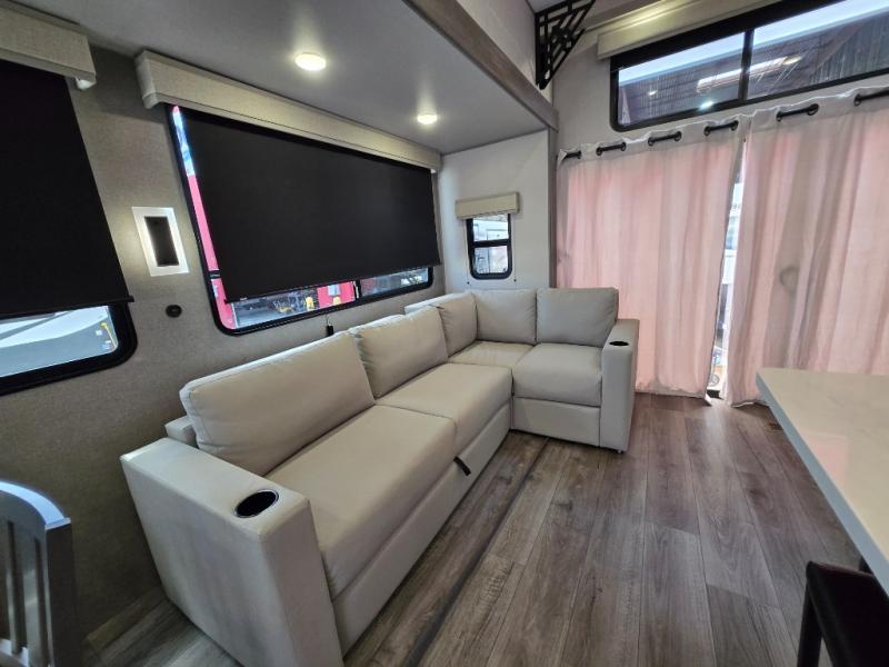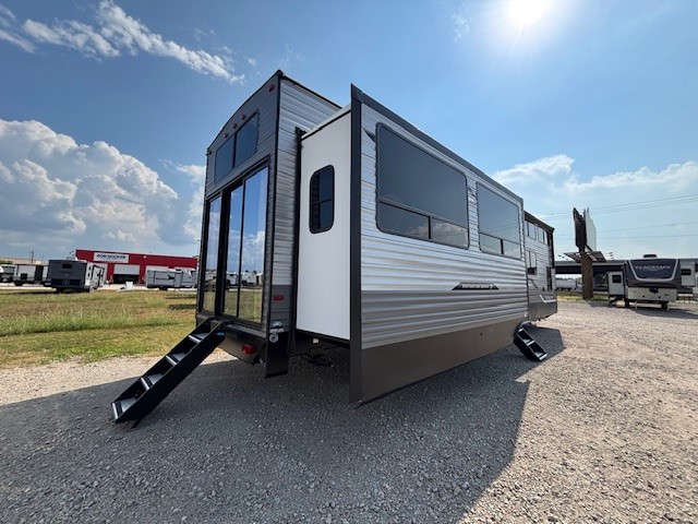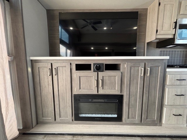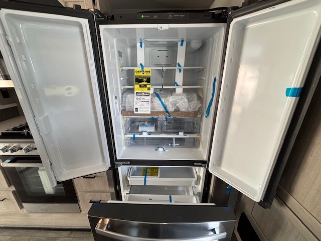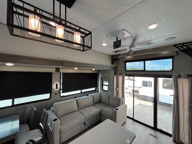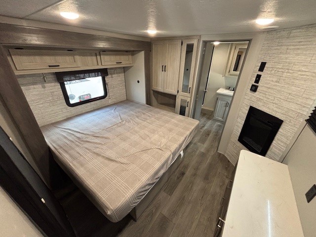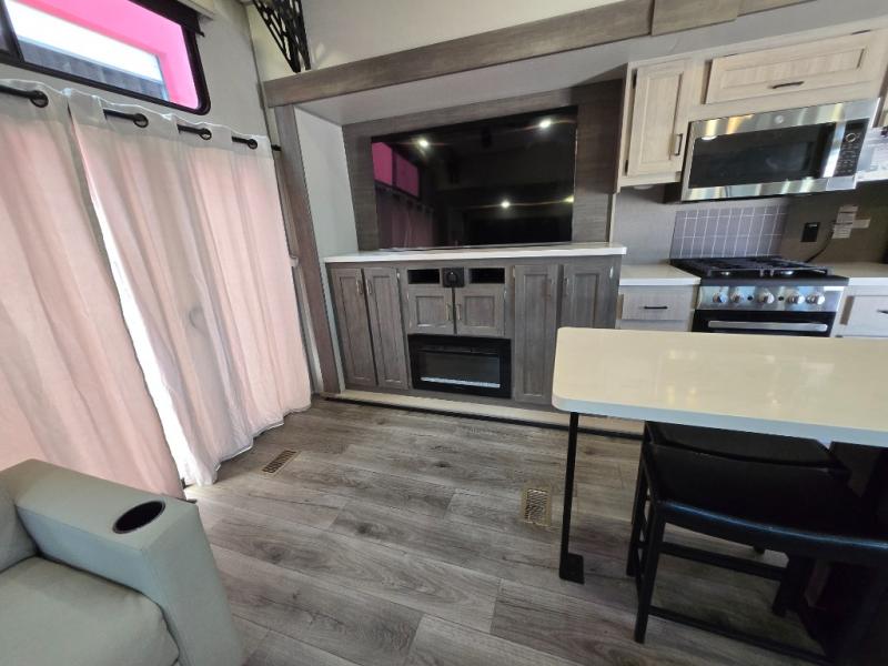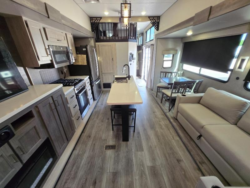 There is much to love about this destination trailer! Starting with the loft that has two queen beds, a wardrobe/storage, and a custom 58" x 71" bed. Downstairs there's a private bedroom with a king bed slide, a fireplace, and its very own private full bathroom complete with a dual sink vanity. The main living area has a huge bi-fold sleeper sectional sofa so you can fit even more guests, or just relax and watch the TV on the power lift in the entertainment center. The kitchen is well-equipped with a residential refrigerator, microwave, and pantry. The centerpiece here is a kitchen island with a deep basin farm-style sink and bar stool seating so your group can gather together and make new memories. The second full bath has a roomy 36" x 30" shower with glass door, and just outside it is the stackable washer and dryer!