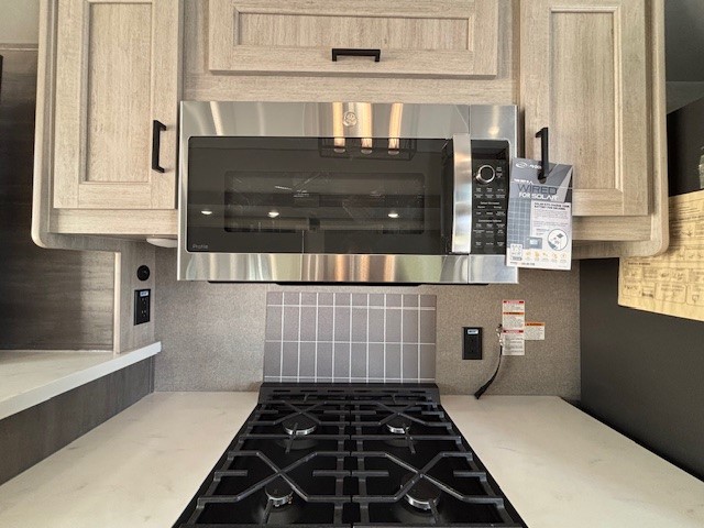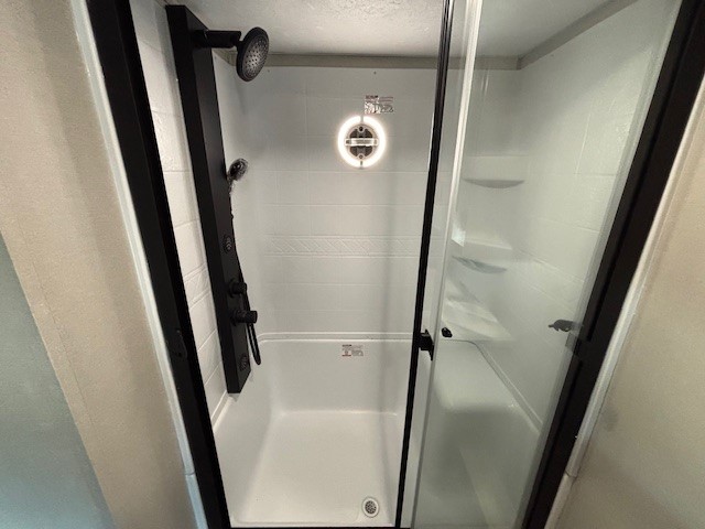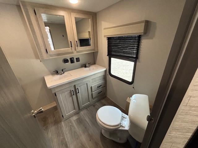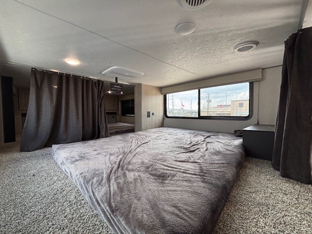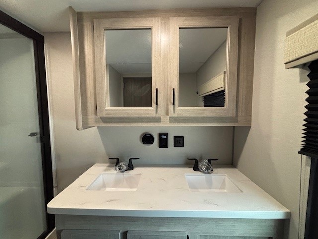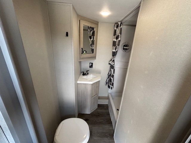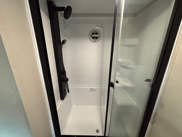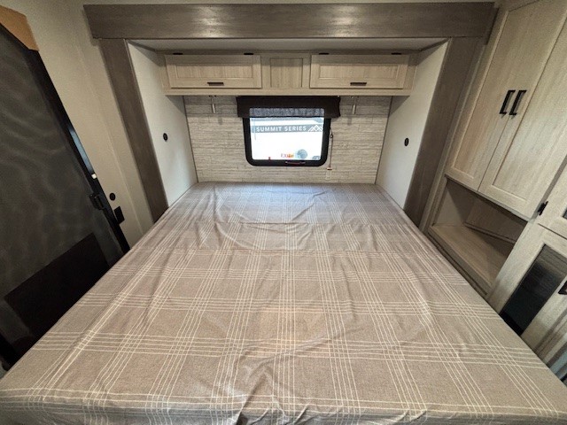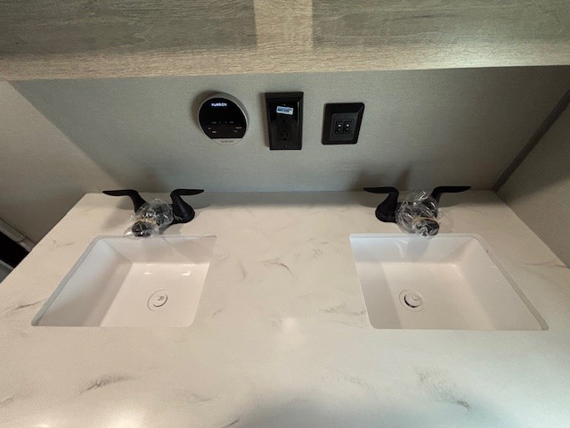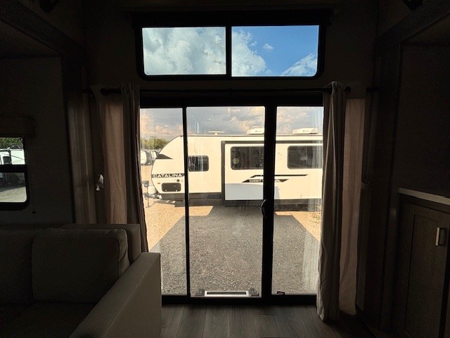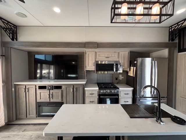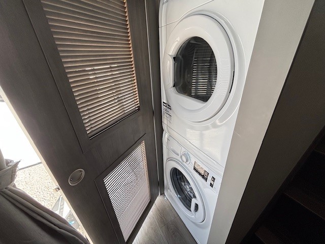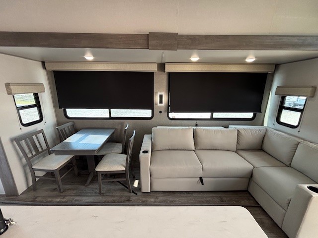 There is much to love about this destination trailer! Starting with the loft that has two queen beds, a wardrobe/storage, and a custom 58" x 71" bed. Downstairs there's a private bedroom with a king bed slide, a fireplace, and its very own private full bathroom complete with a dual sink vanity. The main living area has a huge bi-fold sleeper sectional sofa so you can fit even more guests, or just relax and watch the TV on the power lift in the entertainment center. The kitchen is well-equipped with a residential refrigerator, microwave, and pantry. The centerpiece here is a kitchen island with a deep basin farm-style sink and bar stool seating so your group can gather together and make new memories. The second full bath has a roomy 36" x 30" shower with glass door, and just outside it is the stackable washer and dryer!