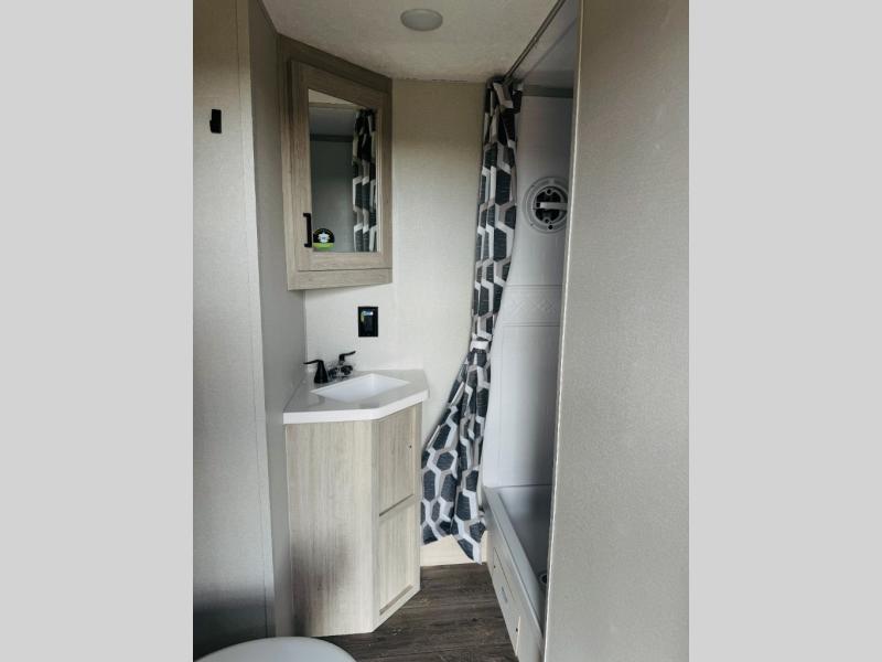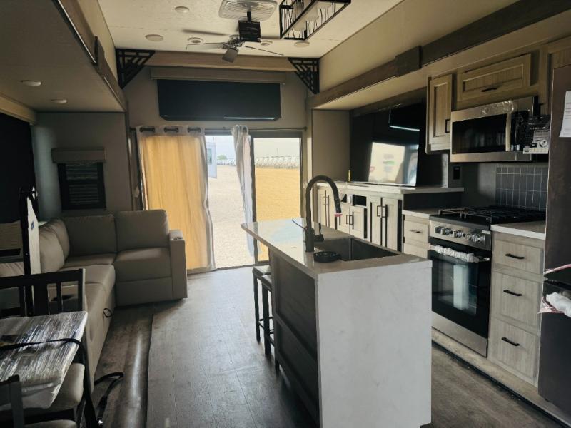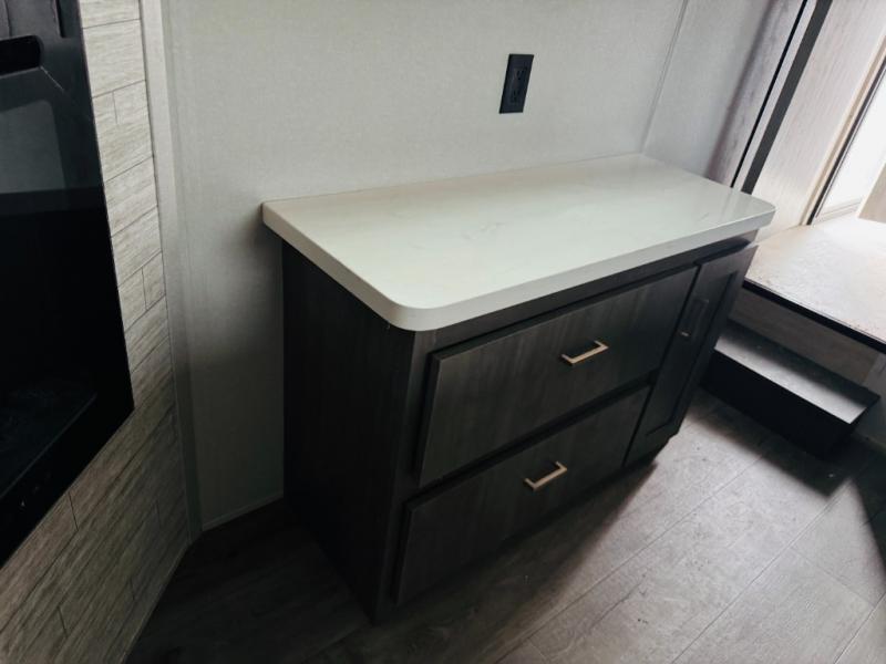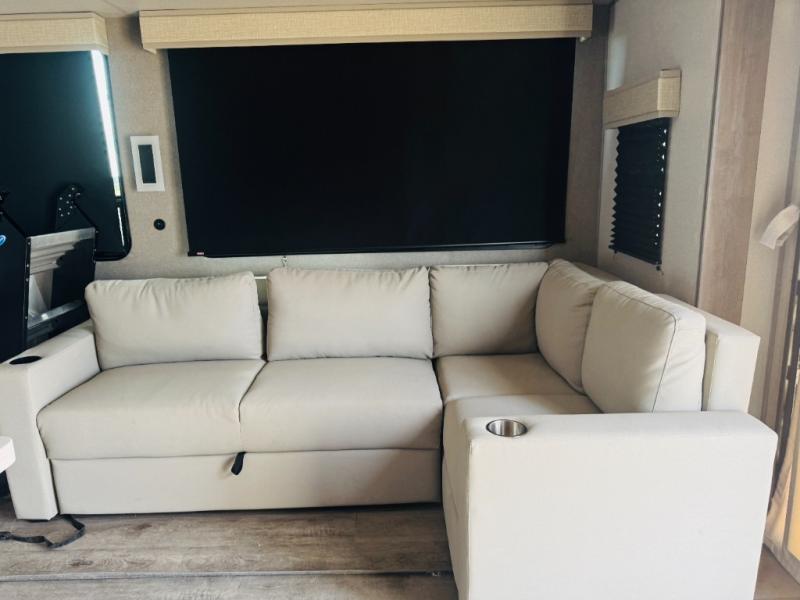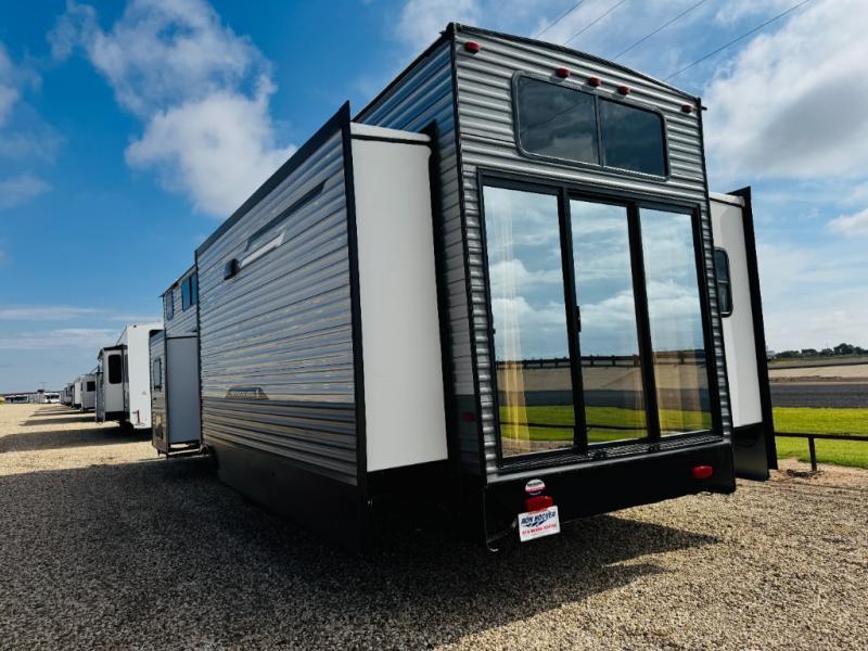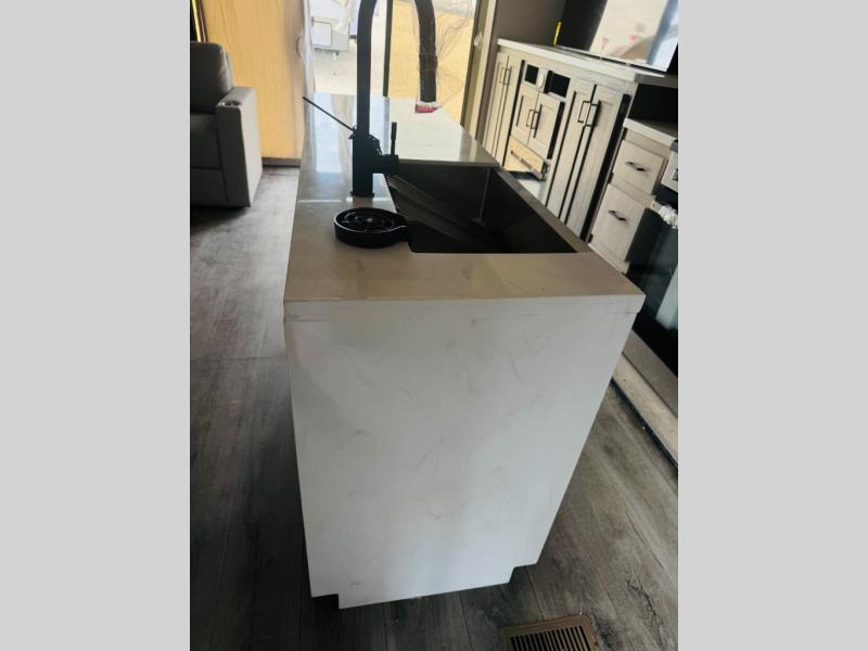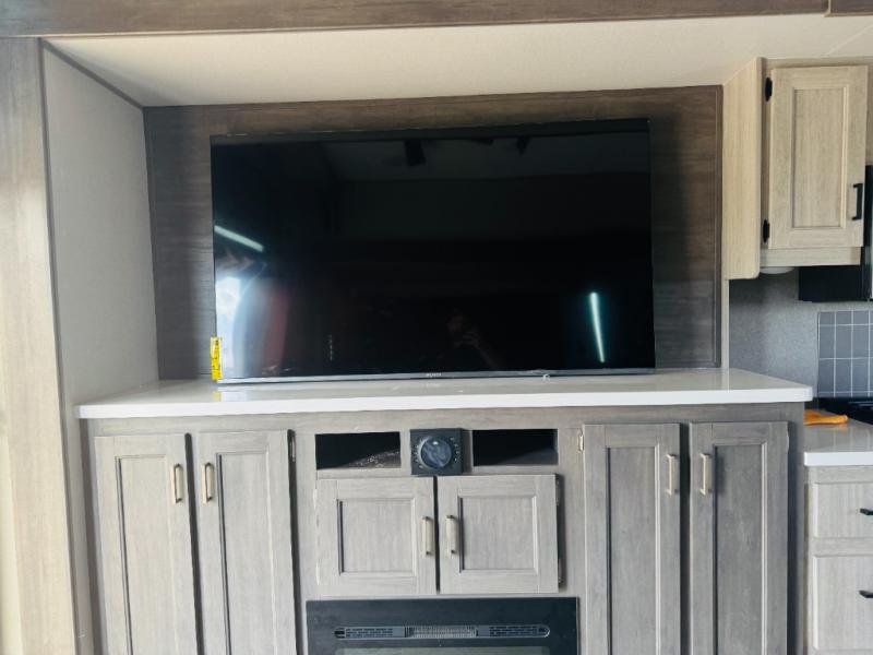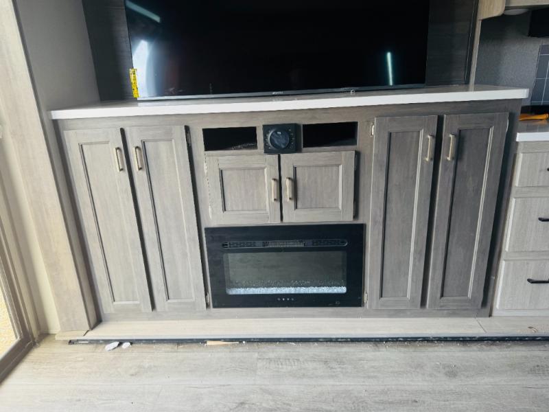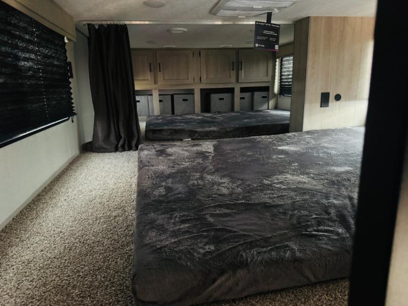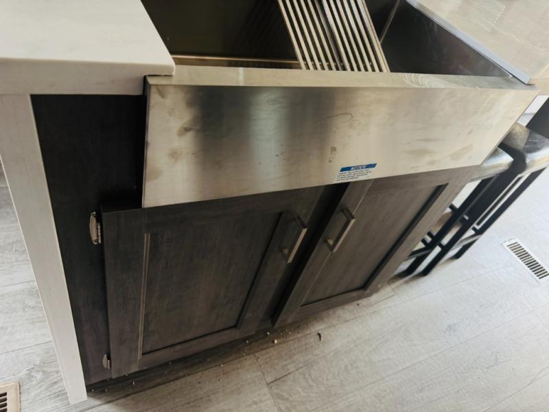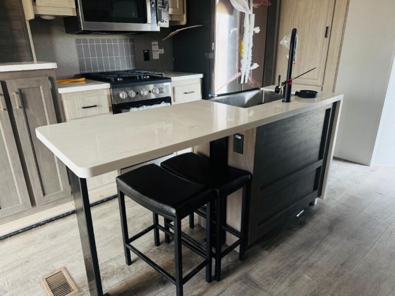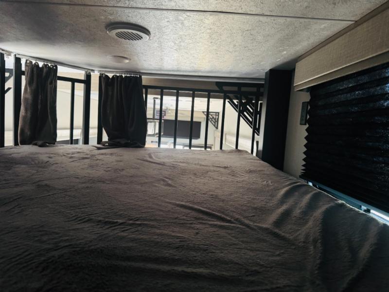 There is much to love about this destination trailer! Starting with the loft that has two queen beds, a wardrobe/storage, and a custom 58" x 71" bed. Downstairs there's a private bedroom with a king bed slide, a fireplace, and its very own private full bathroom complete with a dual sink vanity. The main living area has a huge bi-fold sleeper sectional sofa so you can fit even more guests, or just relax and watch the TV on the power lift in the entertainment center. The kitchen is well-equipped with a residential refrigerator, microwave, and pantry. The centerpiece here is a kitchen island with a deep basin farm-style sink and bar stool seating so your group can gather together and make new memories. The second full bath has a roomy 36" x 30" shower with glass door, and just outside it is the stackable washer and dryer!