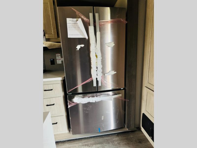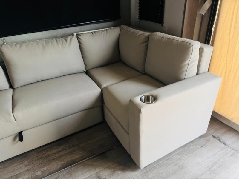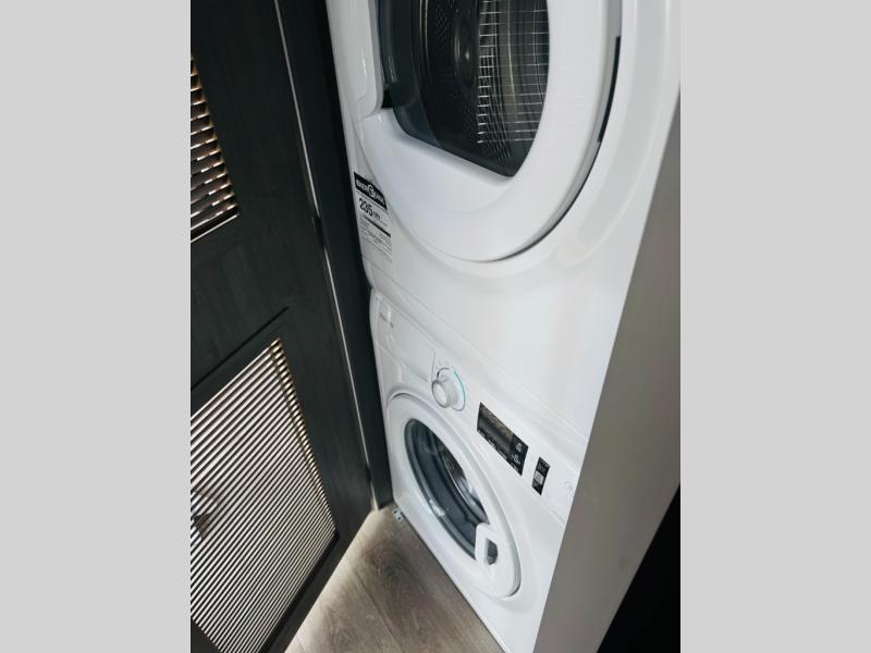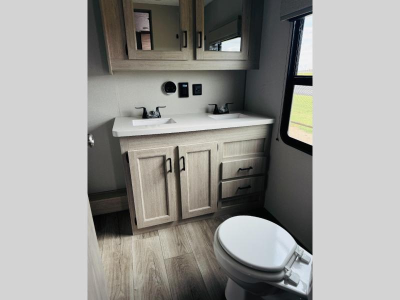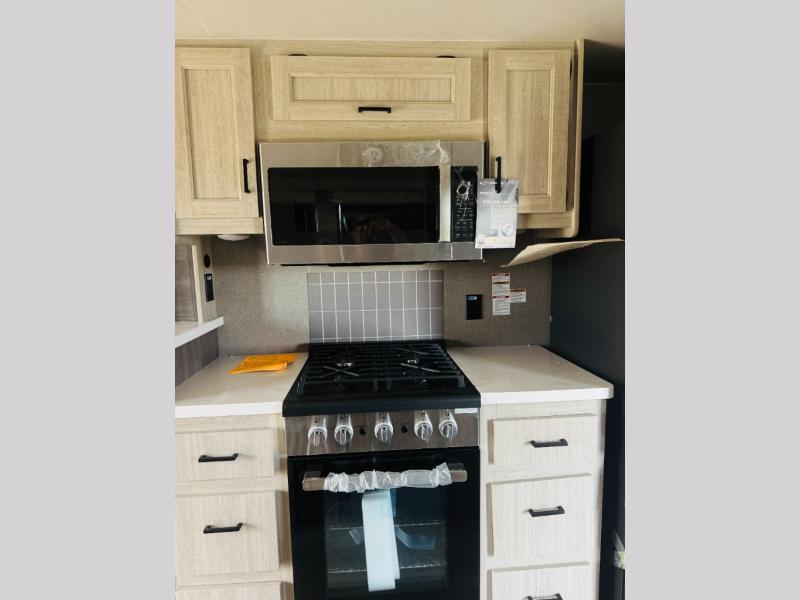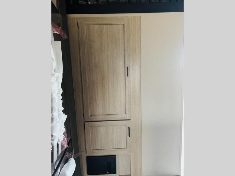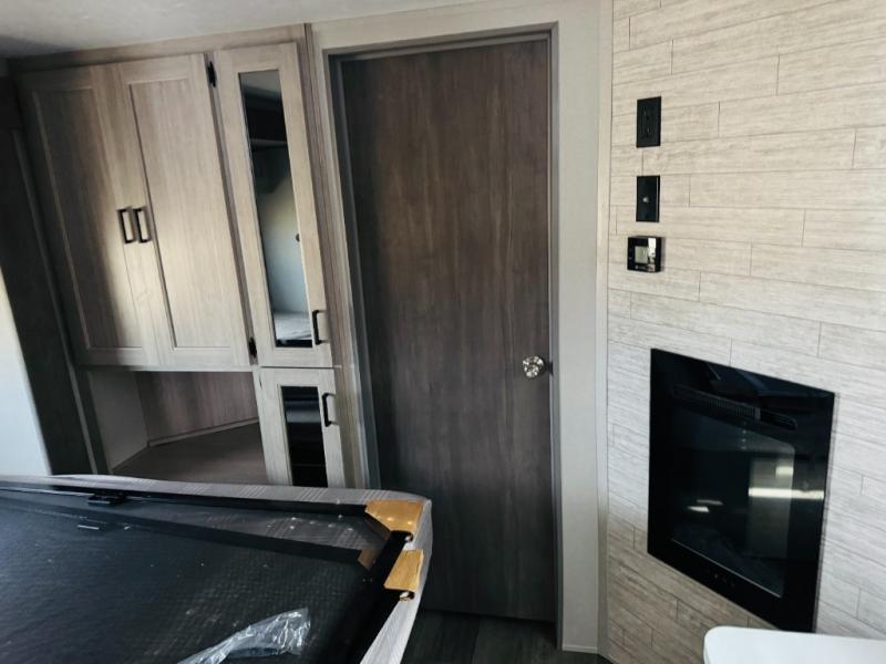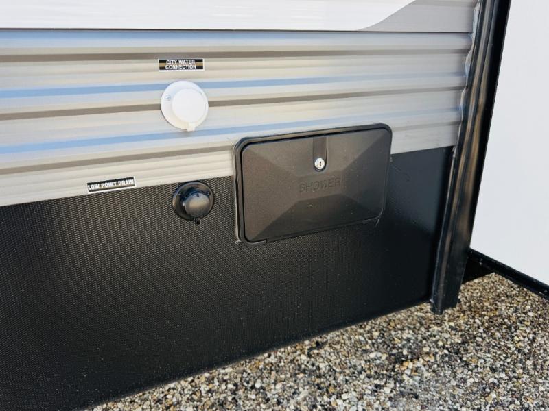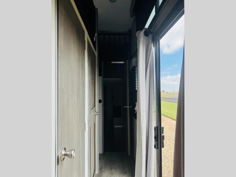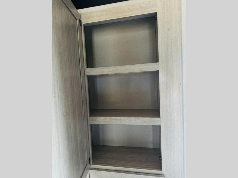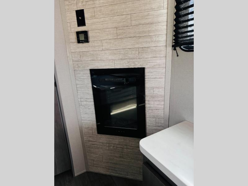 There is much to love about this destination trailer! Starting with the loft that has two queen beds, a wardrobe/storage, and a custom 58" x 71" bed. Downstairs there's a private bedroom with a king bed slide, a fireplace, and its very own private full bathroom complete with a dual sink vanity. The main living area has a huge bi-fold sleeper sectional sofa so you can fit even more guests, or just relax and watch the TV on the power lift in the entertainment center. The kitchen is well-equipped with a residential refrigerator, microwave, and pantry. The centerpiece here is a kitchen island with a deep basin farm-style sink and bar stool seating so your group can gather together and make new memories. The second full bath has a roomy 36" x 30" shower with glass door, and just outside it is the stackable washer and dryer!