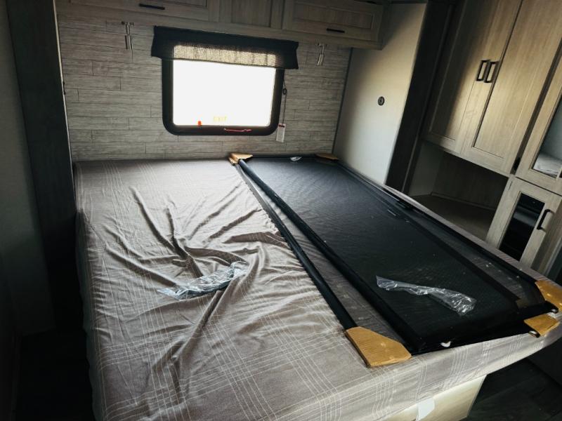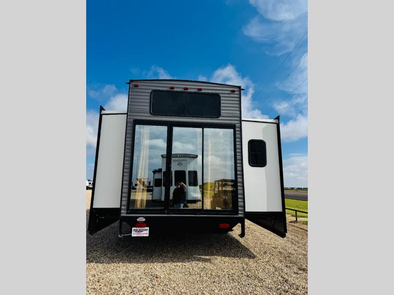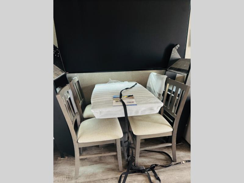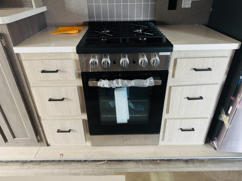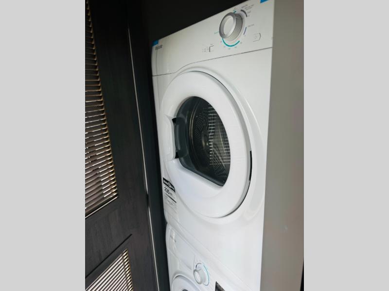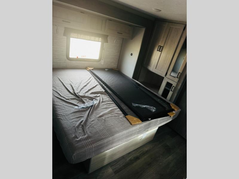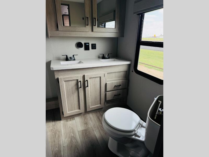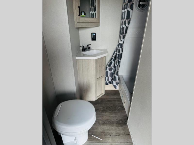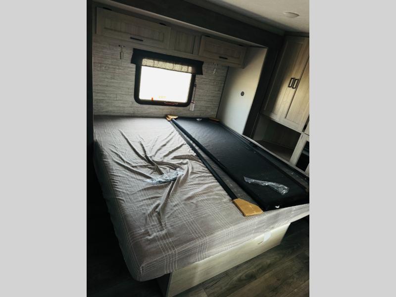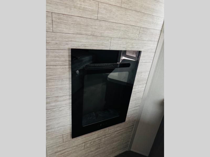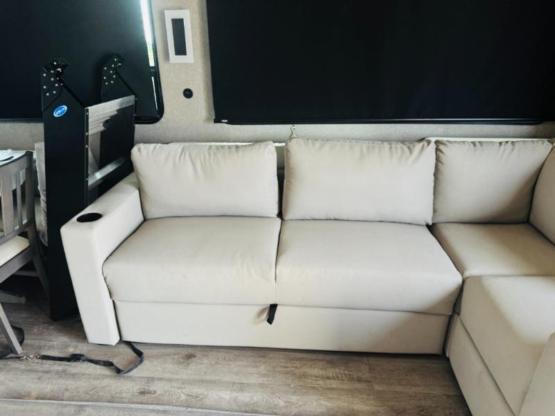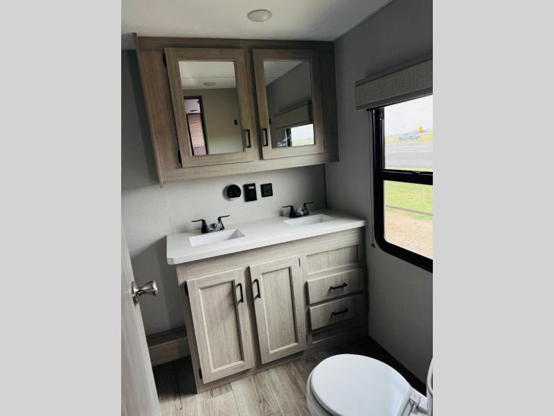 There is much to love about this destination trailer! Starting with the loft that has two queen beds, a wardrobe/storage, and a custom 58" x 71" bed. Downstairs there's a private bedroom with a king bed slide, a fireplace, and its very own private full bathroom complete with a dual sink vanity. The main living area has a huge bi-fold sleeper sectional sofa so you can fit even more guests, or just relax and watch the TV on the power lift in the entertainment center. The kitchen is well-equipped with a residential refrigerator, microwave, and pantry. The centerpiece here is a kitchen island with a deep basin farm-style sink and bar stool seating so your group can gather together and make new memories. The second full bath has a roomy 36" x 30" shower with glass door, and just outside it is the stackable washer and dryer!