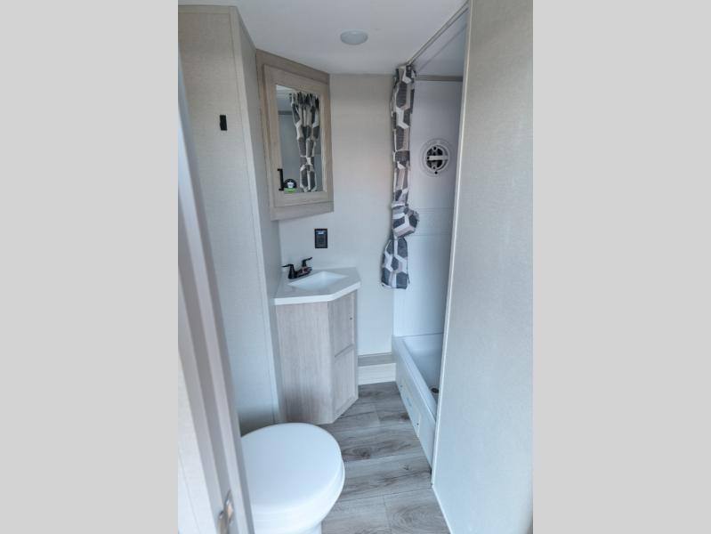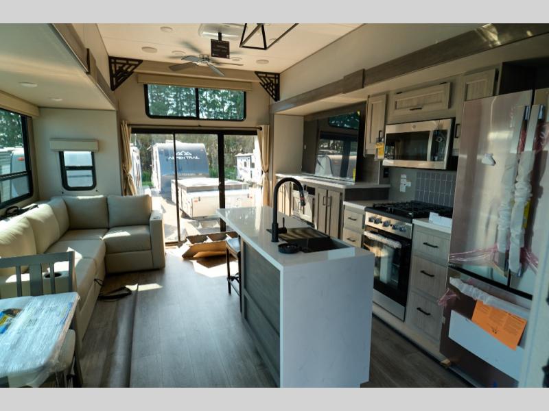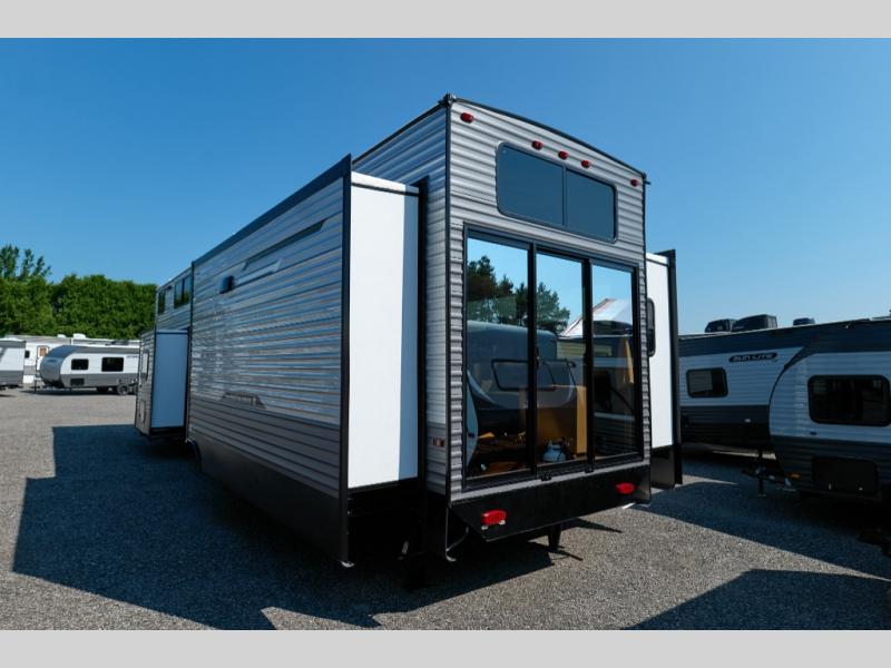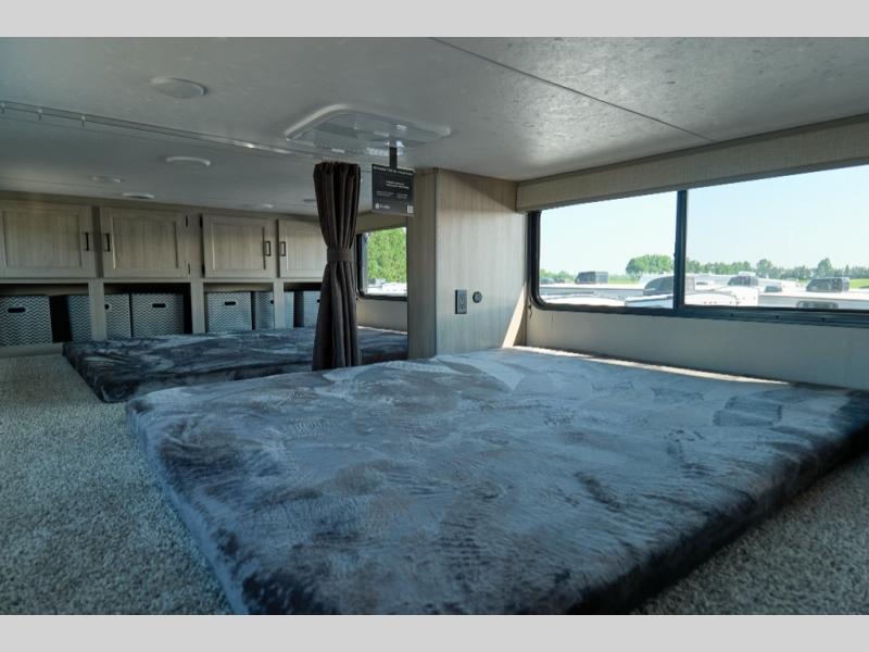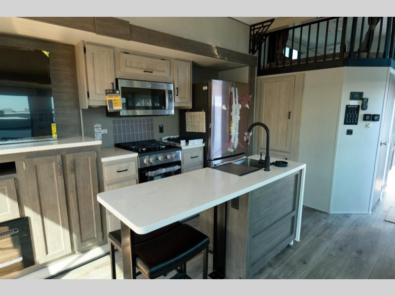 There is much to love about this destination trailer! Starting with the loft that has two queen beds, a wardrobe/storage, and a custom 58" x 71" bed. Downstairs there's a private bedroom with a king bed slide, a fireplace, and its very own private full bathroom complete with a dual sink vanity. The main living area has a huge bi-fold sleeper sectional sofa so you can fit even more guests, or just relax and watch the TV on the power lift in the entertainment center. The kitchen is well-equipped with a residential refrigerator, microwave, and pantry. The centerpiece here is a kitchen island with a deep basin farm-style sink and bar stool seating so your group can gather together and make new memories. The second full bath has a roomy 36" x 30" shower with glass door, and just outside it is the stackable washer and dryer!