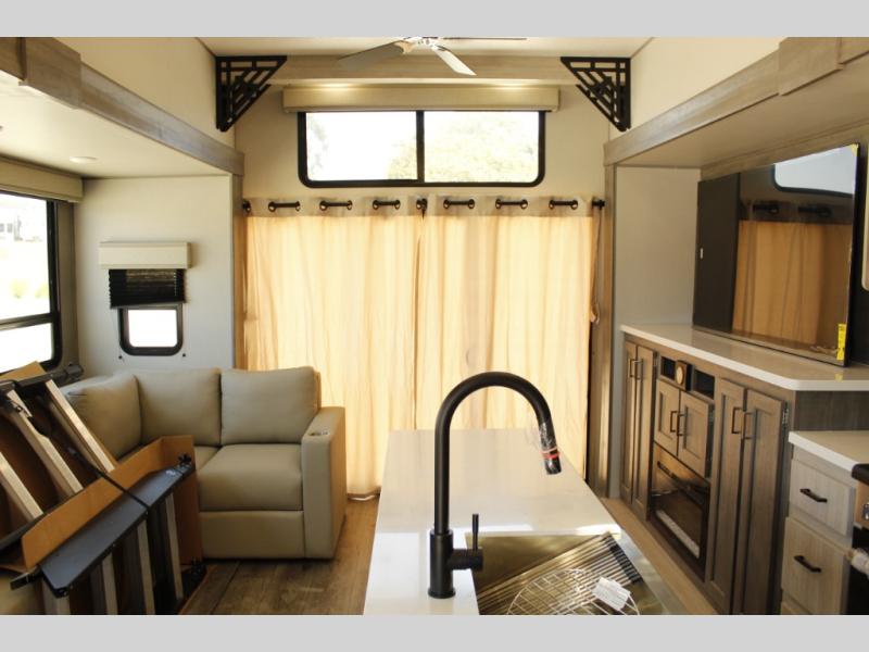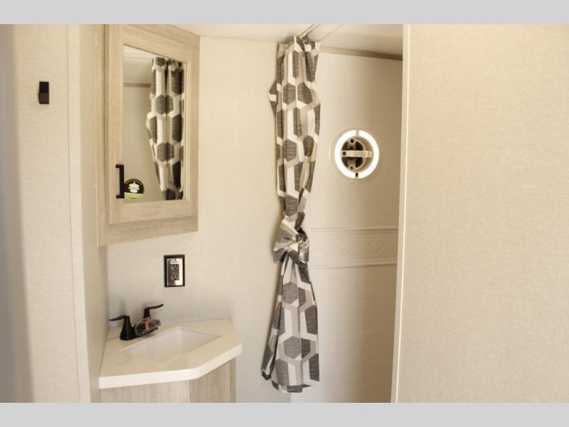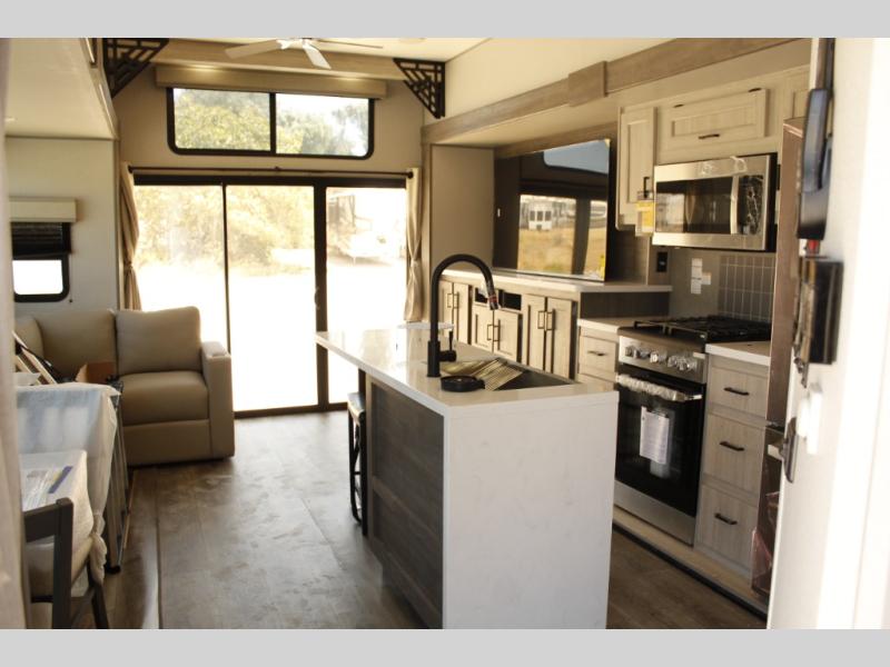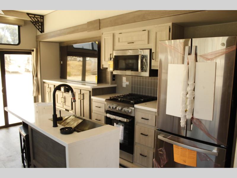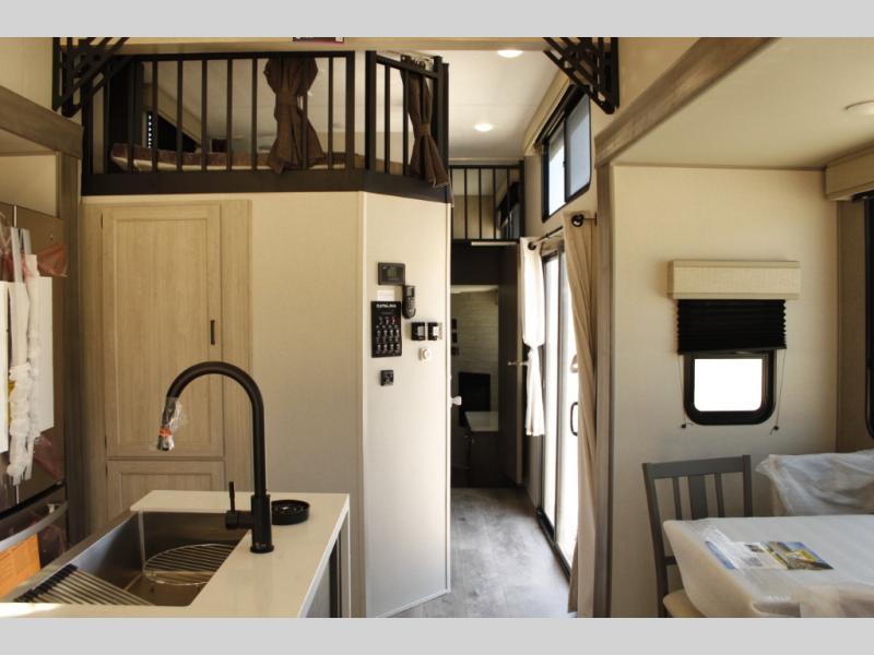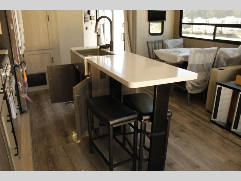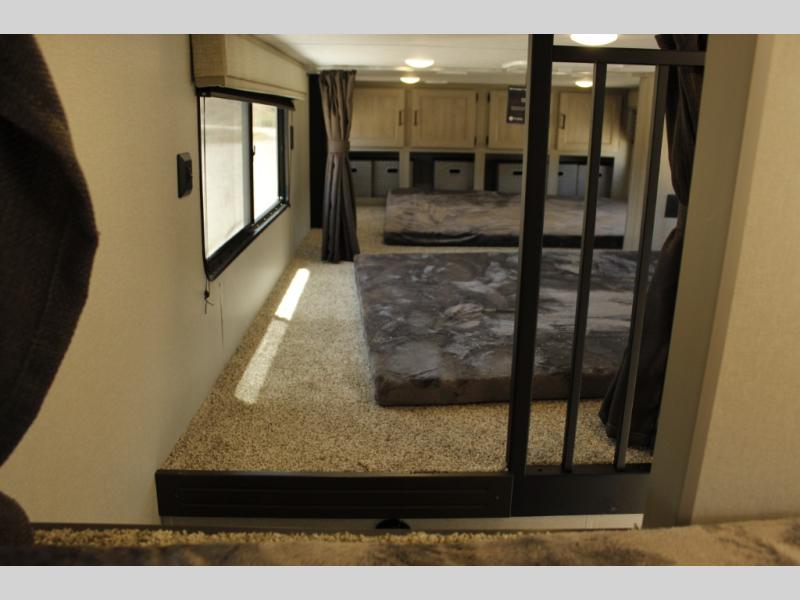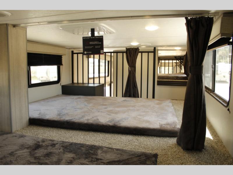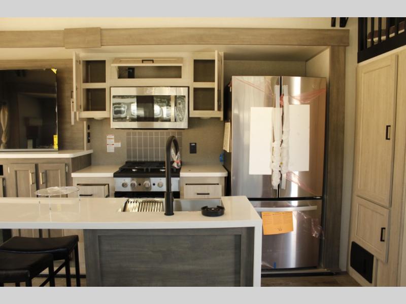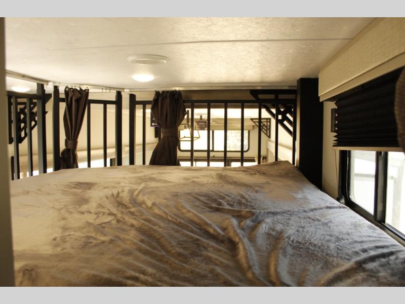 There is much to love about this destination trailer! Starting with the loft that has two queen beds, a wardrobe/storage, and a custom 58" x 71" bed. Downstairs there's a private bedroom with a king bed slide, a fireplace, and its very own private full bathroom complete with a dual sink vanity. The main living area has a huge bi-fold sleeper sectional sofa so you can fit even more guests, or just relax and watch the TV on the power lift in the entertainment center. The kitchen is well-equipped with a residential refrigerator, microwave, and pantry. The centerpiece here is a kitchen island with a deep basin farm-style sink and bar stool seating so your group can gather together and make new memories. The second full bath has a roomy 36" x 30" shower with glass door, and just outside it is the stackable washer and dryer!