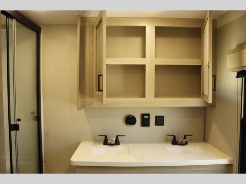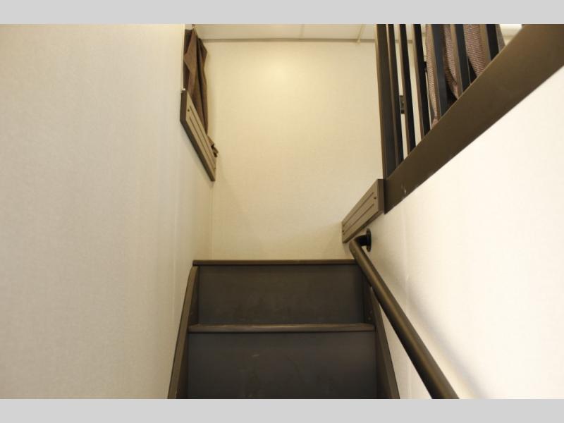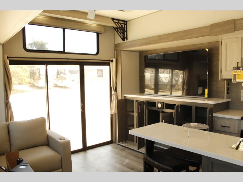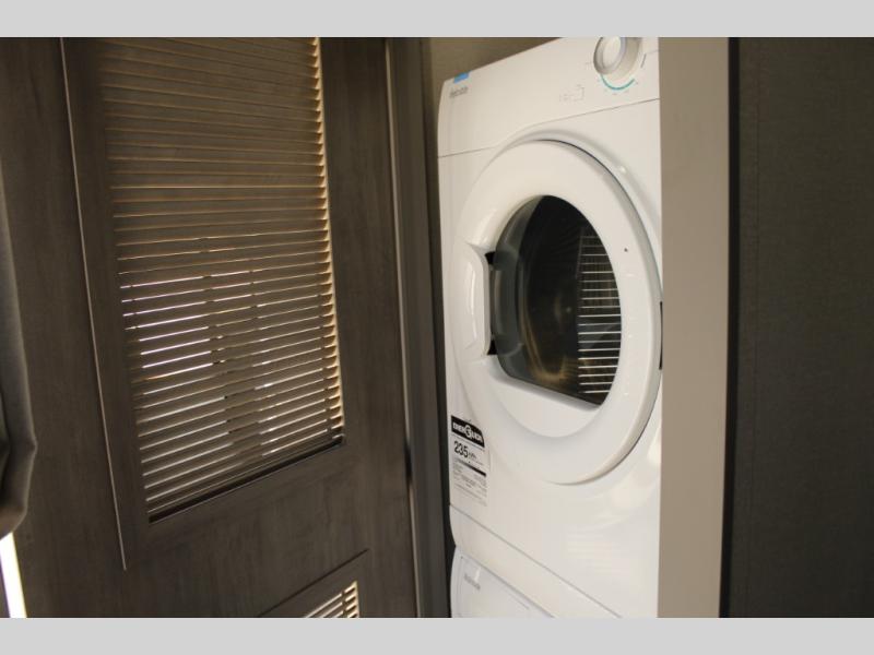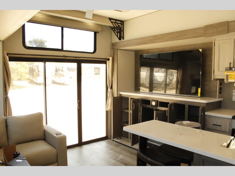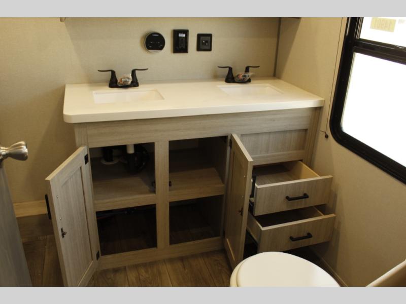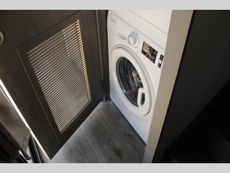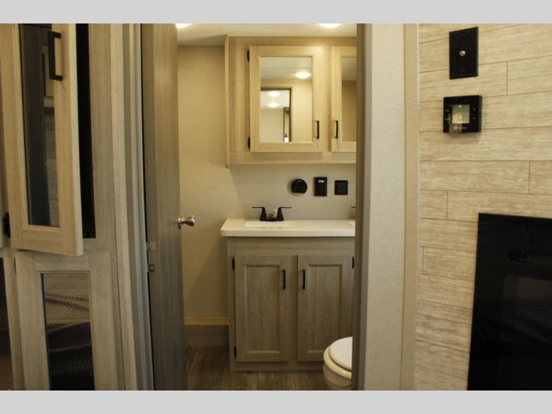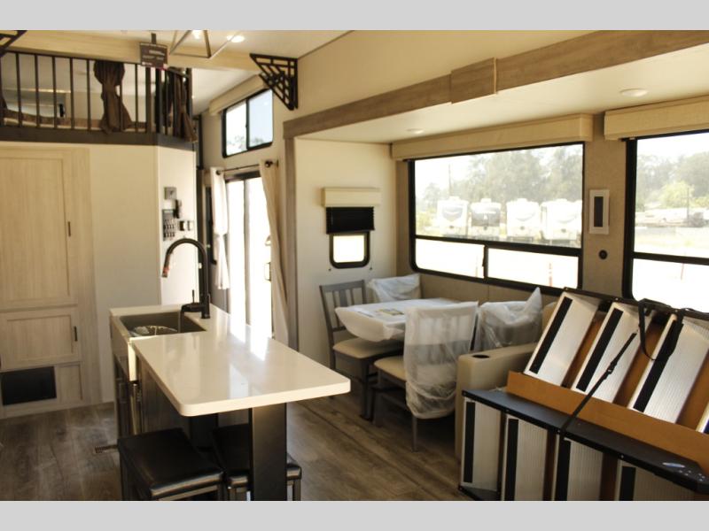 There is much to love about this destination trailer! Starting with the loft that has two queen beds, a wardrobe/storage, and a custom 58" x 71" bed. Downstairs there's a private bedroom with a king bed slide, a fireplace, and its very own private full bathroom complete with a dual sink vanity. The main living area has a huge bi-fold sleeper sectional sofa so you can fit even more guests, or just relax and watch the TV on the power lift in the entertainment center. The kitchen is well-equipped with a residential refrigerator, microwave, and pantry. The centerpiece here is a kitchen island with a deep basin farm-style sink and bar stool seating so your group can gather together and make new memories. The second full bath has a roomy 36" x 30" shower with glass door, and just outside it is the stackable washer and dryer!