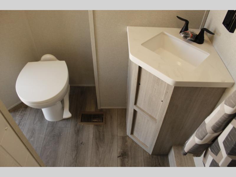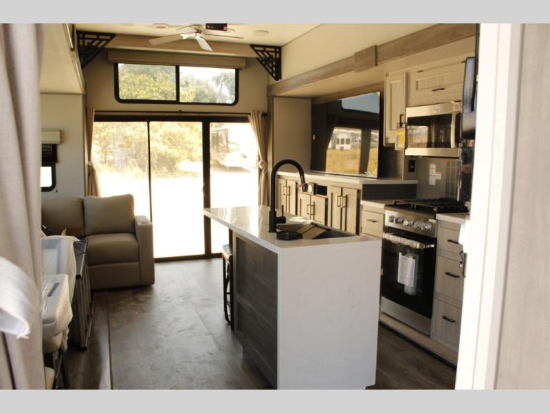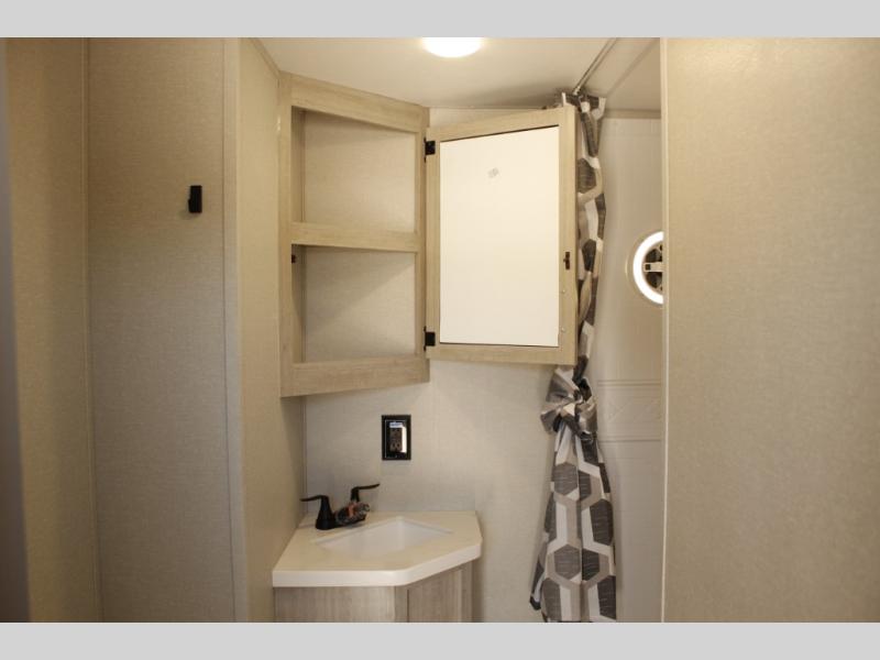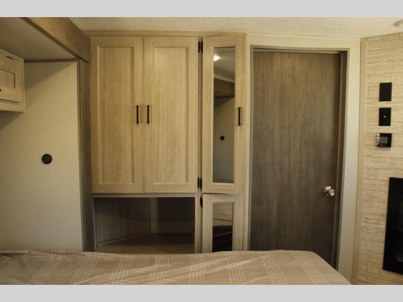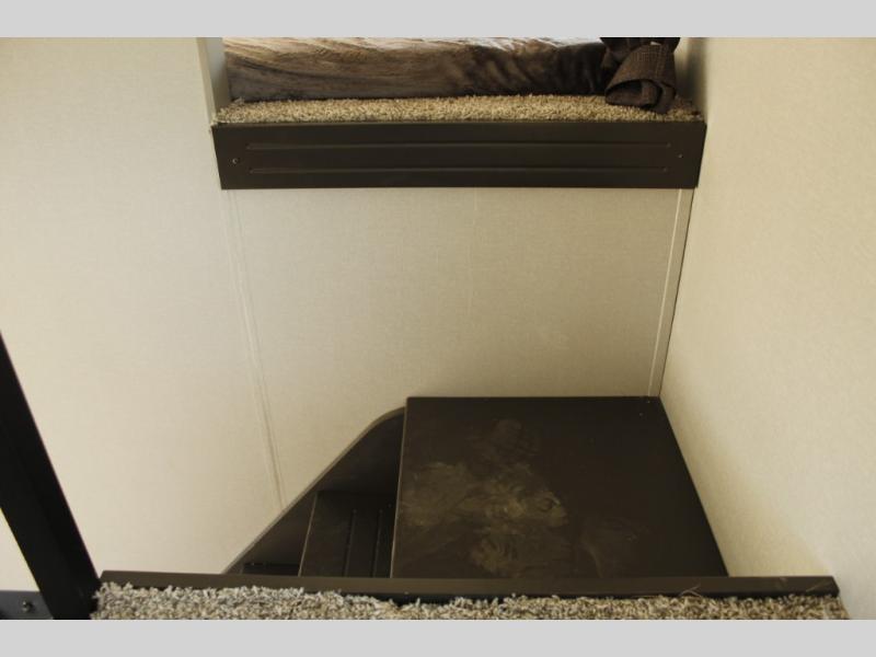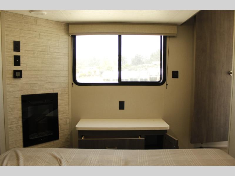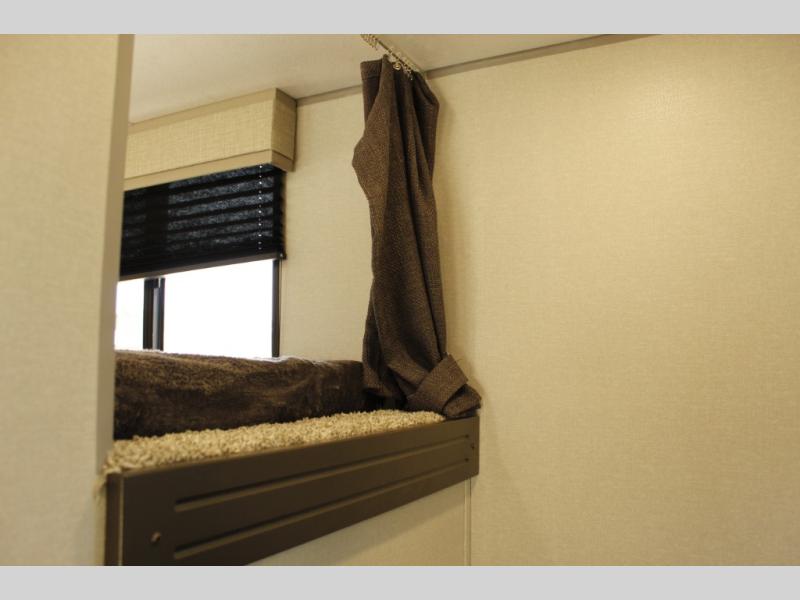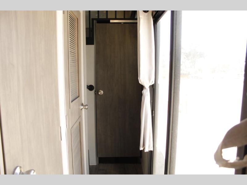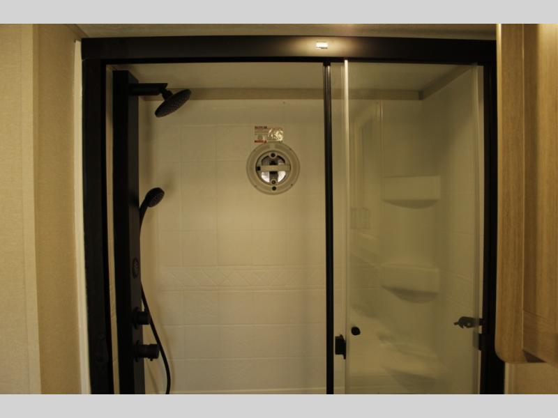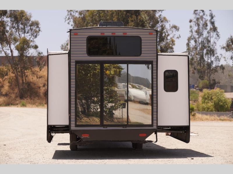 There is much to love about this destination trailer! Starting with the loft that has two queen beds, a wardrobe/storage, and a custom 58" x 71" bed. Downstairs there's a private bedroom with a king bed slide, a fireplace, and its very own private full bathroom complete with a dual sink vanity. The main living area has a huge bi-fold sleeper sectional sofa so you can fit even more guests, or just relax and watch the TV on the power lift in the entertainment center. The kitchen is well-equipped with a residential refrigerator, microwave, and pantry. The centerpiece here is a kitchen island with a deep basin farm-style sink and bar stool seating so your group can gather together and make new memories. The second full bath has a roomy 36" x 30" shower with glass door, and just outside it is the stackable washer and dryer!