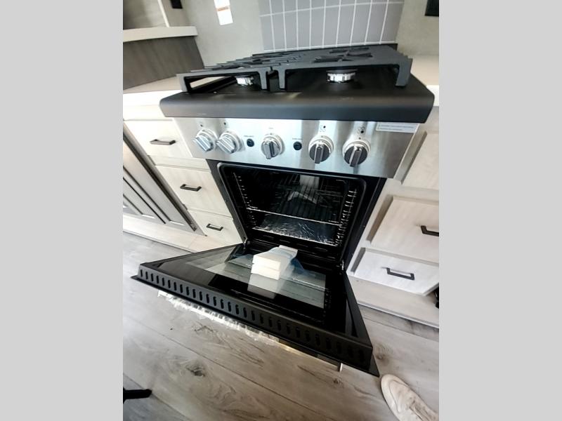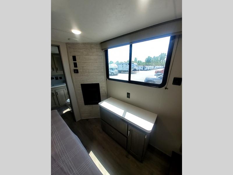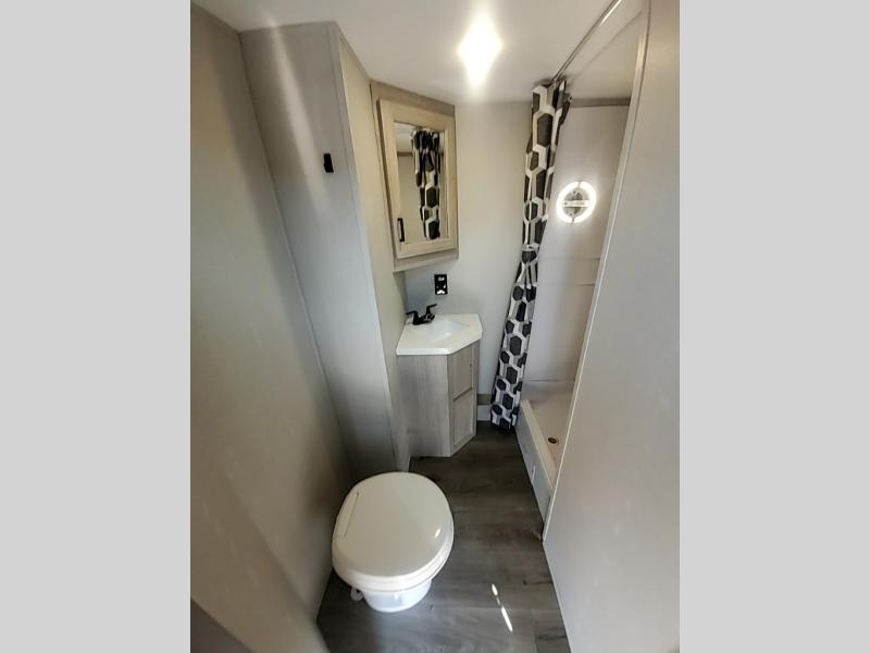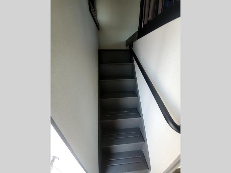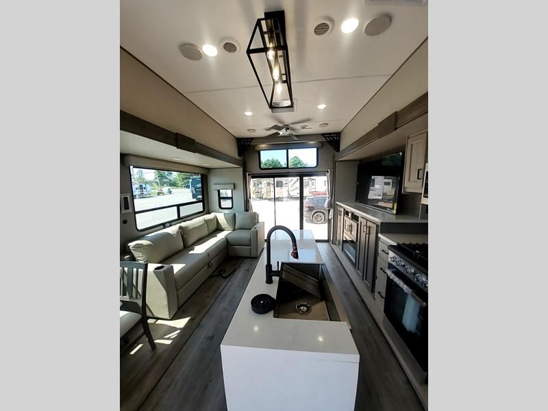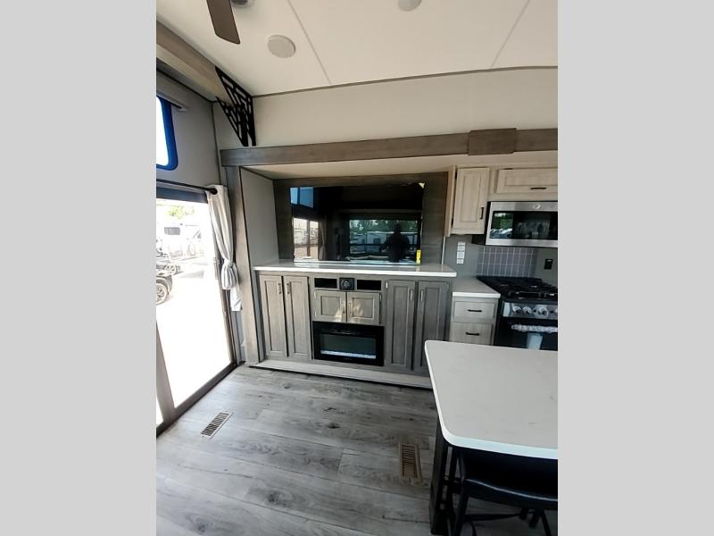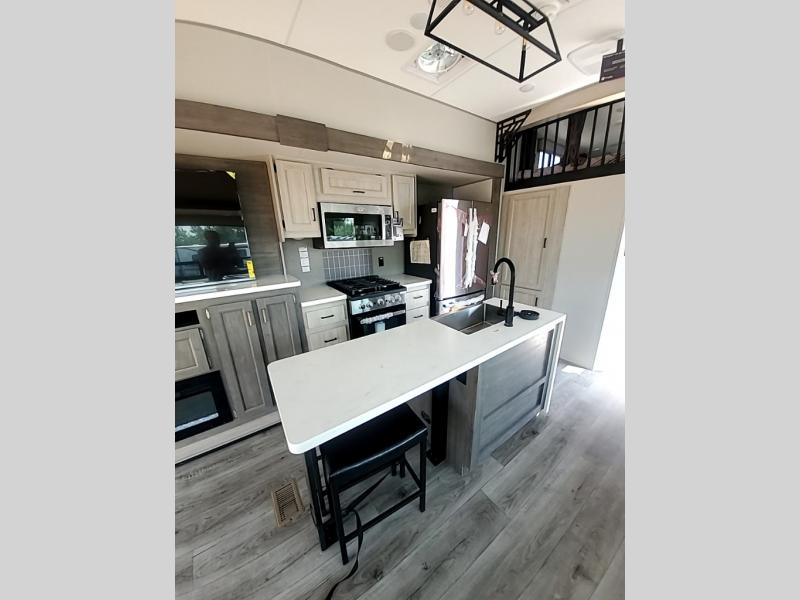 There is much to love about this destination trailer! Starting with the loft that has two queen beds, a wardrobe/storage, and a custom 58" x 71" bed. Downstairs there's a private bedroom with a king bed slide, a fireplace, and its very own private full bathroom complete with a dual sink vanity. The main living area has a huge bi-fold sleeper sectional sofa so you can fit even more guests, or just relax and watch the TV on the power lift in the entertainment center. The kitchen is well-equipped with a residential refrigerator, microwave, and pantry. The centerpiece here is a kitchen island with a deep basin farm-style sink and bar stool seating so your group can gather together and make new memories. The second full bath has a roomy 36" x 30" shower with glass door, and just outside it is the stackable washer and dryer!