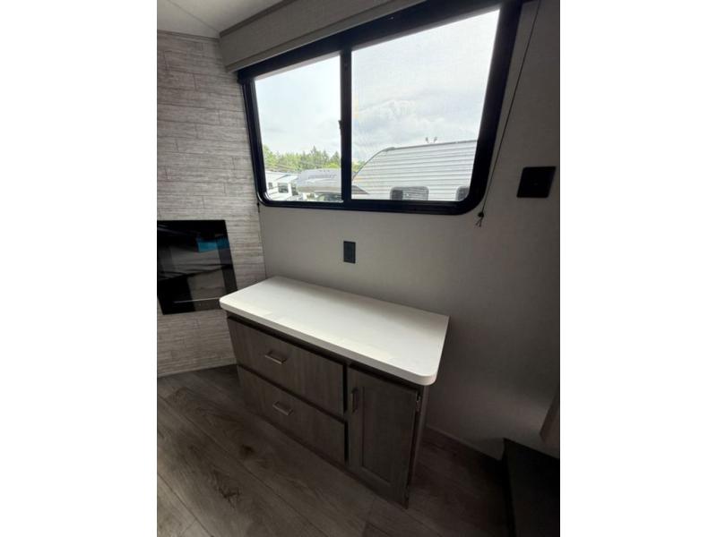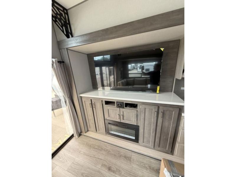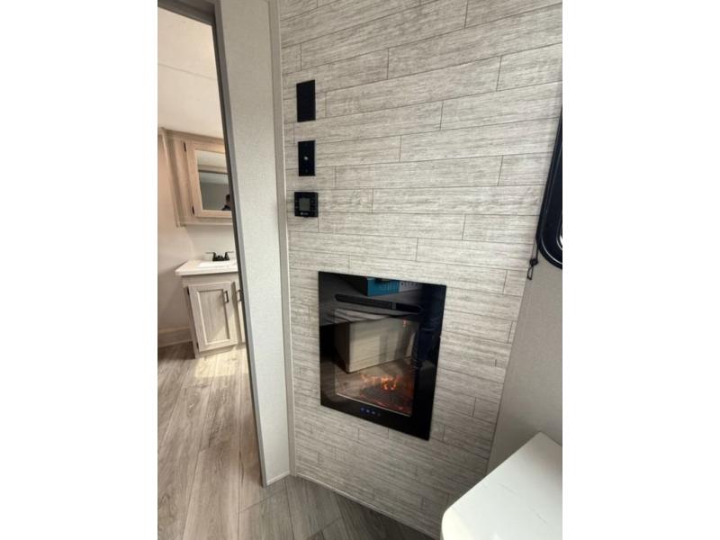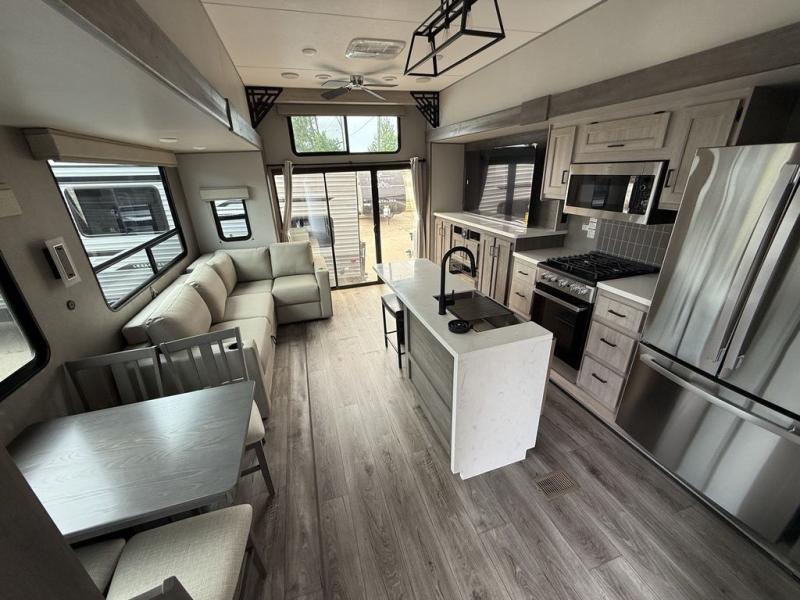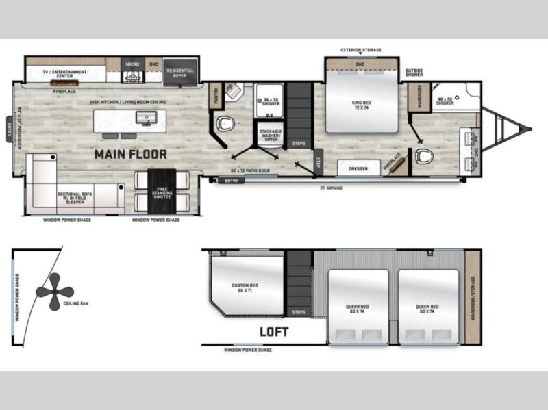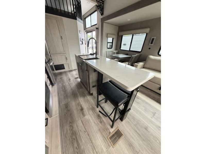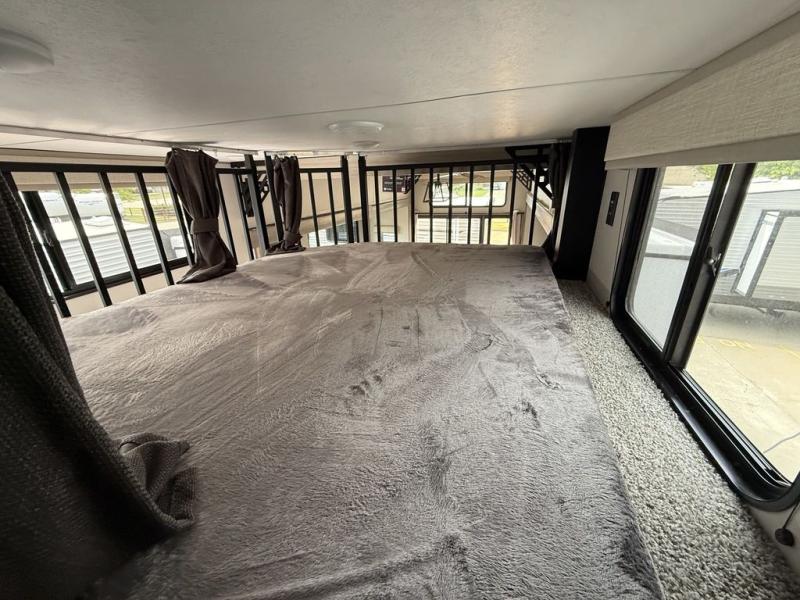 There is much to love about this destination trailer! Starting with the loft that has two queen beds, a wardrobe/storage, and a custom 58" x 71" bed. Downstairs there's a private bedroom with a king bed slide, a fireplace, and its very own private full bathroom complete with a dual sink vanity. The main living area has a huge bi-fold sleeper sectional sofa so you can fit even more guests, or just relax and watch the TV on the power lift in the entertainment center. The kitchen is well-equipped with a residential refrigerator, microwave, and pantry. The centerpiece here is a kitchen island with a deep basin farm-style sink and bar stool seating so your group can gather together and make new memories. The second full bath has a roomy 36" x 30" shower with glass door, and just outside it is the stackable washer and dryer!