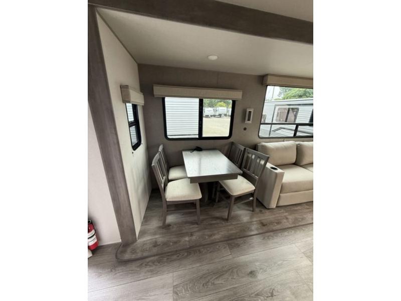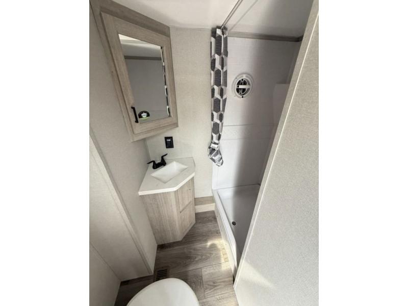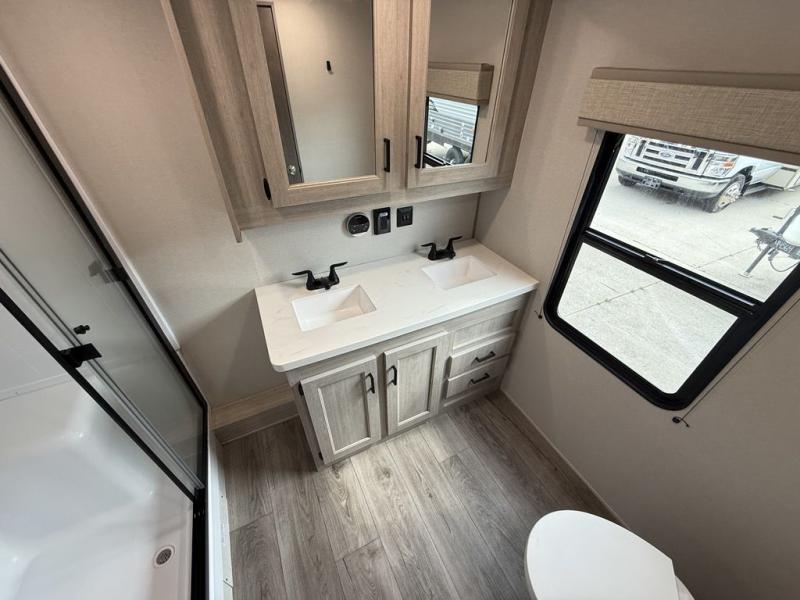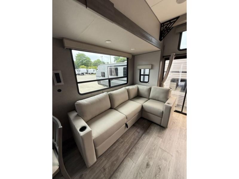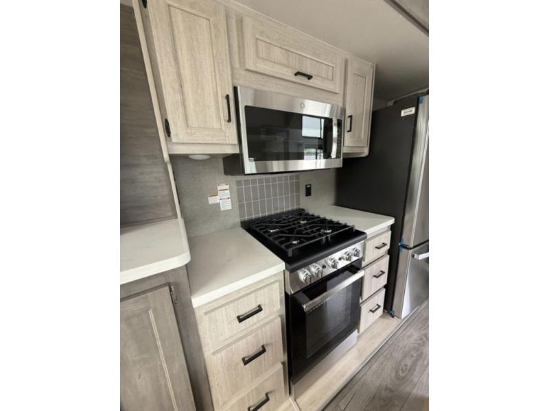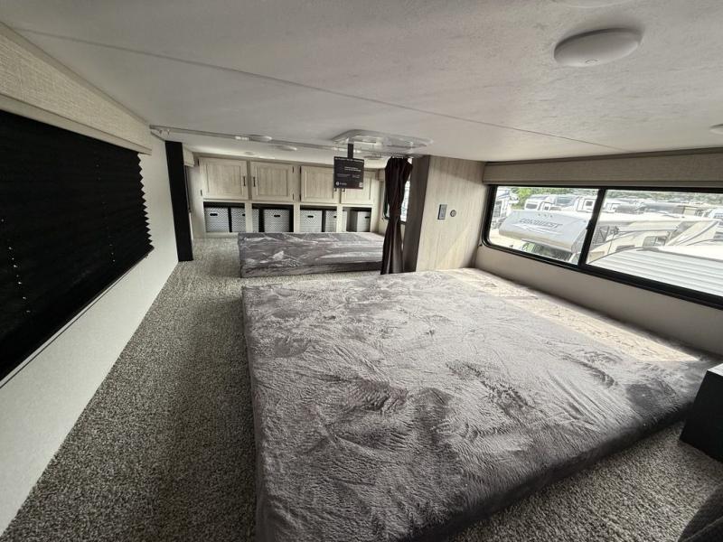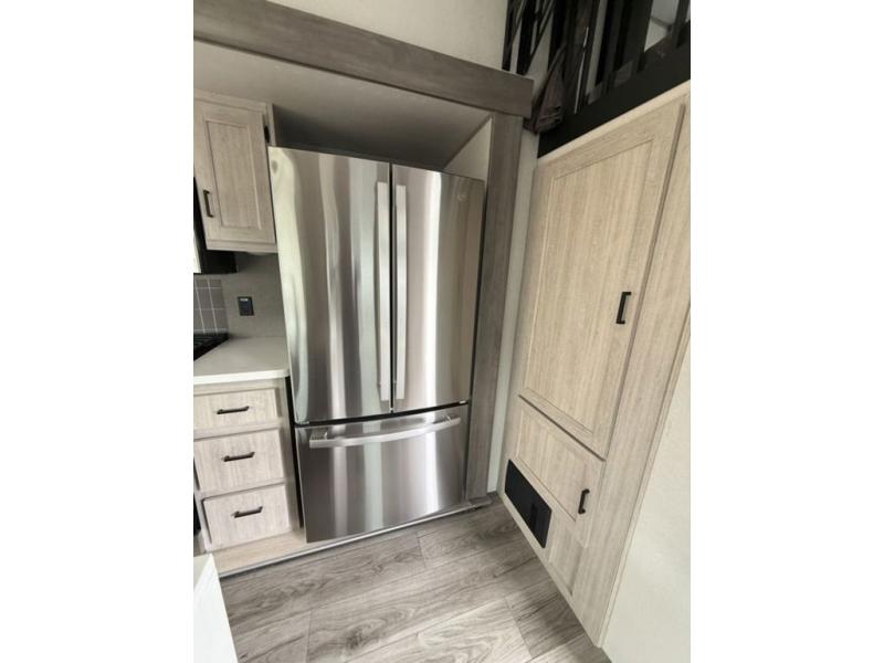 There is much to love about this destination trailer! Starting with the loft that has two queen beds, a wardrobe/storage, and a custom 58" x 71" bed. Downstairs there's a private bedroom with a king bed slide, a fireplace, and its very own private full bathroom complete with a dual sink vanity. The main living area has a huge bi-fold sleeper sectional sofa so you can fit even more guests, or just relax and watch the TV on the power lift in the entertainment center. The kitchen is well-equipped with a residential refrigerator, microwave, and pantry. The centerpiece here is a kitchen island with a deep basin farm-style sink and bar stool seating so your group can gather together and make new memories. The second full bath has a roomy 36" x 30" shower with glass door, and just outside it is the stackable washer and dryer!