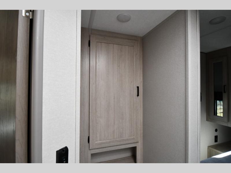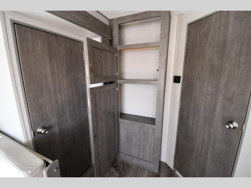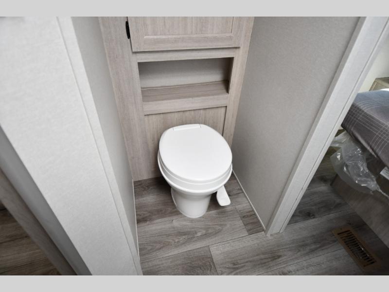 The front private bedroom offers a peaceful retreat with a walkaround queen bed, dual wardrobes, and overhead storage—perfect for extended trips or weekend escapes. Moving through the unit, you’ll find a full pass-through bathroom with generous storage, making it easy to stay organized and comfortable on the road.
