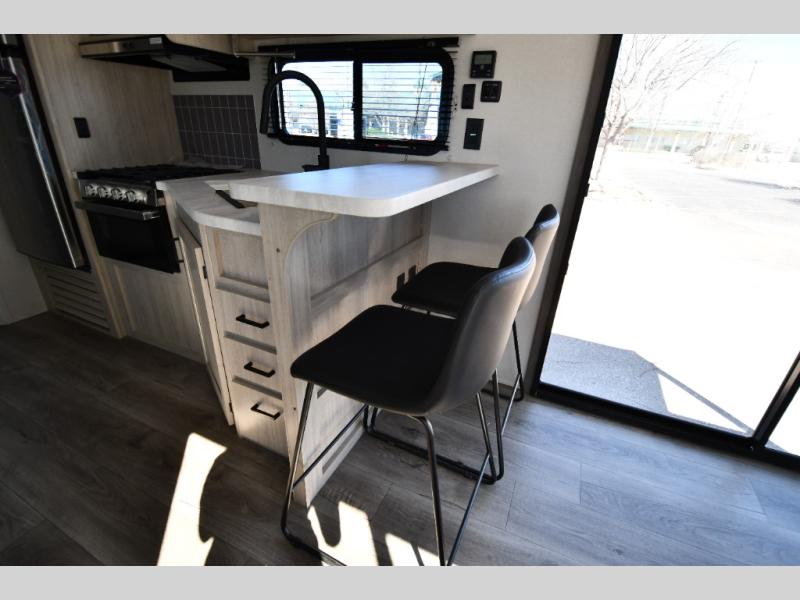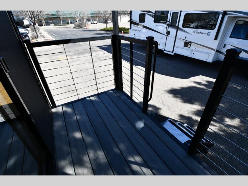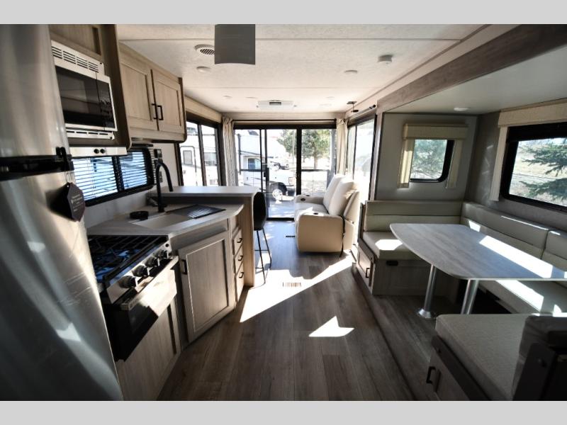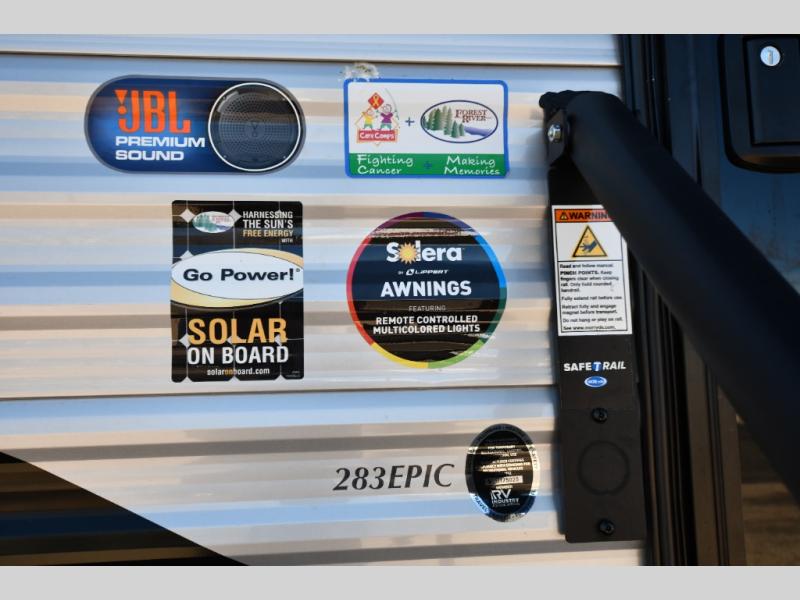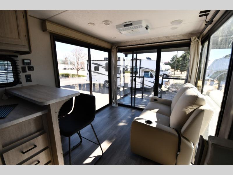 One of the most exciting features of the 283EPIC is its rear entertainment and patio setup. Large panoramic windows flood the space with natural light, while the unique rear covered porch creates a seamless indoor-outdoor living experience. Whether you’re enjoying your morning coffee or hosting friends under the awning, this feature sets the EPIC apart from the ordinary.
