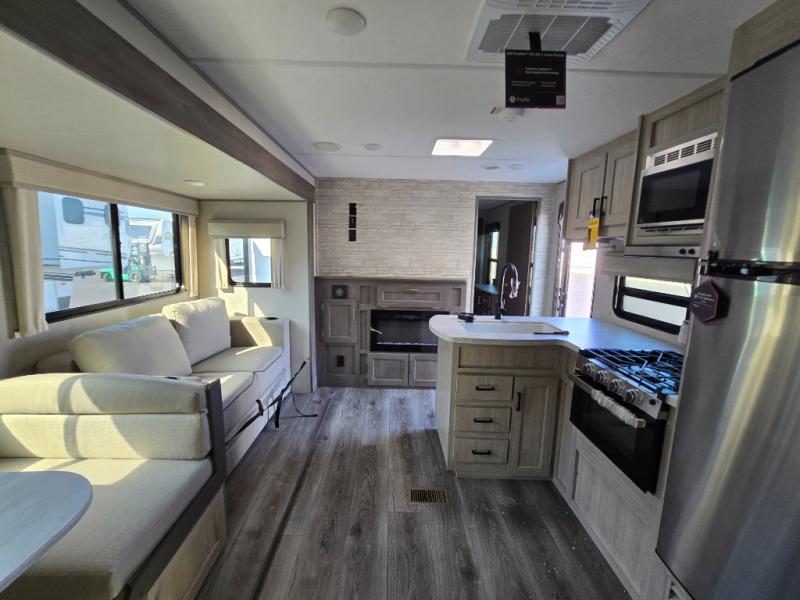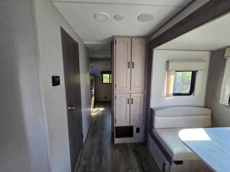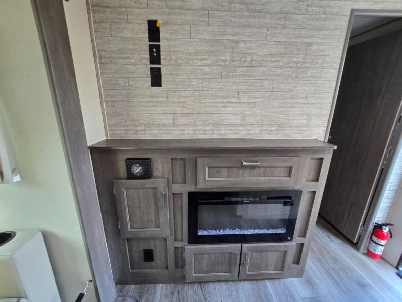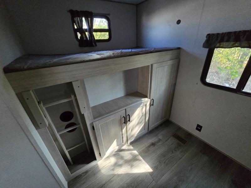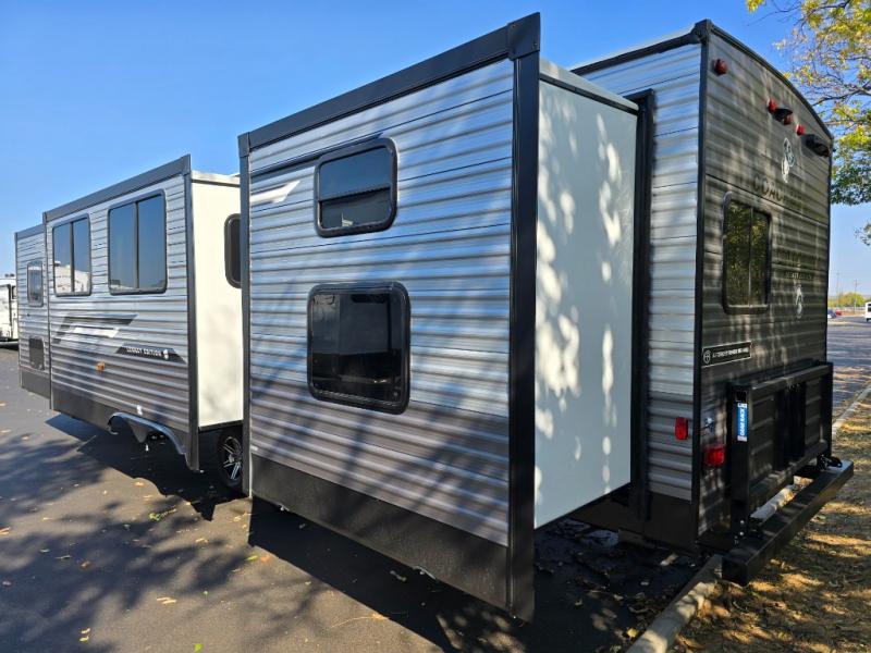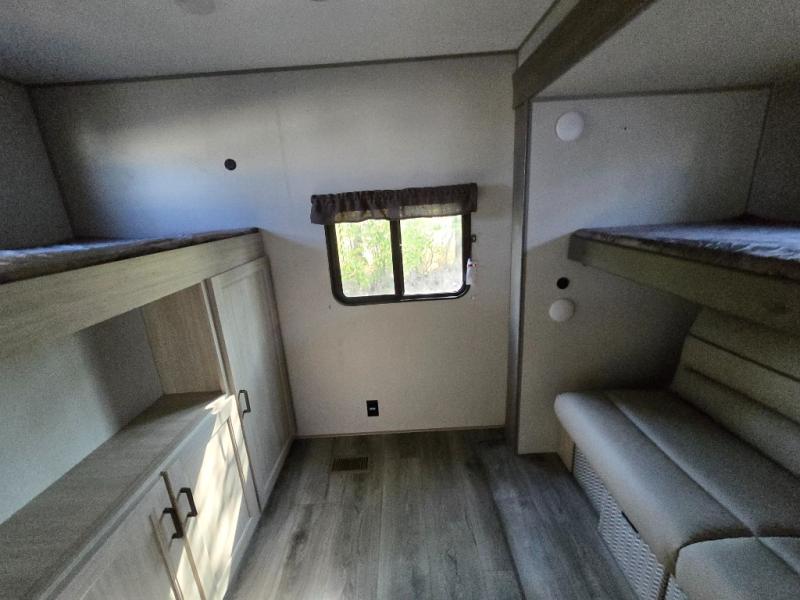 This family-friendly trailer offers lots of floor space thanks to the triple slides throughout! You and your family will love the combined living and kitchen area with a slide out booth dinette and a sofa with drink holders. The L-shaped kitchen counter allows the cook to make meals without moving for anyone trying to get to the full bathroom or the rear bunkhouse. The kids will have their own privacy, two bunk beds, a jack knife sofa with storage totes below plus a TV/wardrobe cabinet. The front private bedroom allows you to sleep like royalty, and offers a large closet for your clothing and another closet prepped for a washer/dryer. And don't forget about the full size camper kitchen and the 21' power awning with multicolor LED lights when you are outside.