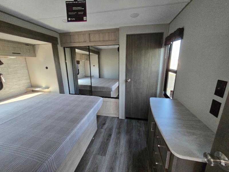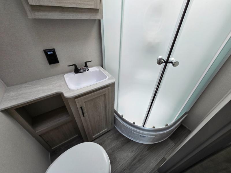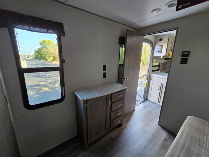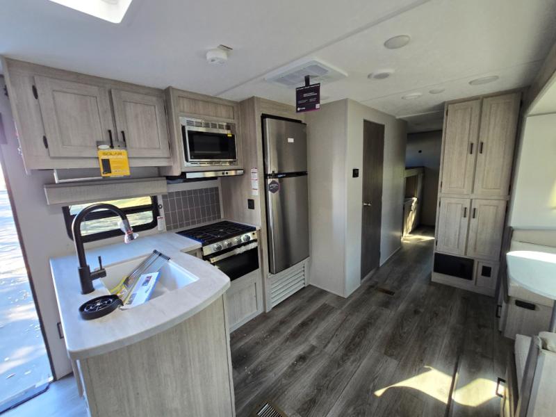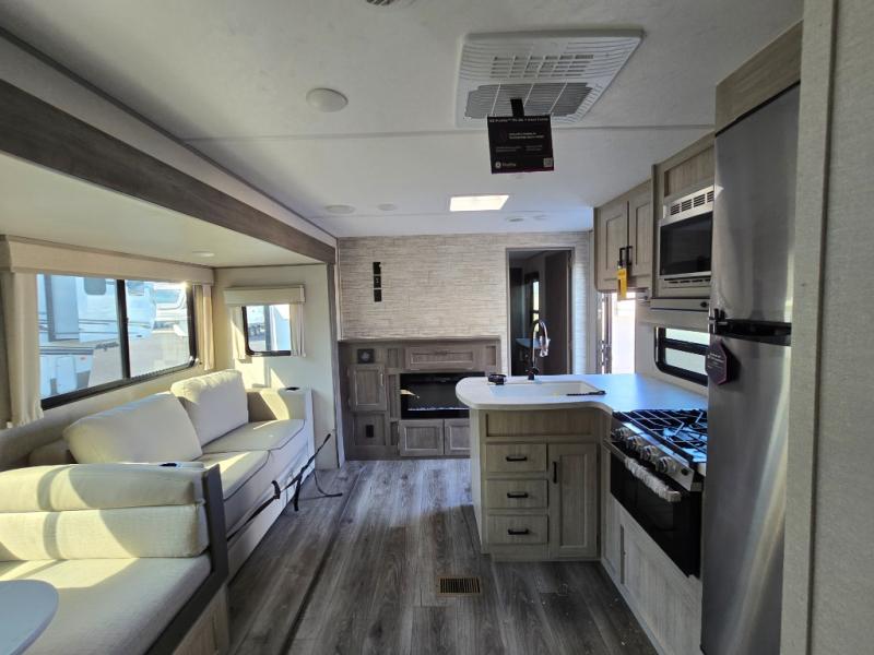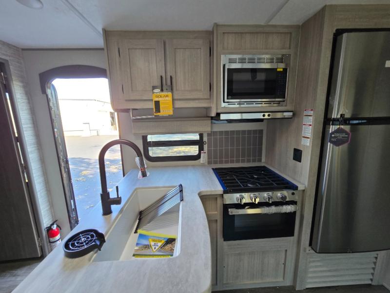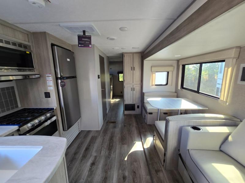 This family-friendly trailer offers lots of floor space thanks to the triple slides throughout! You and your family will love the combined living and kitchen area with a slide out booth dinette and a sofa with drink holders. The L-shaped kitchen counter allows the cook to make meals without moving for anyone trying to get to the full bathroom or the rear bunkhouse. The kids will have their own privacy, two bunk beds, a jack knife sofa with storage totes below plus a TV/wardrobe cabinet. The front private bedroom allows you to sleep like royalty, and offers a large closet for your clothing and another closet prepped for a washer/dryer. And don't forget about the full size camper kitchen and the 21' power awning with multicolor LED lights when you are outside.
