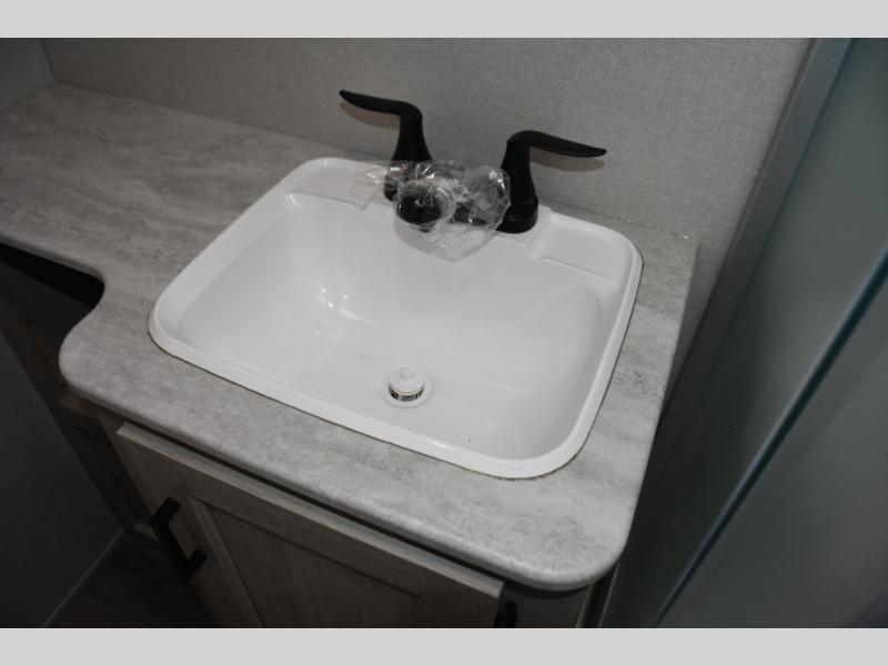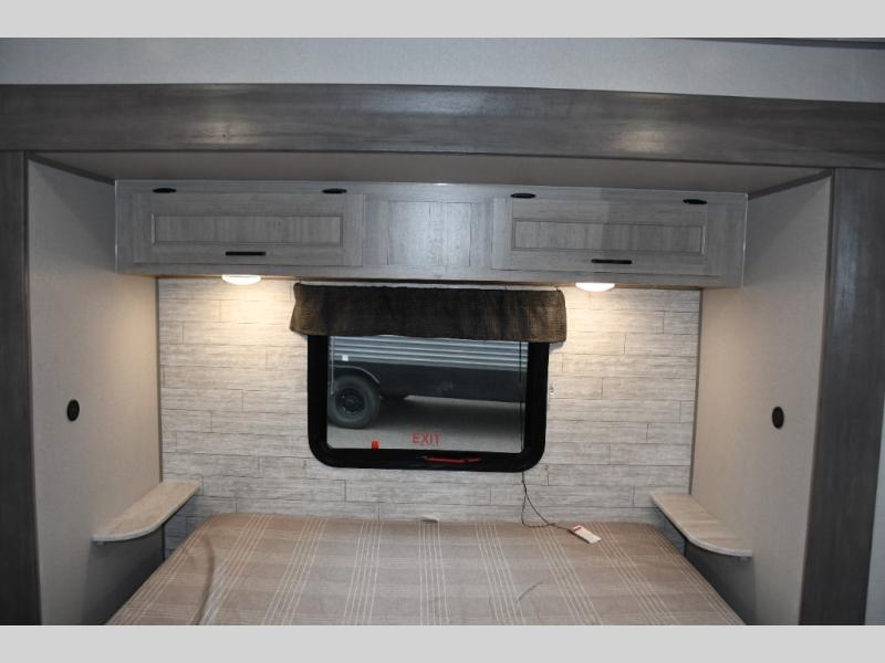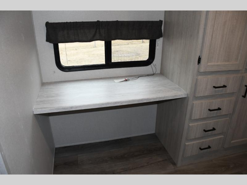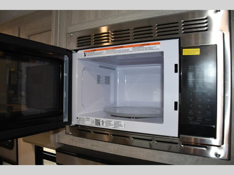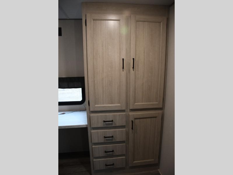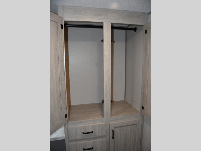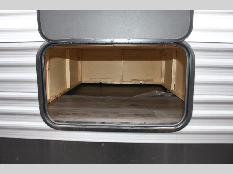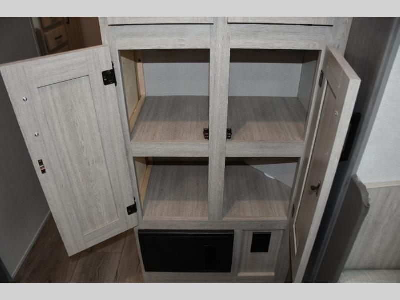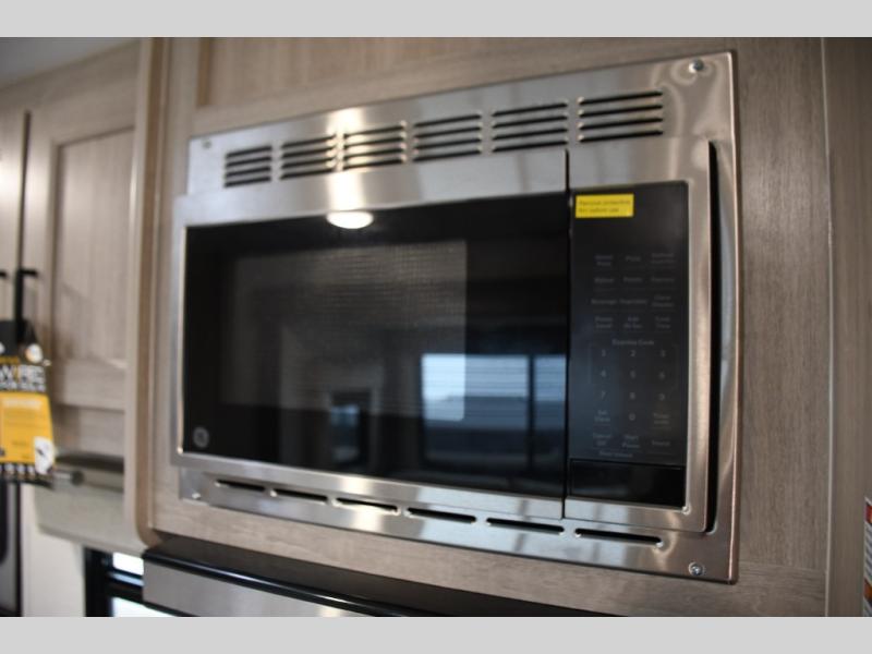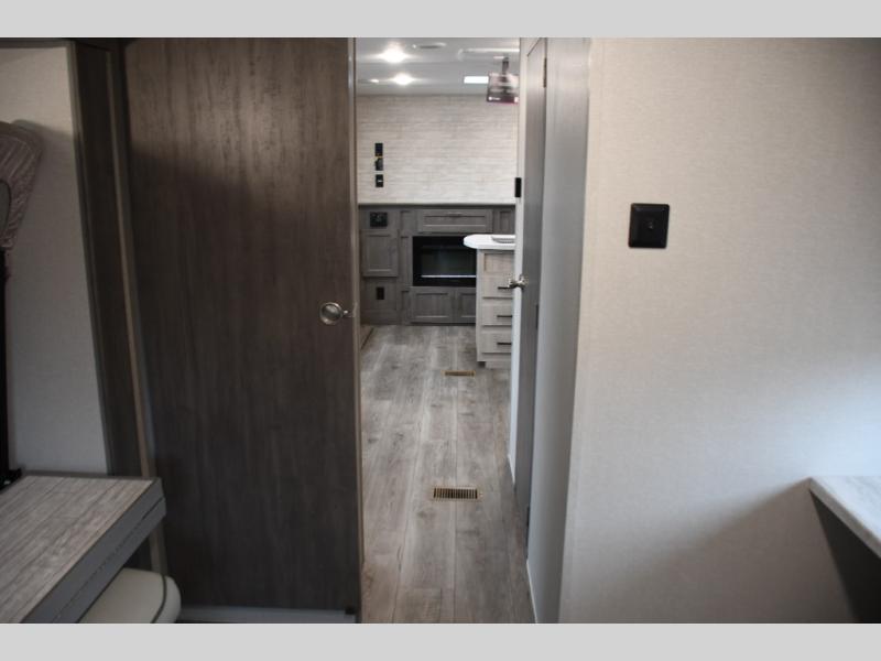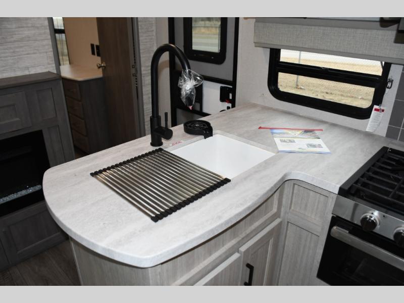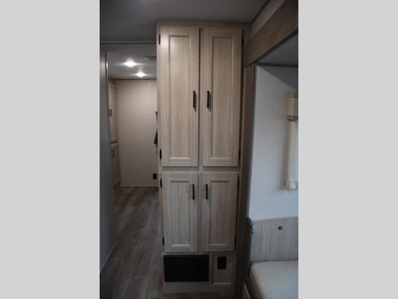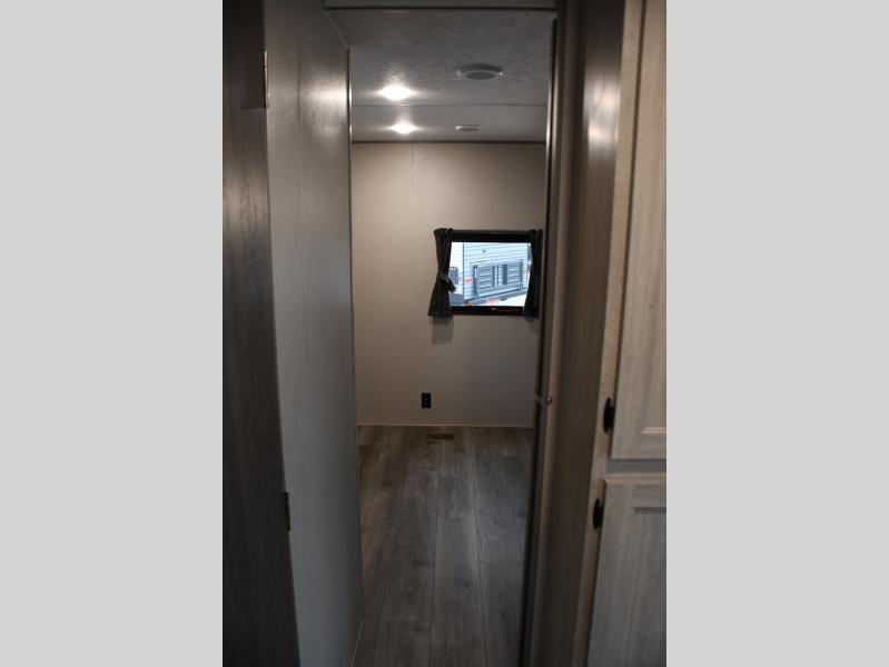 This family-friendly trailer offers lots of floor space thanks to the triple slides throughout! You and your family will love the combined living and kitchen area with a slide out booth dinette and a sofa with drink holders. The L-shaped kitchen counter allows the cook to make meals without moving for anyone trying to get to the full bathroom or the rear bunkhouse. The kids will have their own privacy, two bunk beds, a jack knife sofa with storage totes below plus a TV/wardrobe cabinet. The front private bedroom allows you to sleep like royalty, and offers a large closet for your clothing and another closet prepped for a washer/dryer. And don't forget about the full size camper kitchen and the 21' power awning with multicolor LED lights when you are outside.