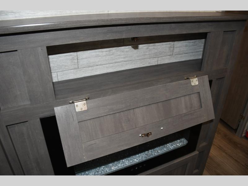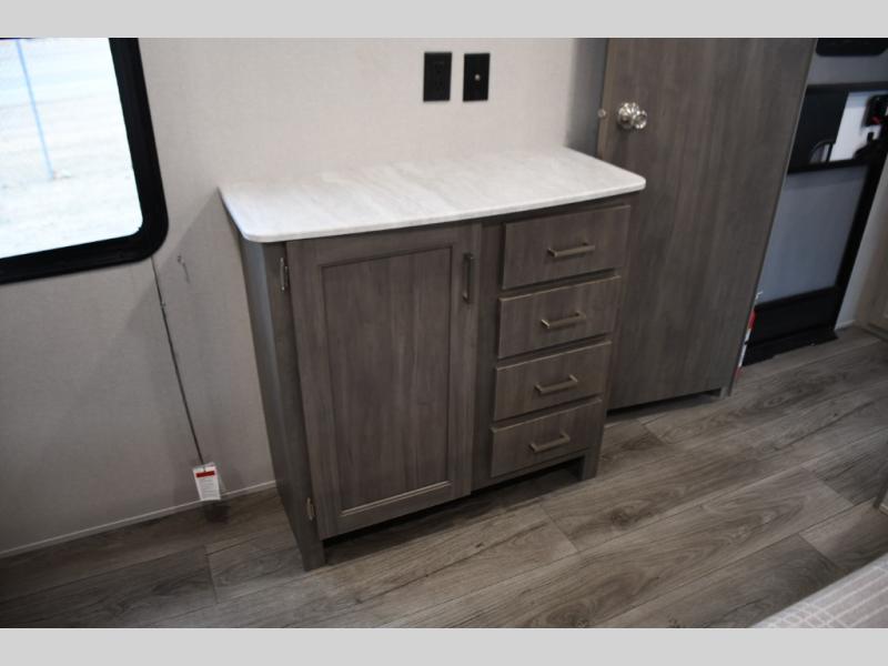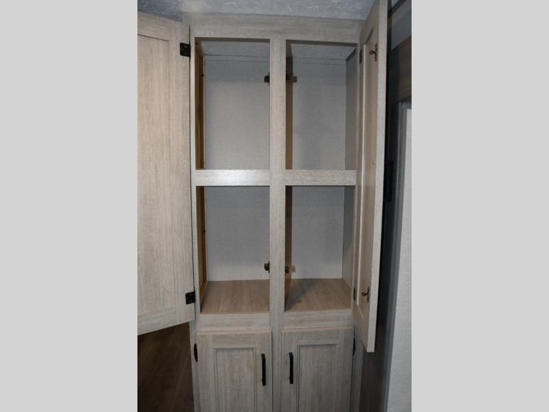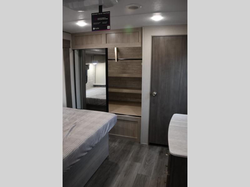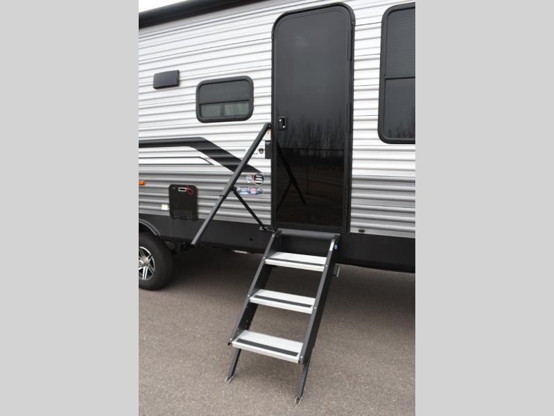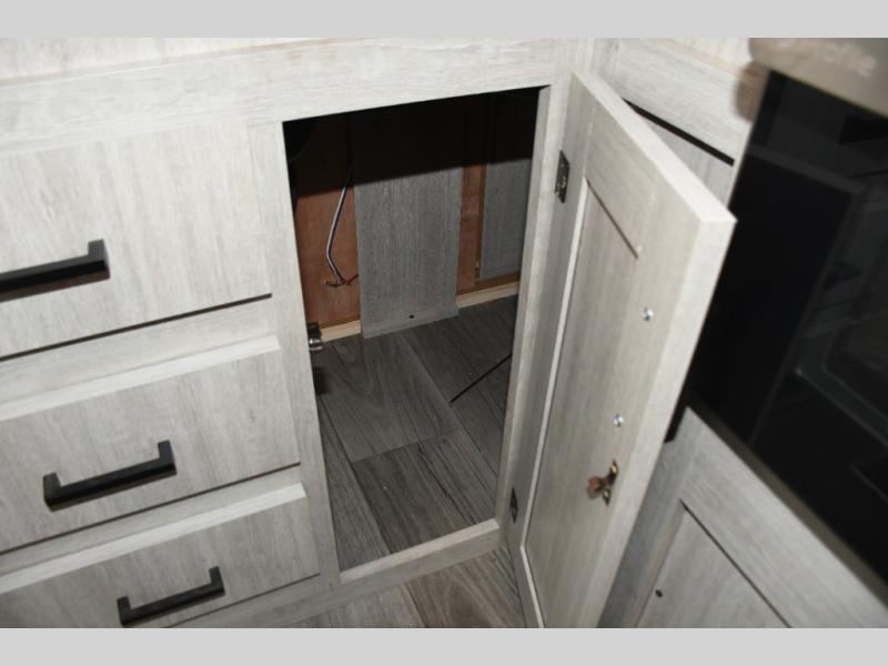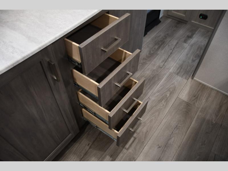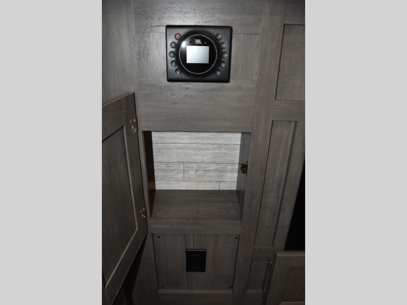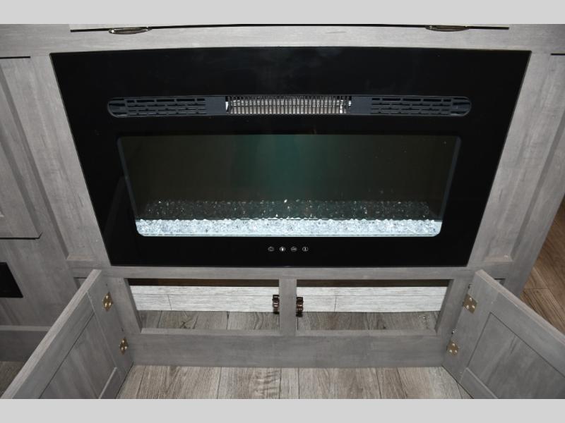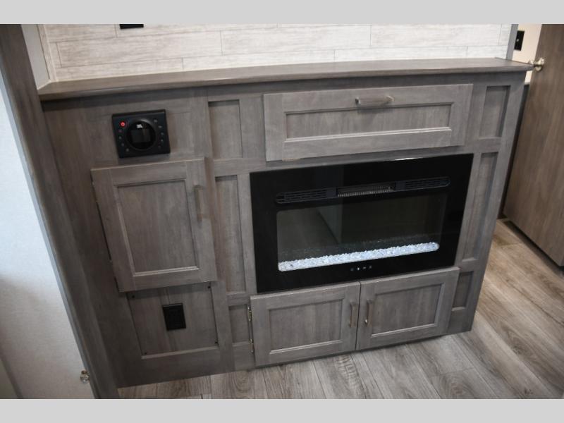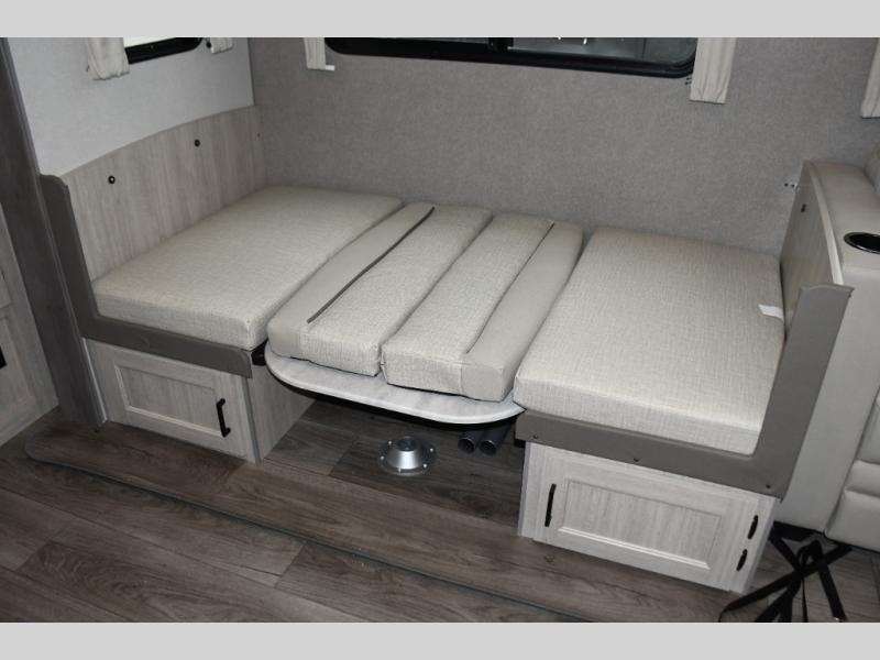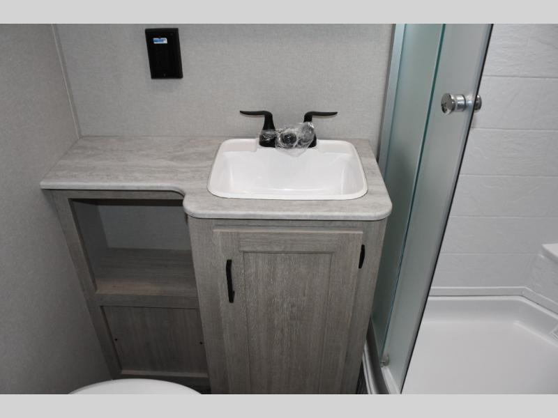 This family-friendly trailer offers lots of floor space thanks to the triple slides throughout! You and your family will love the combined living and kitchen area with a slide out booth dinette and a sofa with drink holders. The L-shaped kitchen counter allows the cook to make meals without moving for anyone trying to get to the full bathroom or the rear bunkhouse. The kids will have their own privacy, two bunk beds, a jack knife sofa with storage totes below plus a TV/wardrobe cabinet. The front private bedroom allows you to sleep like royalty, and offers a large closet for your clothing and another closet prepped for a washer/dryer. And don't forget about the full size camper kitchen and the 21' power awning with multicolor LED lights when you are outside.