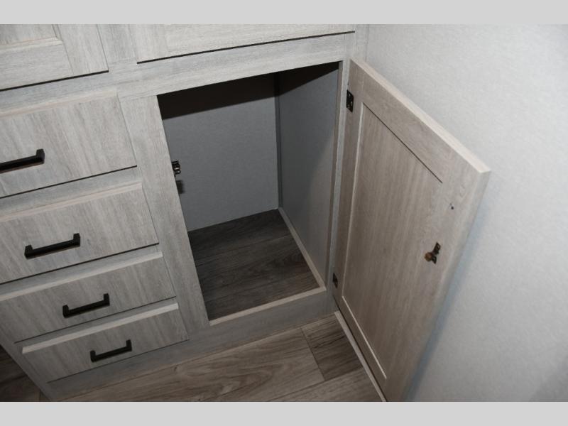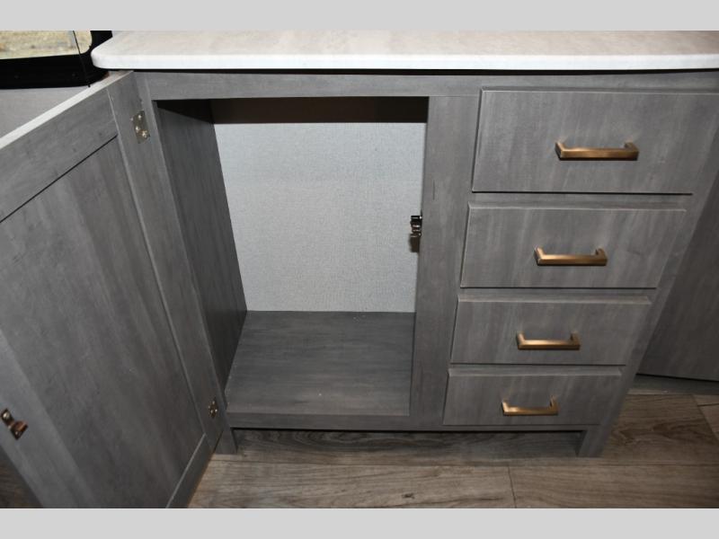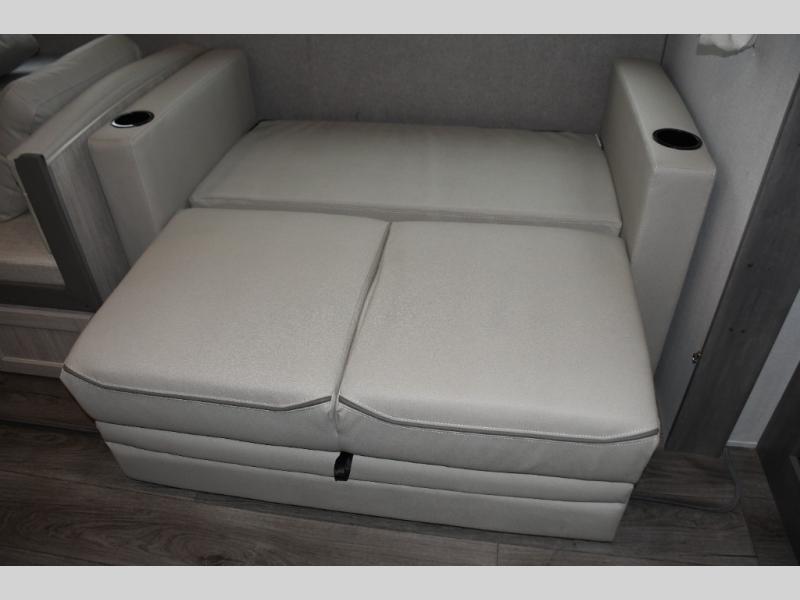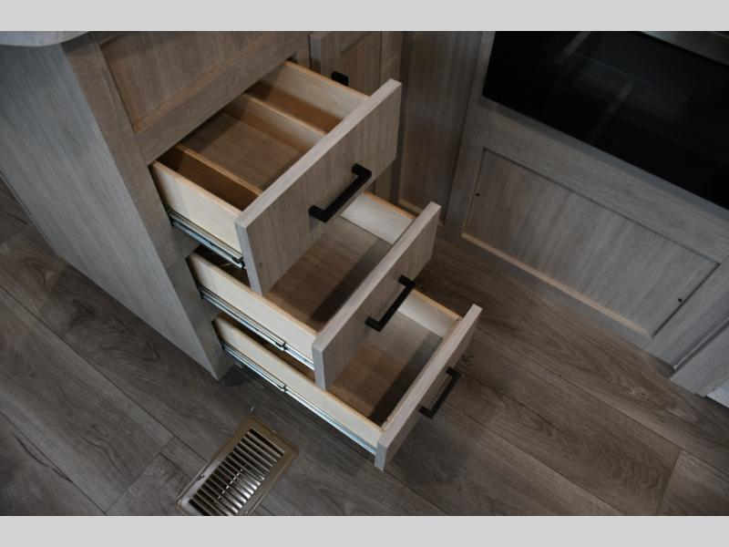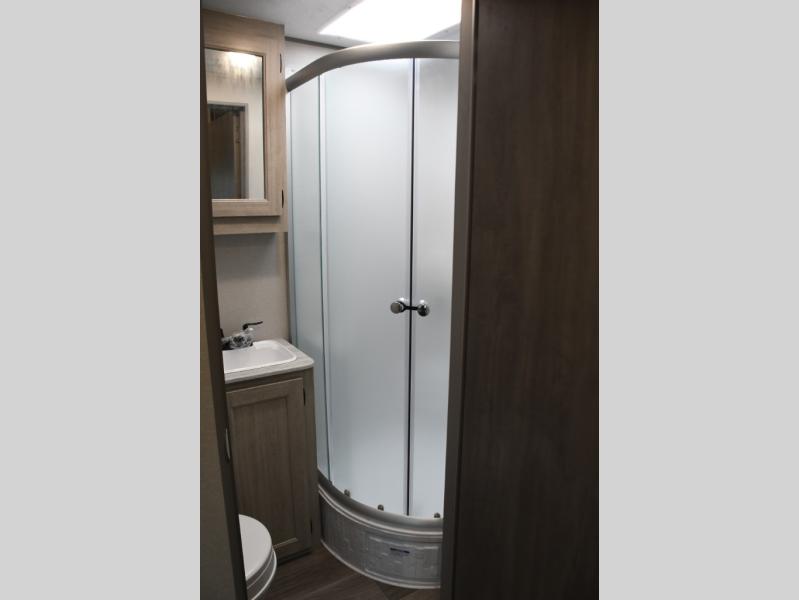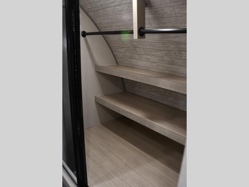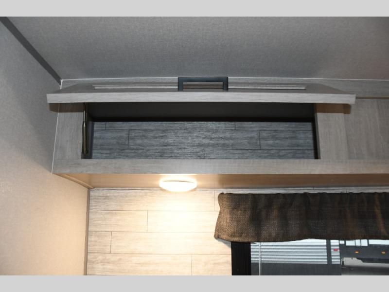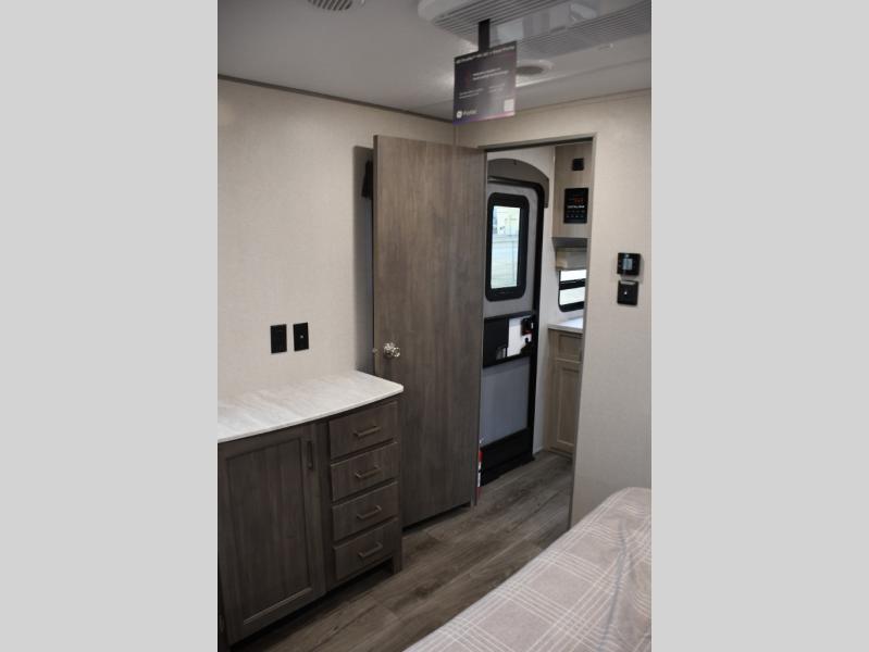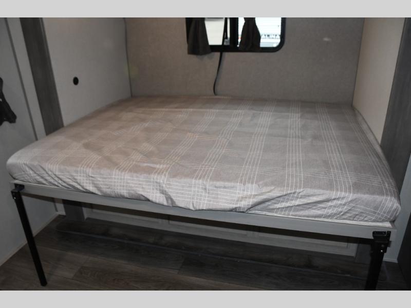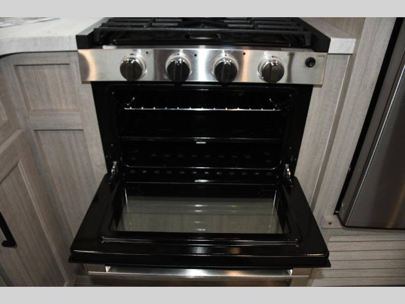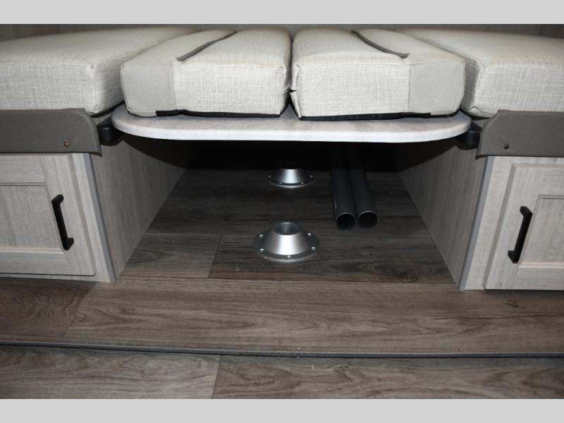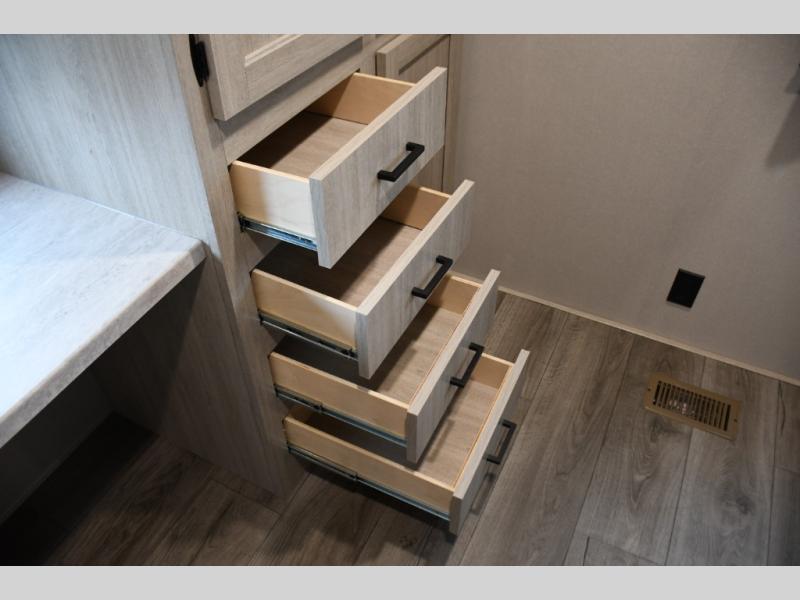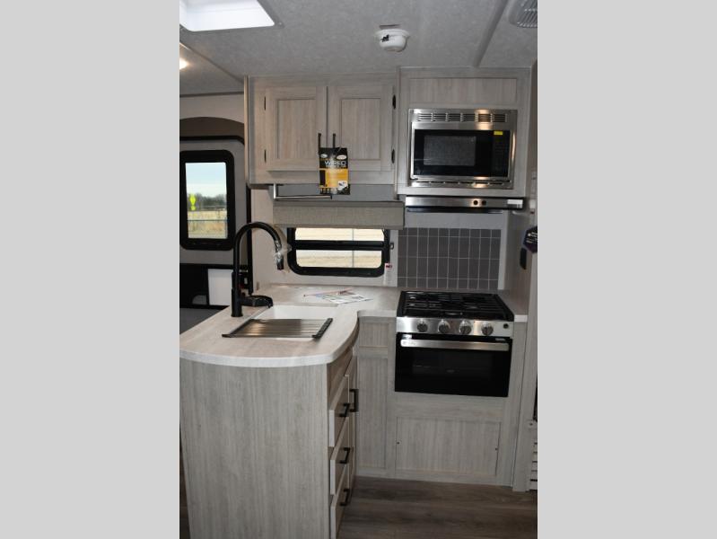 This family-friendly trailer offers lots of floor space thanks to the triple slides throughout! You and your family will love the combined living and kitchen area with a slide out booth dinette and a sofa with drink holders. The L-shaped kitchen counter allows the cook to make meals without moving for anyone trying to get to the full bathroom or the rear bunkhouse. The kids will have their own privacy, two bunk beds, a jack knife sofa with storage totes below plus a TV/wardrobe cabinet. The front private bedroom allows you to sleep like royalty, and offers a large closet for your clothing and another closet prepped for a washer/dryer. And don't forget about the full size camper kitchen and the 21' power awning with multicolor LED lights when you are outside.