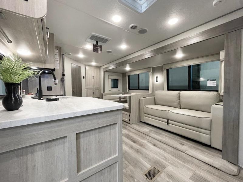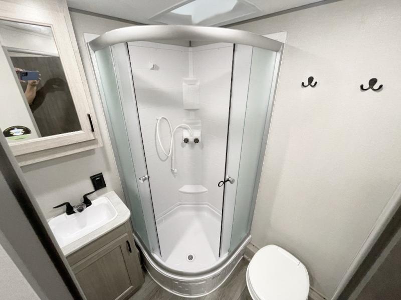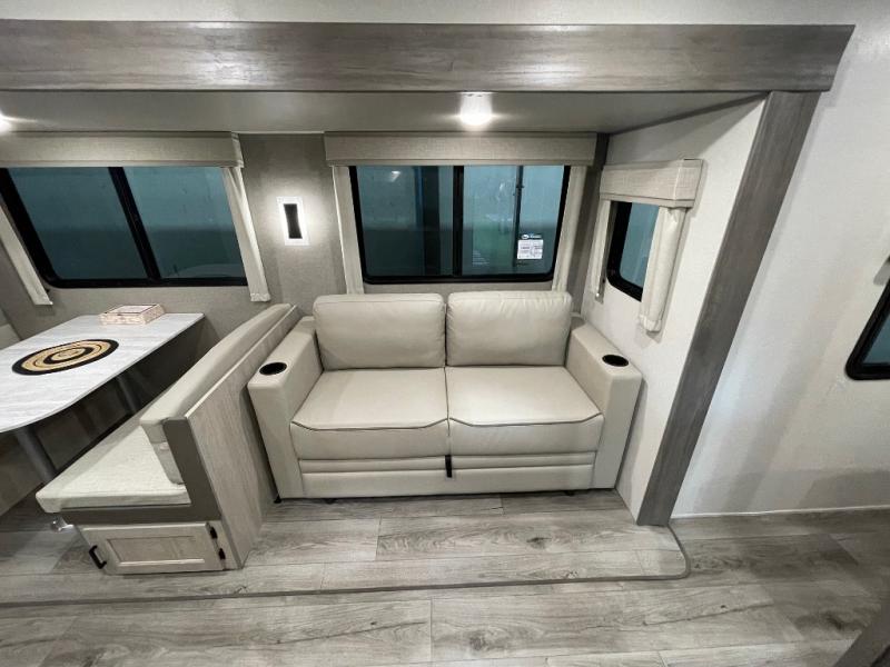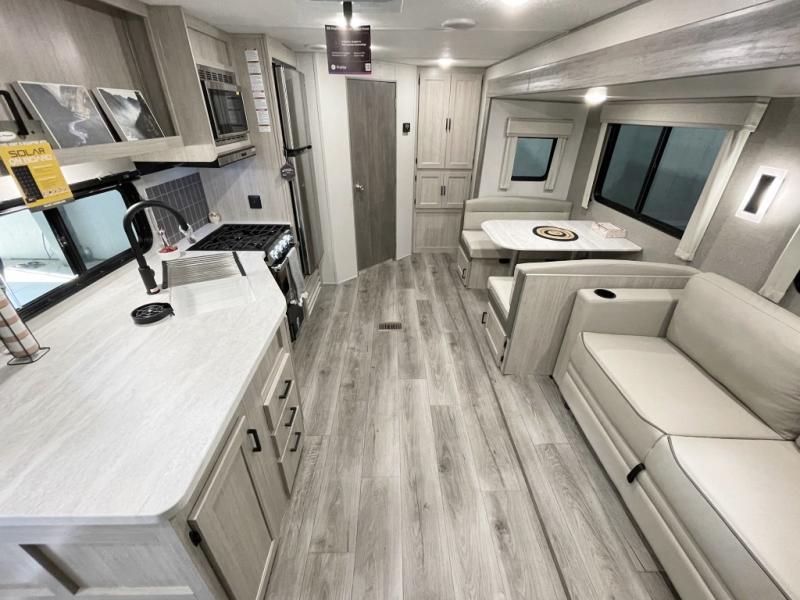 This half-ton friendly trailer is easy to pull and park, and is spacious thanks to the large slide out in the main living and kitchen area! You can dine at the booth dinette or choose the free standing dinette option, and the sofa offers drink holders for your drink when you're relaxing. The rear corner offers a full bathroom and a large wardrobe/pantry for the storage you need. The galley kitchen offers full amenities plus a breakfast bar where you can set out fresh fruit and cereal. And the 15' awning provides protection from the elements plus has the choice of multiple LED colors with the use of the remote.