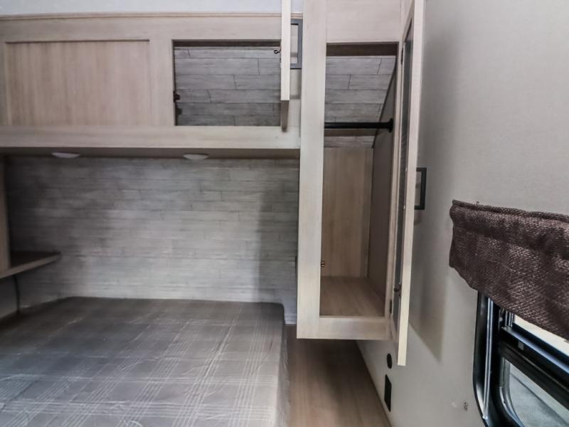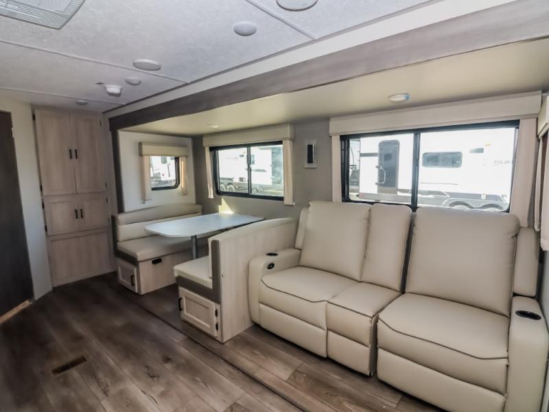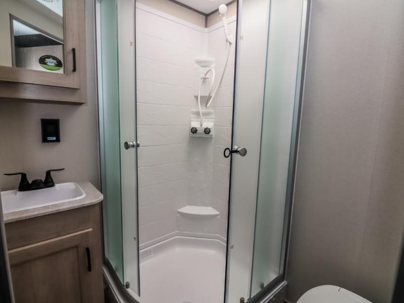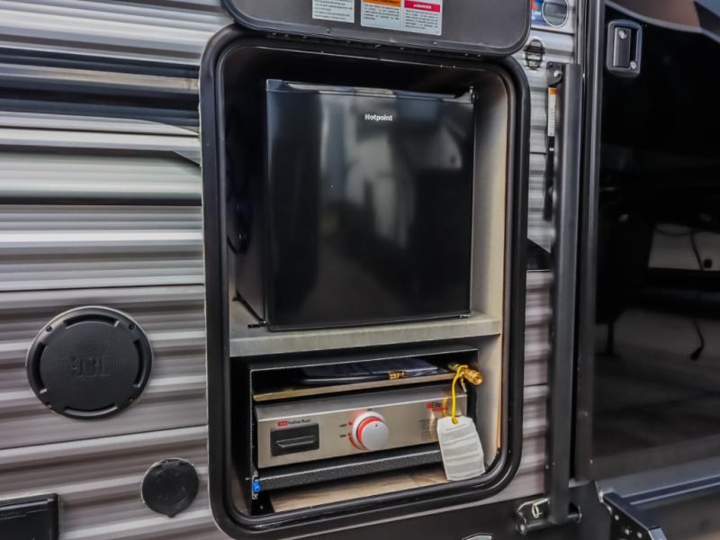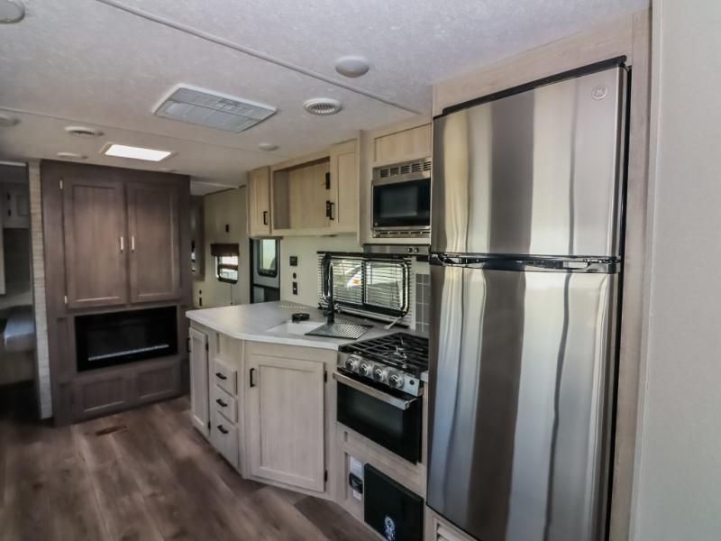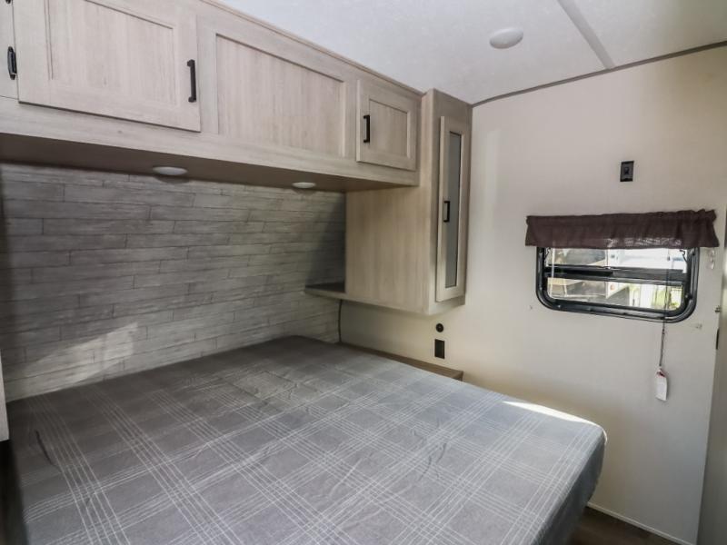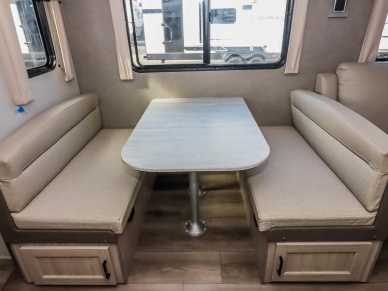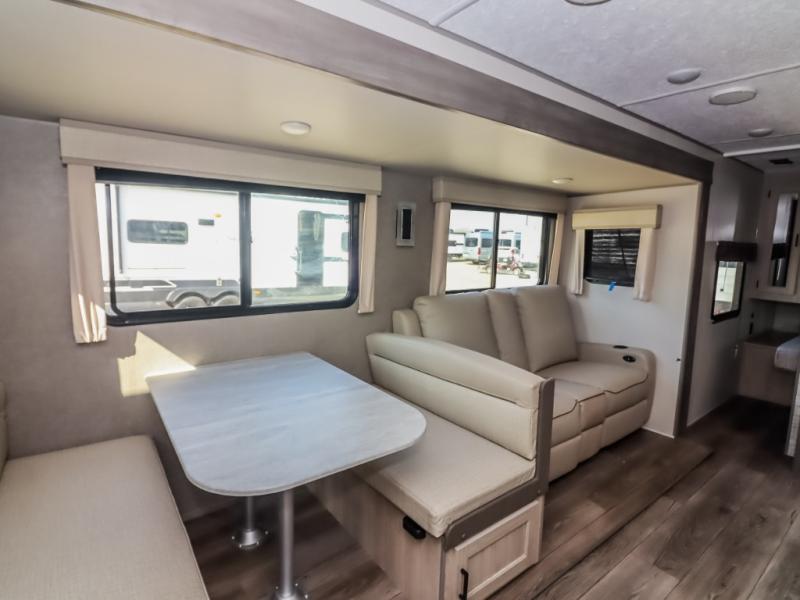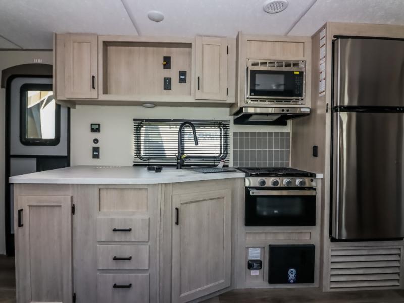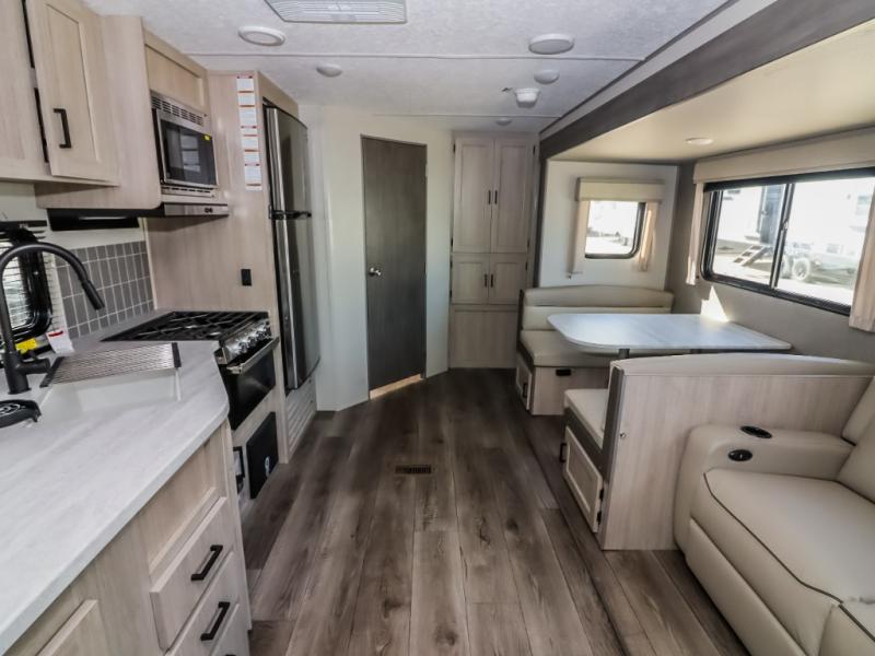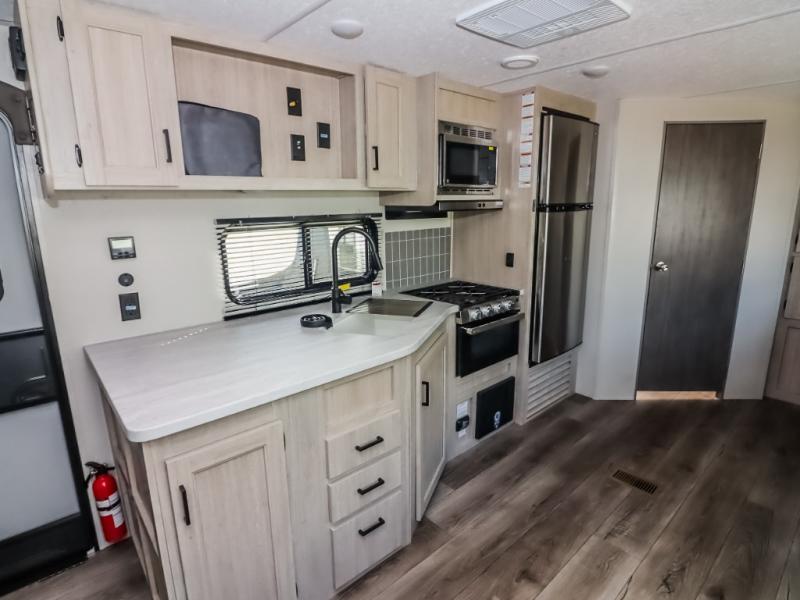 This half-ton friendly trailer is easy to pull and park, and is spacious thanks to the large slide out in the main living and kitchen area! You can dine at the booth dinette or choose the free standing dinette option, and the sofa offers drink holders for your drink when you're relaxing. The rear corner offers a full bathroom and a large wardrobe/pantry for the storage you need. The galley kitchen offers full amenities plus a breakfast bar where you can set out fresh fruit and cereal. And the 15' awning provides protection from the elements plus has the choice of multiple LED colors with the use of the remote.