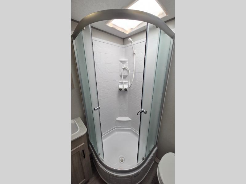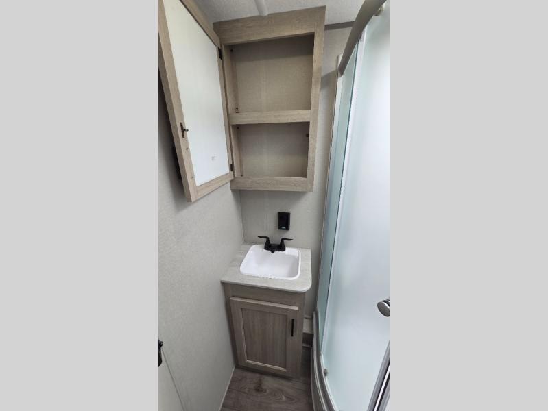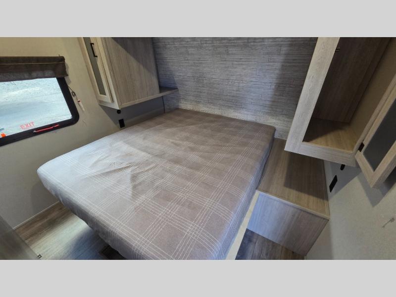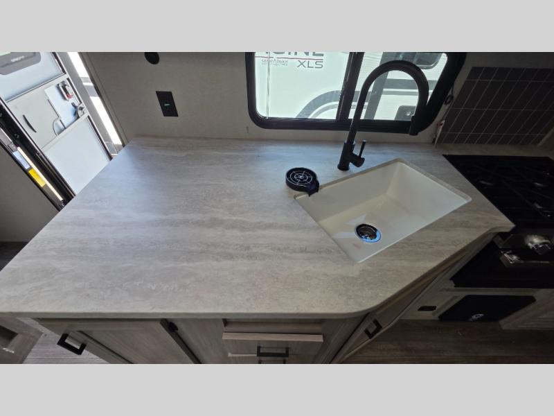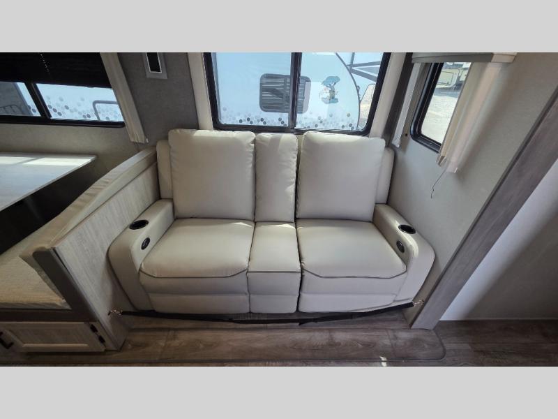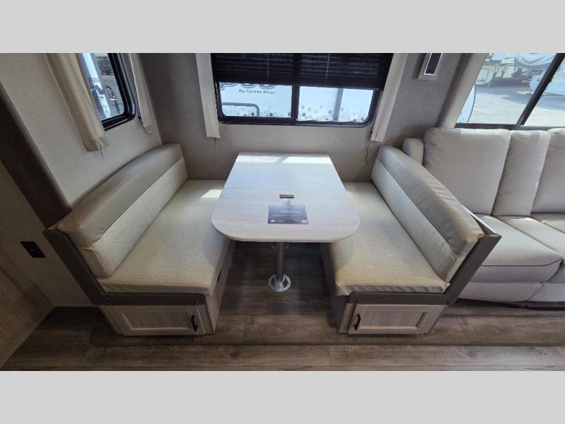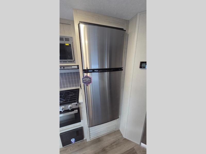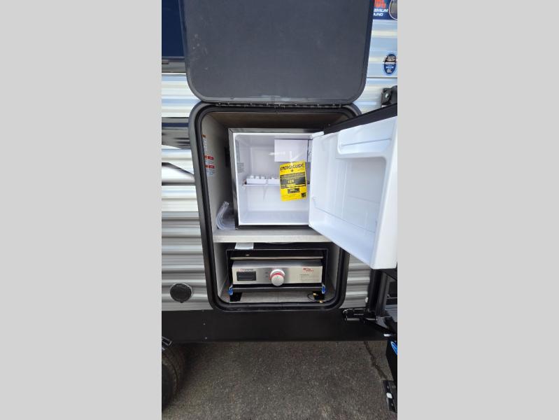 This half-ton friendly trailer is easy to pull and park, and is spacious thanks to the large slide out in the main living and kitchen area! You can dine at the booth dinette or choose the free standing dinette option, and the sofa offers drink holders for your drink when you're relaxing. The rear corner offers a full bathroom and a large wardrobe/pantry for the storage you need. The galley kitchen offers full amenities plus a breakfast bar where you can set out fresh fruit and cereal. And the 15' awning provides protection from the elements plus has the choice of multiple LED colors with the use of the remote.