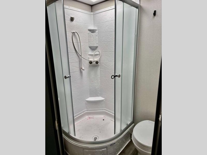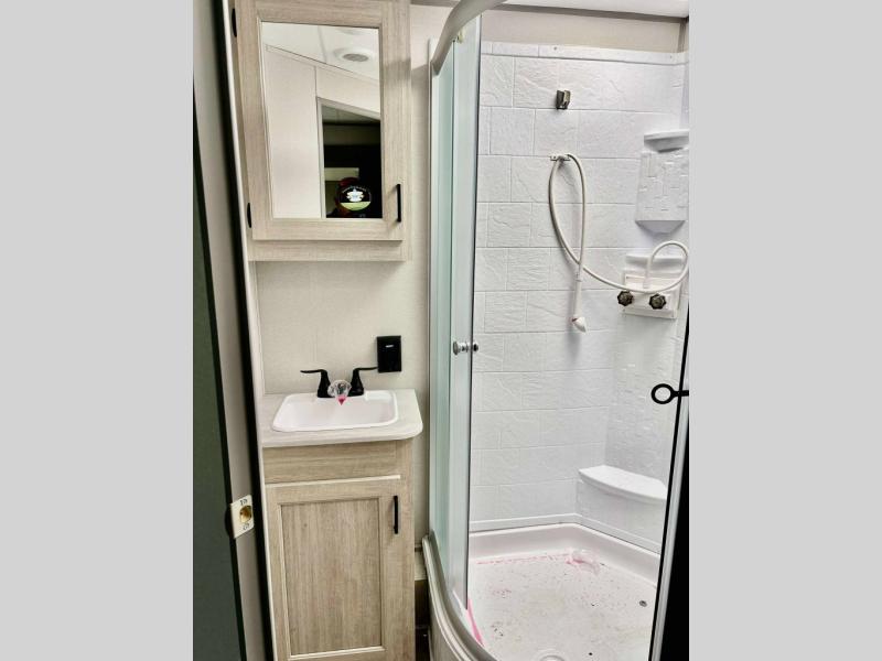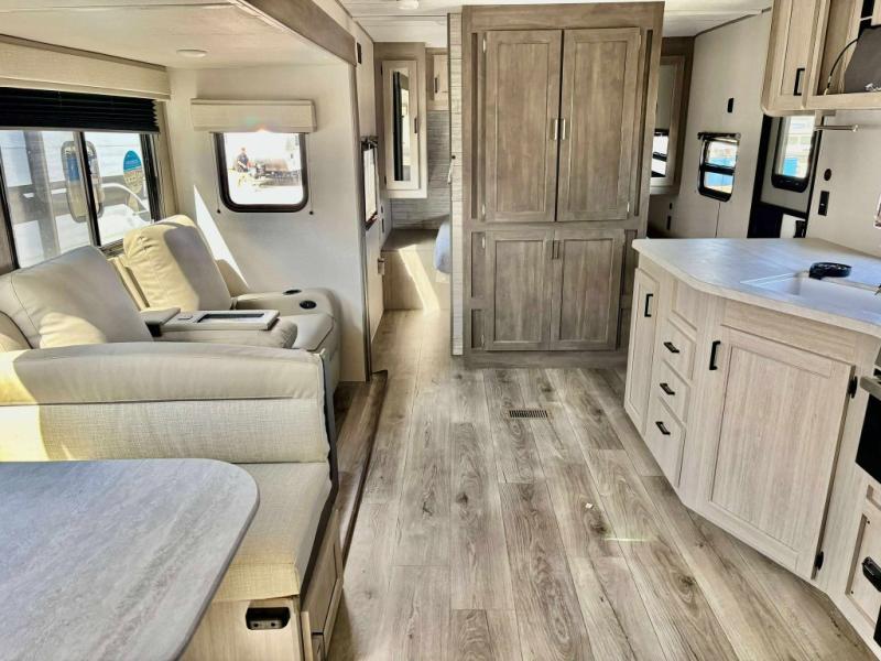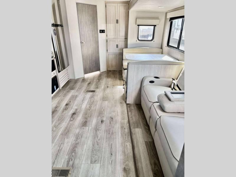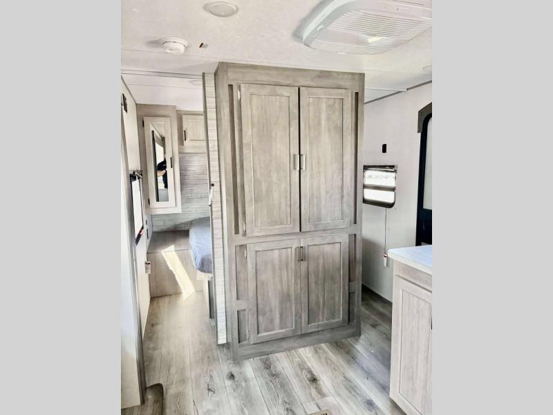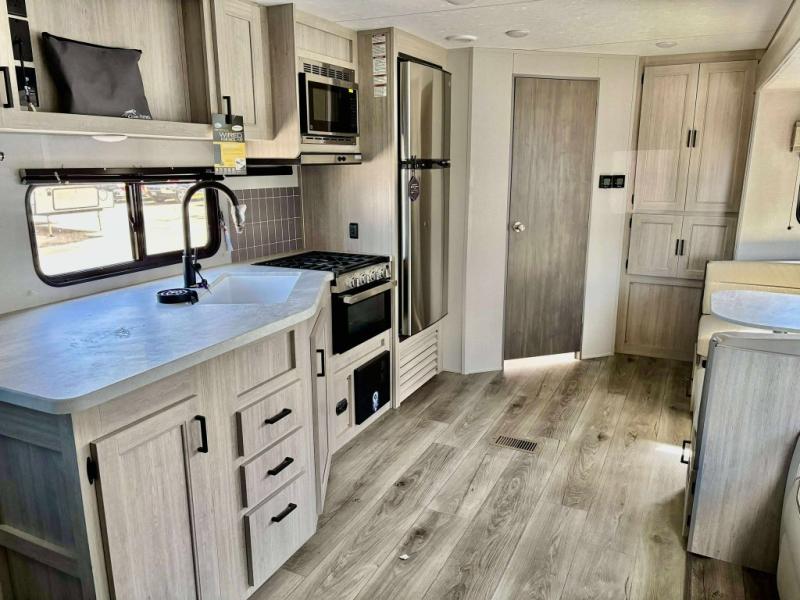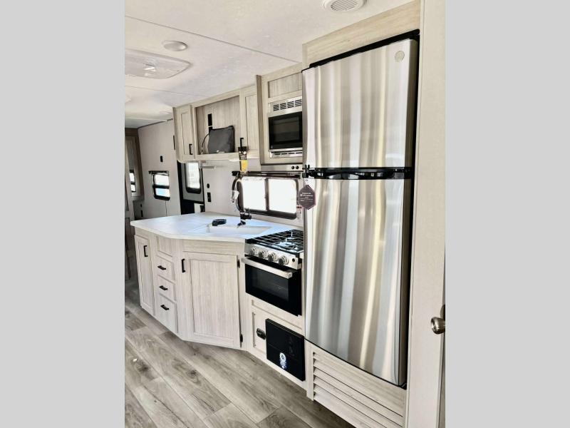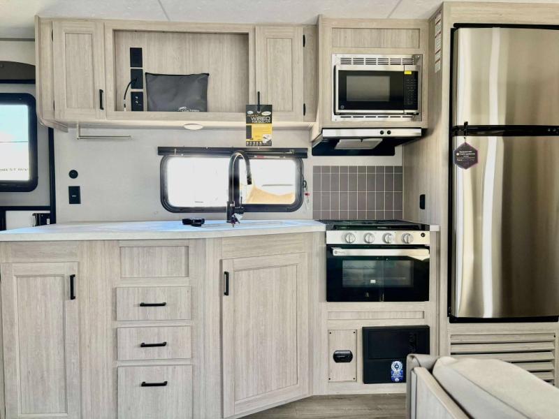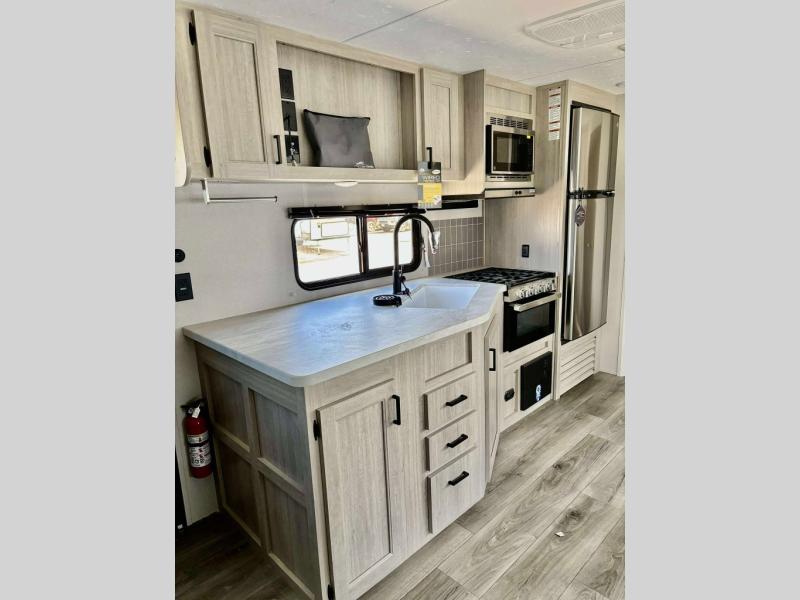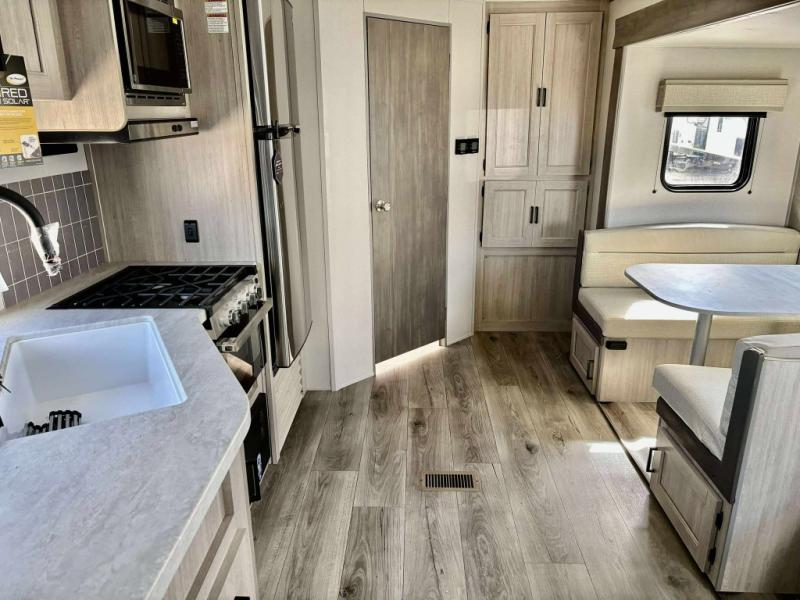 This half-ton friendly trailer is easy to pull and park, and is spacious thanks to the large slide out in the main living and kitchen area! You can dine at the booth dinette or choose the free standing dinette option, and the sofa offers drink holders for your drink when you're relaxing. The rear corner offers a full bathroom and a large wardrobe/pantry for the storage you need. The galley kitchen offers full amenities plus a breakfast bar where you can set out fresh fruit and cereal. And the 15' awning provides protection from the elements plus has the choice of multiple LED colors with the use of the remote.