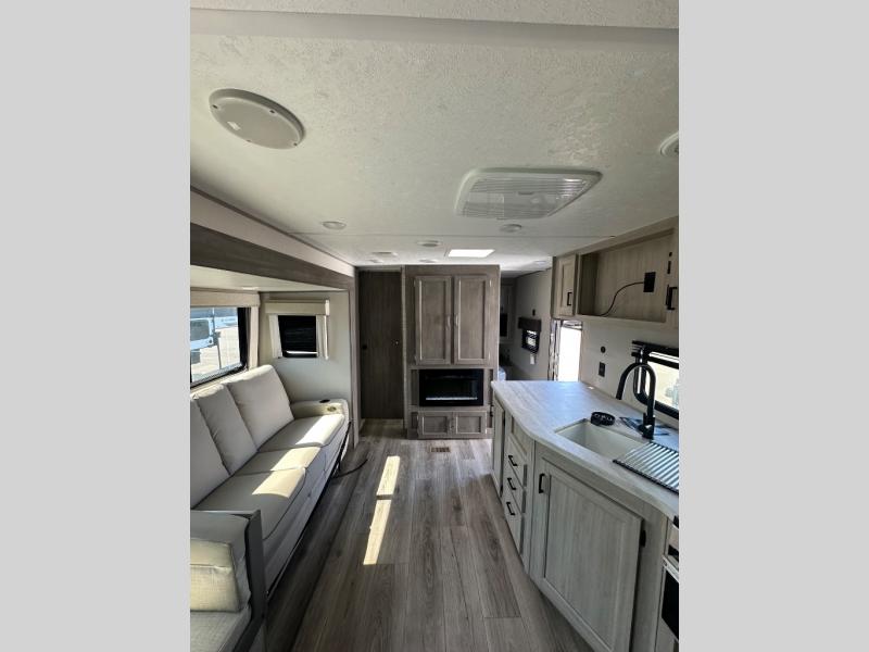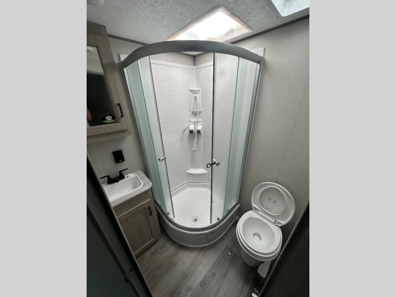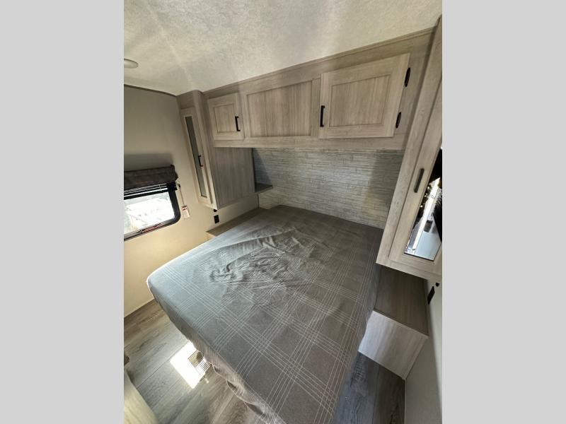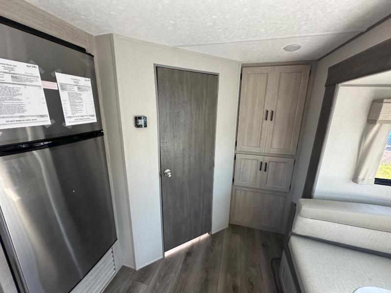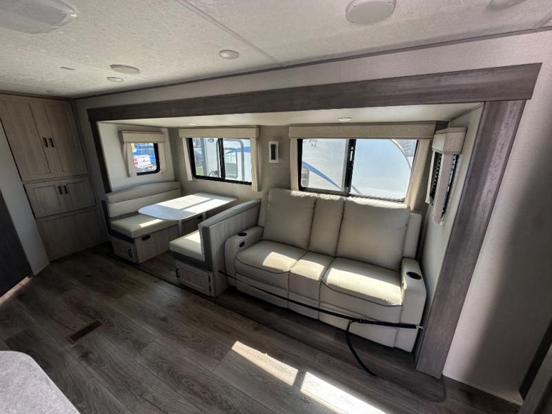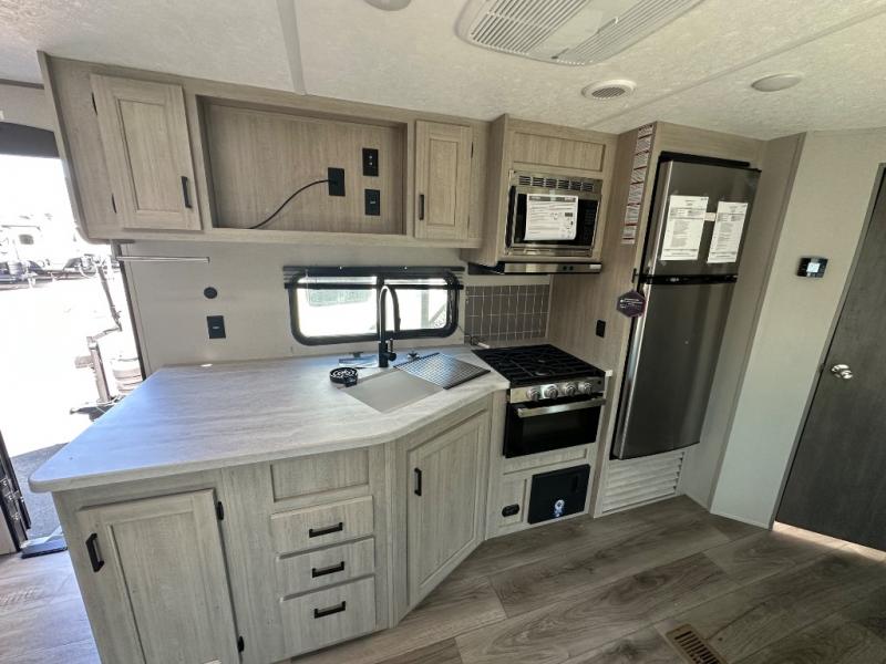 This half-ton friendly trailer is easy to pull and park, and is spacious thanks to the large slide out in the main living and kitchen area! You can dine at the booth dinette or choose the free standing dinette option, and the sofa offers drink holders for your drink when you're relaxing. The rear corner offers a full bathroom and a large wardrobe/pantry for the storage you need. The galley kitchen offers full amenities plus a breakfast bar where you can set out fresh fruit and cereal. And the 15' awning provides protection from the elements plus has the choice of multiple LED colors with the use of the remote.