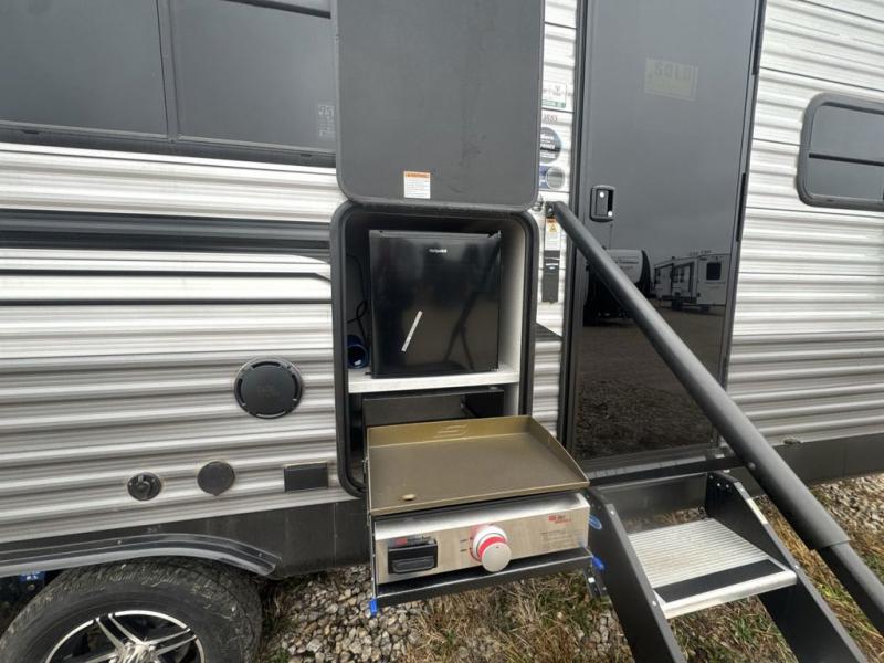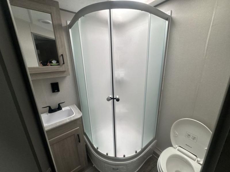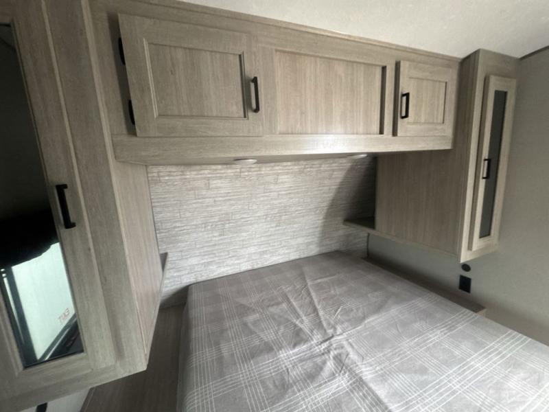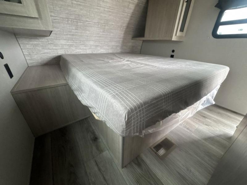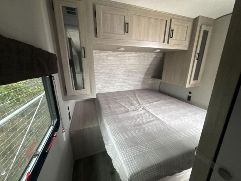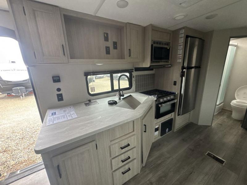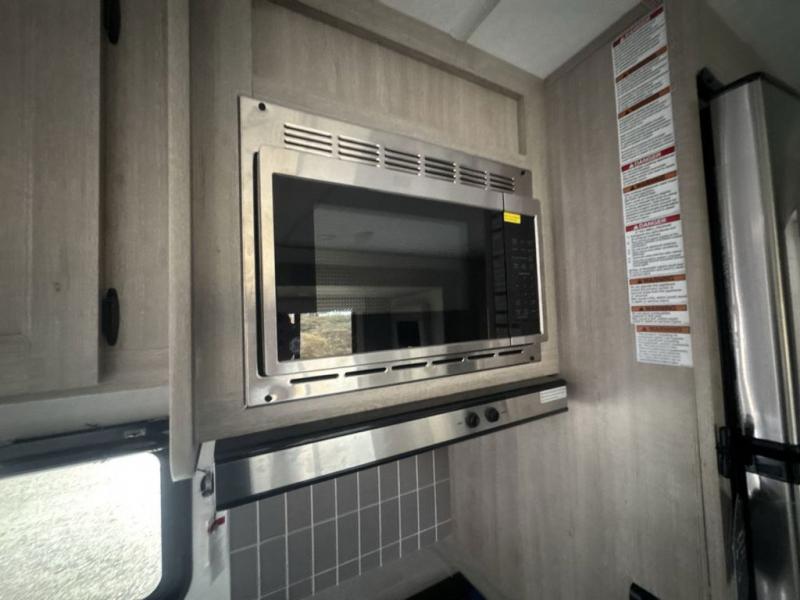 This half-ton friendly trailer is easy to pull and park, and is spacious thanks to the large slide out in the main living and kitchen area! You can dine at the booth dinette or choose the free standing dinette option, and the sofa offers drink holders for your drink when you're relaxing. The rear corner offers a full bathroom and a large wardrobe/pantry for the storage you need. The galley kitchen offers full amenities plus a breakfast bar where you can set out fresh fruit and cereal. And the 15' awning provides protection from the elements plus has the choice of multiple LED colors with the use of the remote.