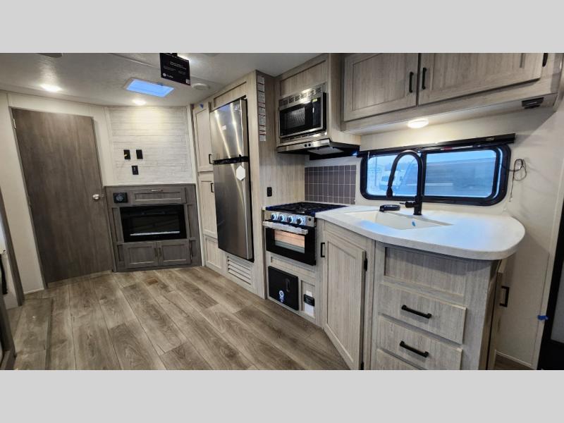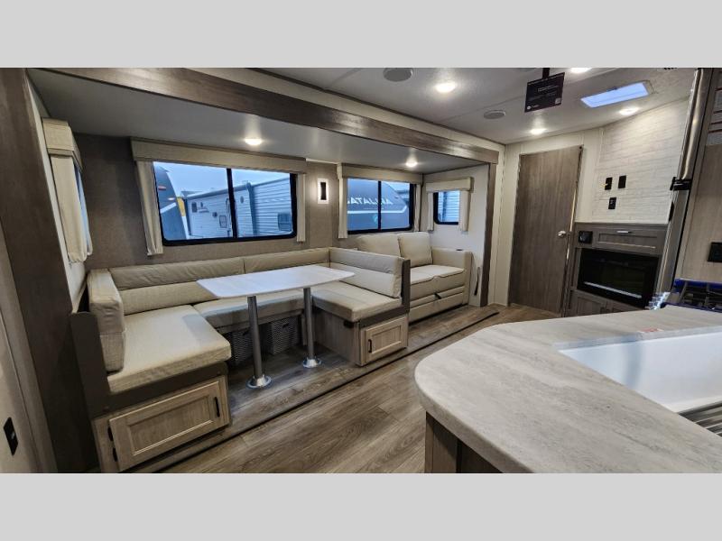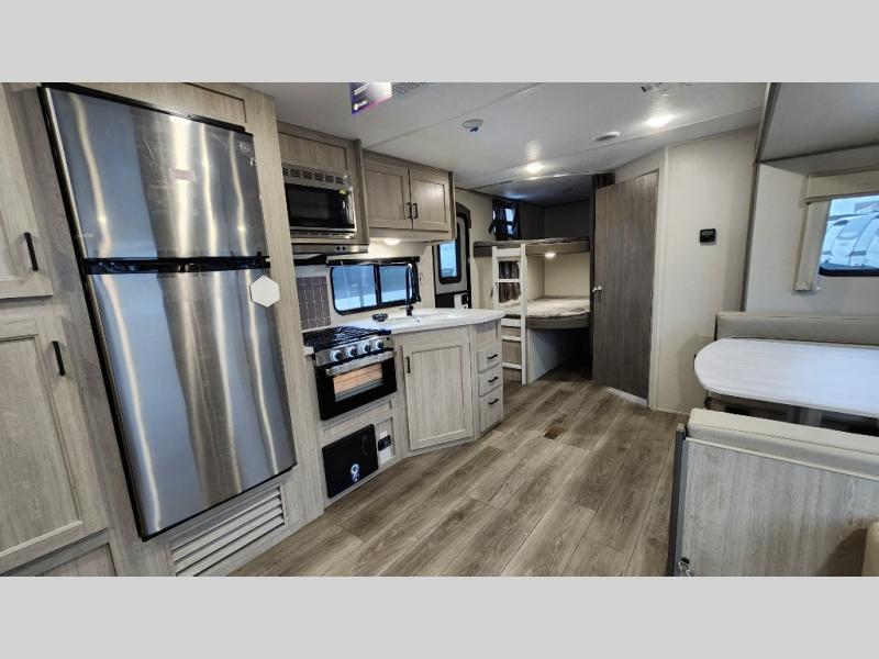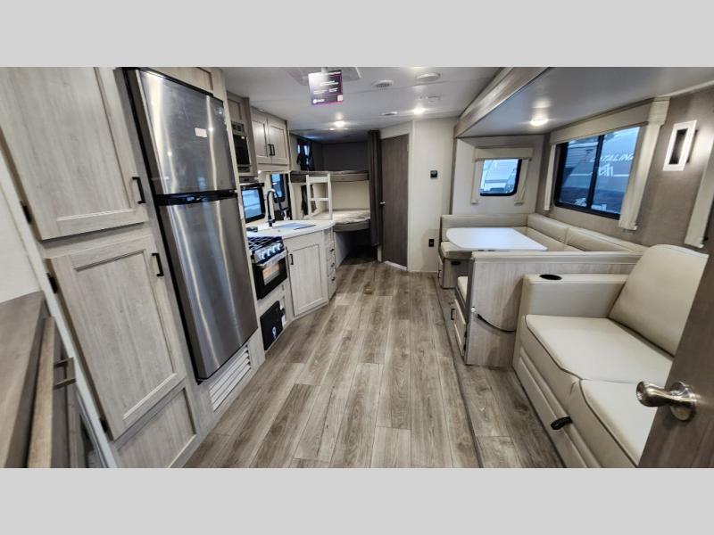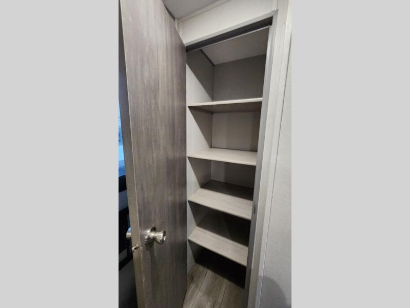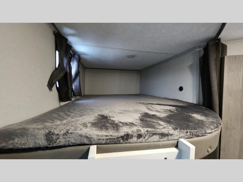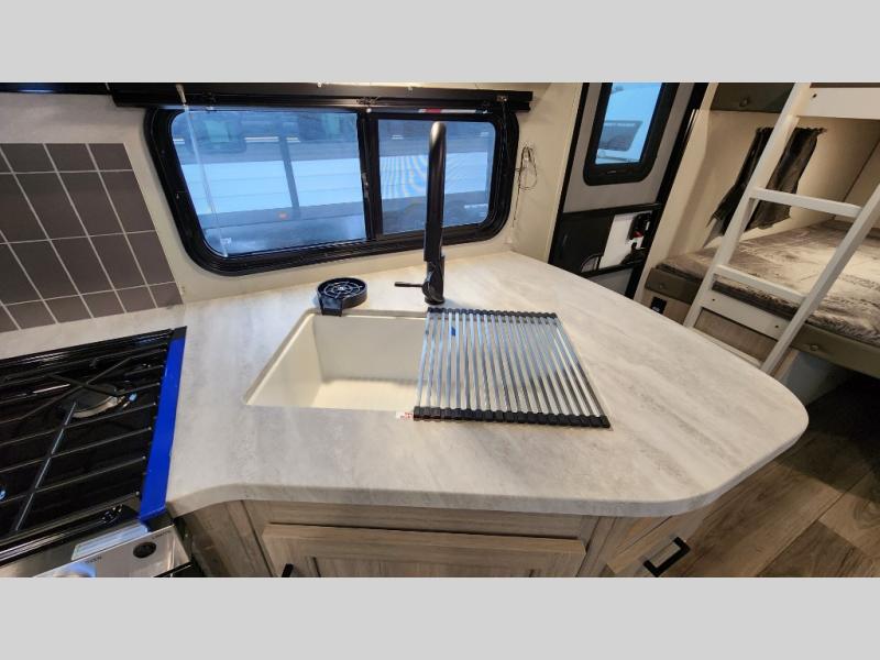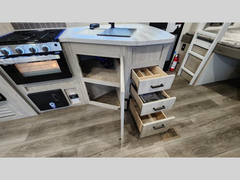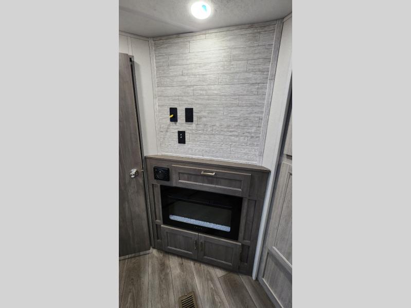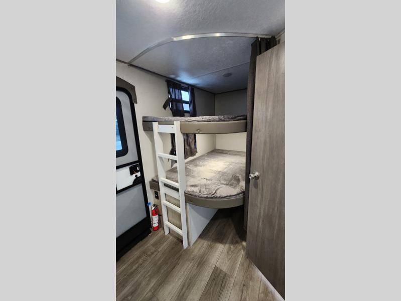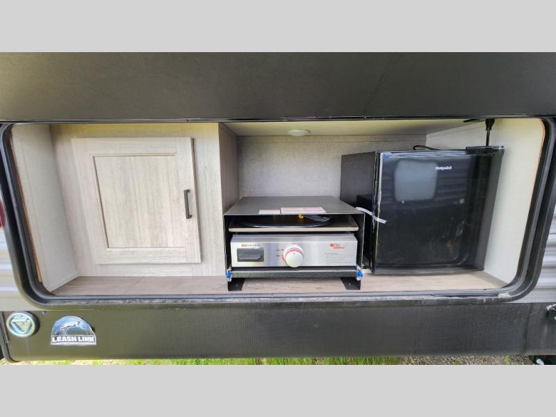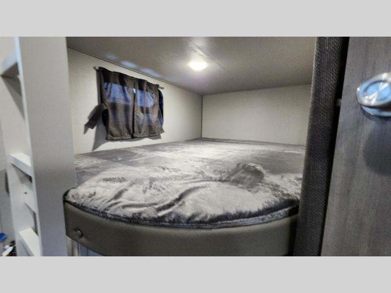 When you enjoy camping with your own accommodations and space for the whole crew, hitch this trailer up and head to the campgrounds! After loading everything easily thanks to the dual entry doors and all the interior and exterior storage, you will have no worries that you left anything behind. The electric awning is easy to set up, like the large slide out, and the awning offers multicolor LED lights to choose from by using the remote. When you are outside the cook might like to make a meal using the outside camper kitchen. The interior kitchen offers full amenities including a pantry, and everyone can enjoy the angled entertainment center. There are double-size bunks with a ladder for the kids and a walk-around queen bed for the owner to sleep on, plus furniture in the living area that doubles as additional sleeping space!