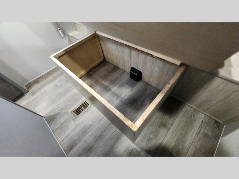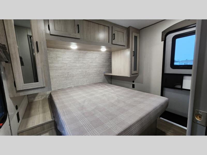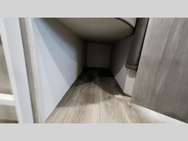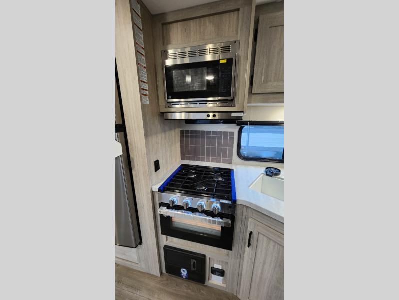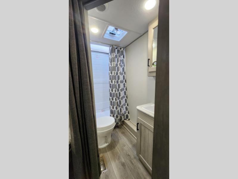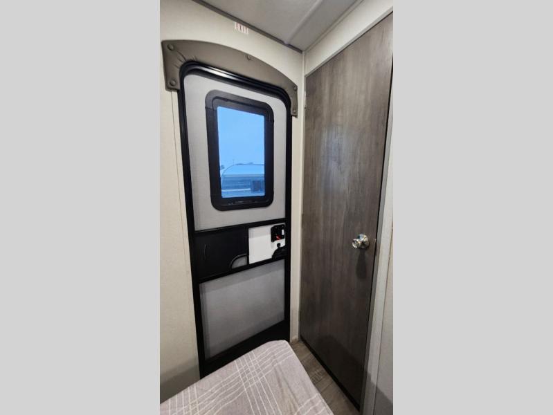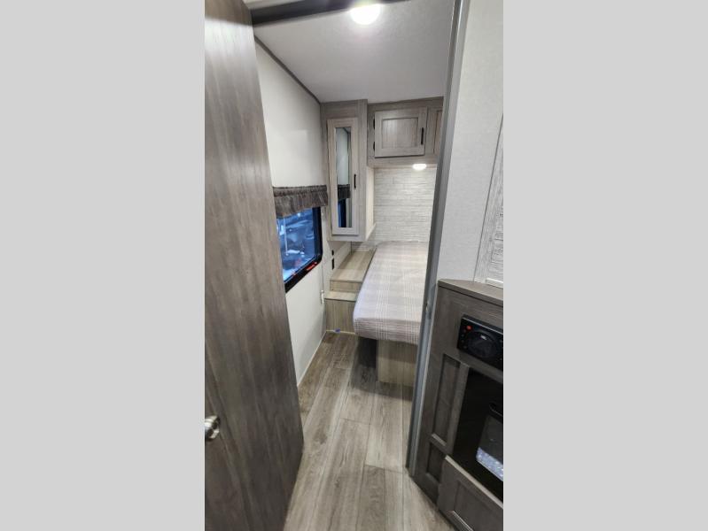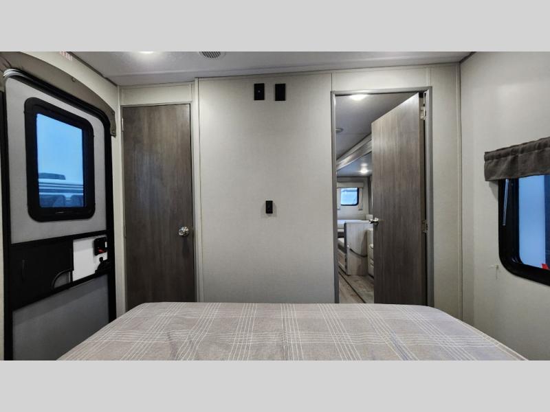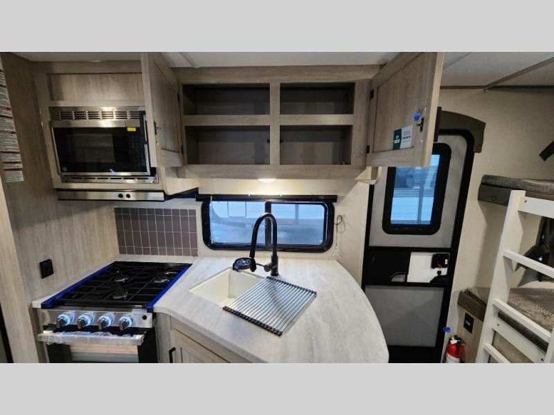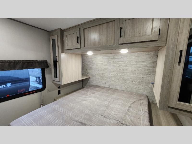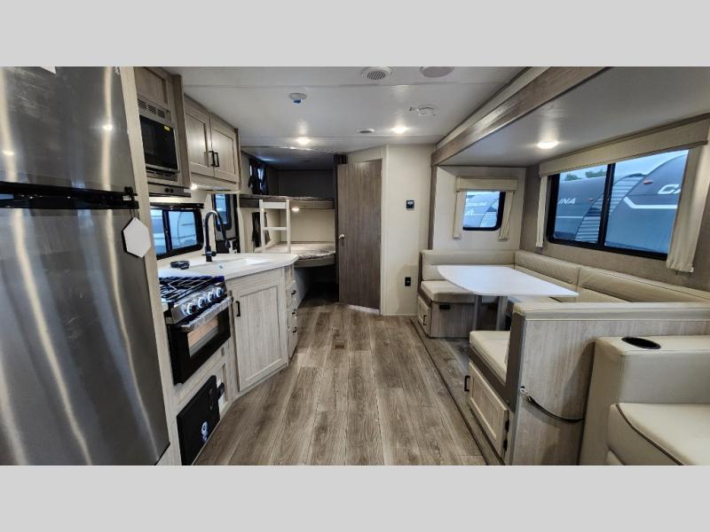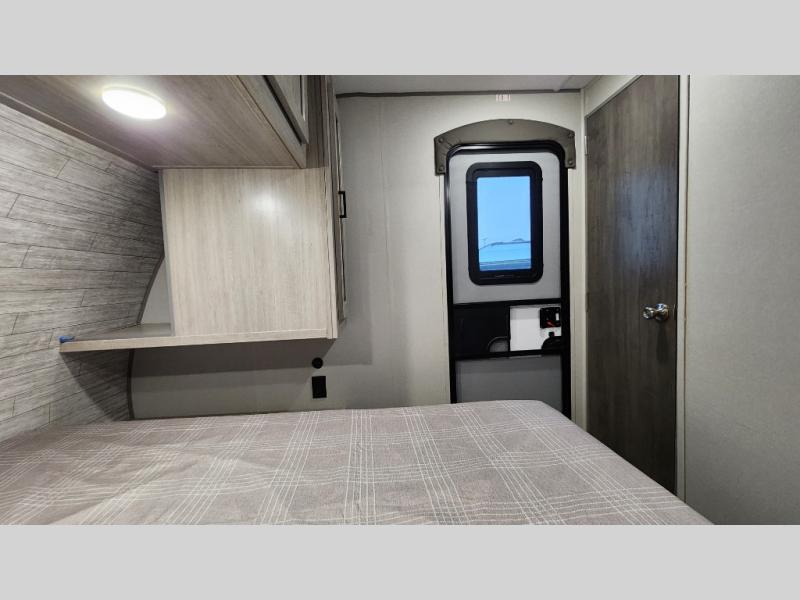 When you enjoy camping with your own accommodations and space for the whole crew, hitch this trailer up and head to the campgrounds! After loading everything easily thanks to the dual entry doors and all the interior and exterior storage, you will have no worries that you left anything behind. The electric awning is easy to set up, like the large slide out, and the awning offers multicolor LED lights to choose from by using the remote. When you are outside the cook might like to make a meal using the outside camper kitchen. The interior kitchen offers full amenities including a pantry, and everyone can enjoy the angled entertainment center. There are double-size bunks with a ladder for the kids and a walk-around queen bed for the owner to sleep on, plus furniture in the living area that doubles as additional sleeping space!