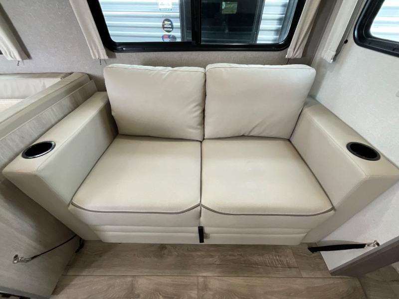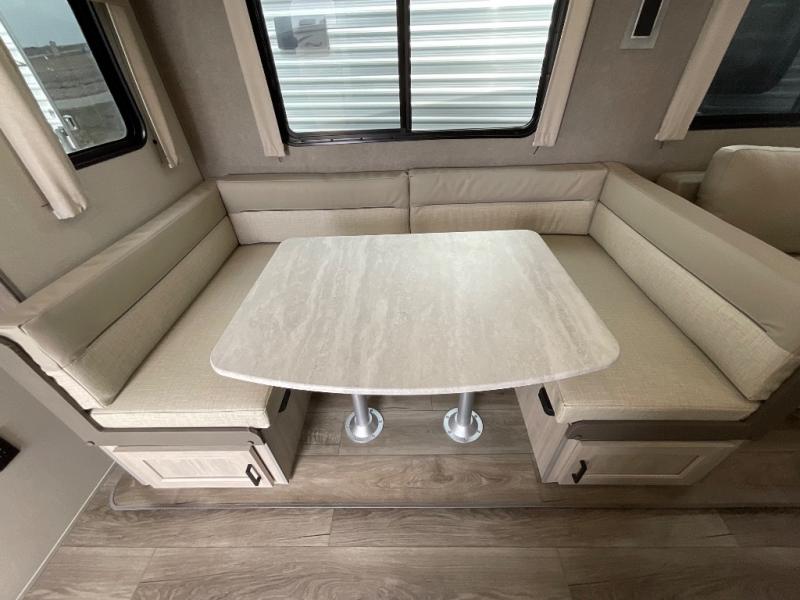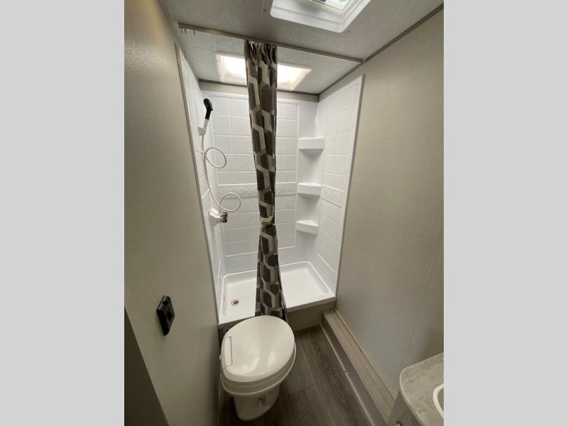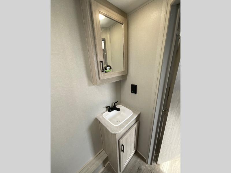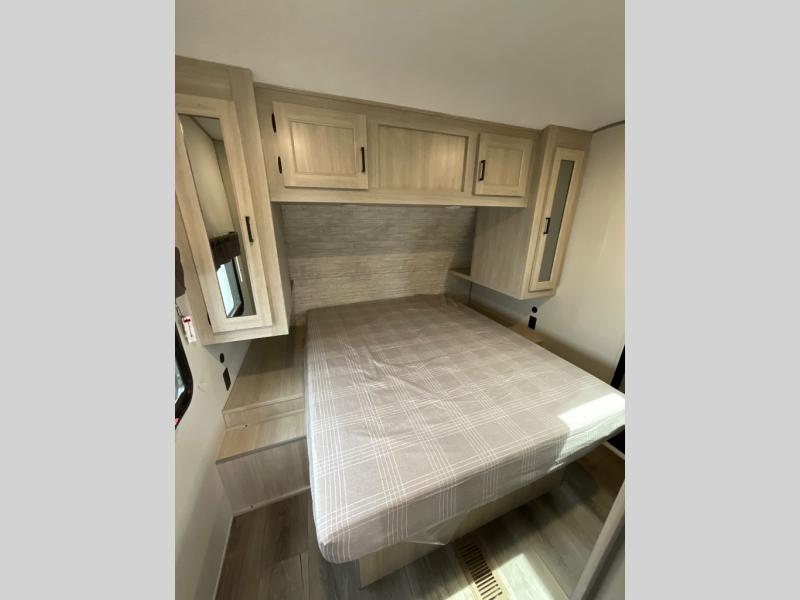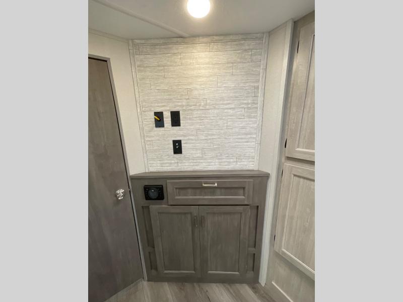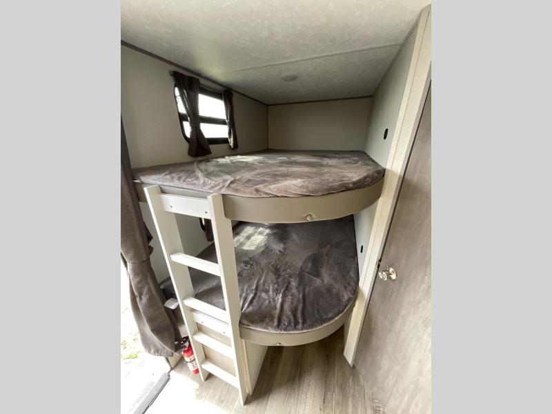 When you enjoy camping with your own accommodations and space for the whole crew, hitch this trailer up and head to the campgrounds! After loading everything easily thanks to the dual entry doors and all the interior and exterior storage, you will have no worries that you left anything behind. The electric awning is easy to set up, like the large slide out, and the awning offers multicolor LED lights to choose from by using the remote. When you are outside the cook might like to make a meal using the outside camper kitchen. The interior kitchen offers full amenities including a pantry, and everyone can enjoy the angled entertainment center. There are double-size bunks with a ladder for the kids and a walk-around queen bed for the owner to sleep on, plus furniture in the living area that doubles as additional sleeping space!