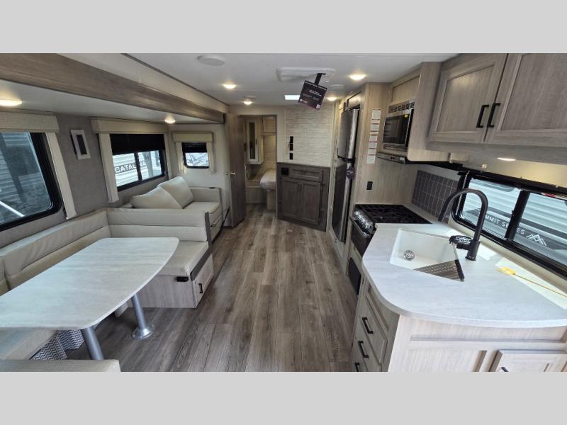 Each Catalina Legacy travel trailer by Coachmen is constructed with a cambered structural steel I-beam frame for added strength and support, plus an enclosed and fully sealed corrugated underbelly to extend your camping season. There is also a seamless Alpha roof membrane, R-7 insulation throughout, full length frame outriggers, plus many more durable construction materials. You will love the 6' 9" interior height, along with Congoleum woodplank linoleum flooring, seamless Thermofoil countertops, and hard valance window treatments. Choose a Catalina Legacy today!