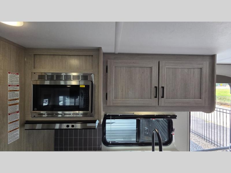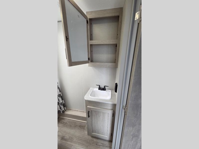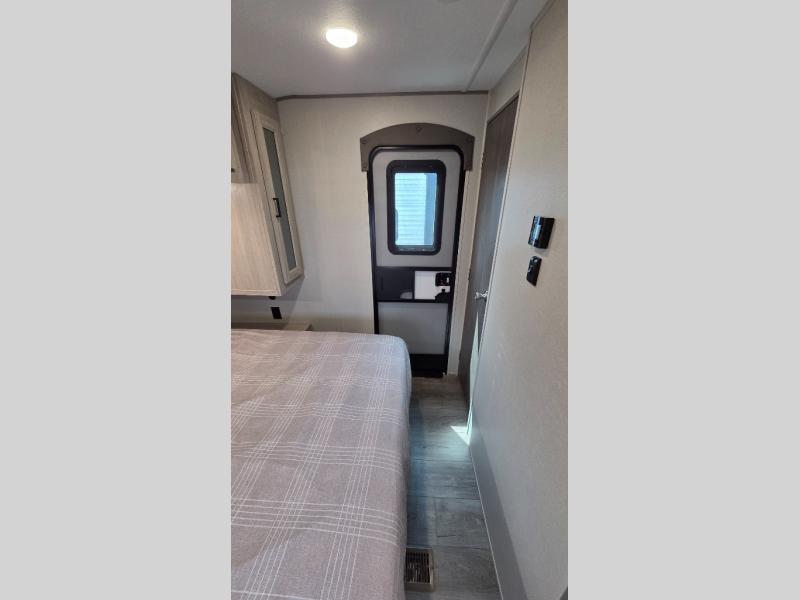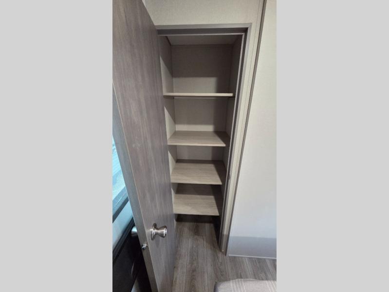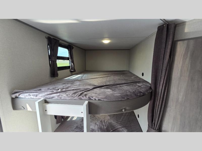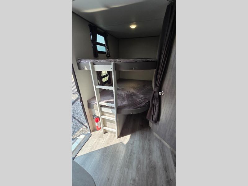 When you enjoy camping with your own accommodations and space for the whole crew, hitch this trailer up and head to the campgrounds! After loading everything easily thanks to the dual entry doors and all the interior and exterior storage, you will have no worries that you left anything behind. The electric awning is easy to set up, like the large slide out, and the awning offers multicolor LED lights to choose from by using the remote. When you are outside the cook might like to make a meal using the outside camper kitchen. The interior kitchen offers full amenities including a pantry, and everyone can enjoy the angled entertainment center. There are double-size bunks with a ladder for the kids and a walk-around queen bed for the owner to sleep on, plus furniture in the living area that doubles as additional sleeping space!
