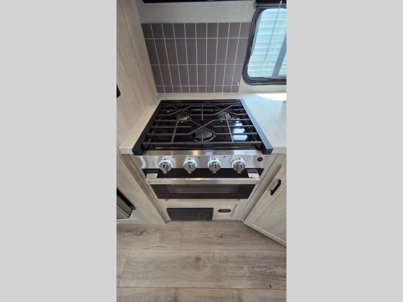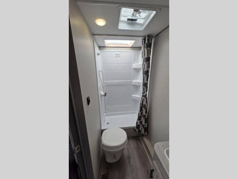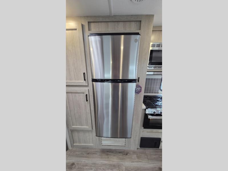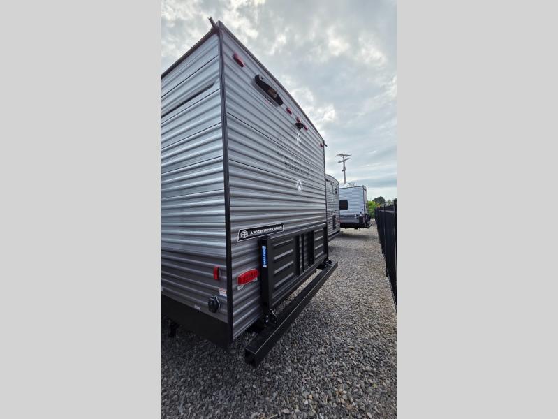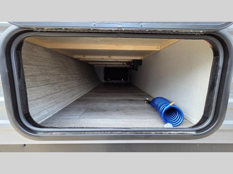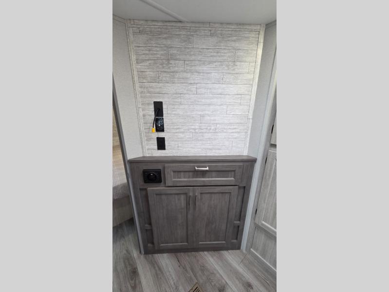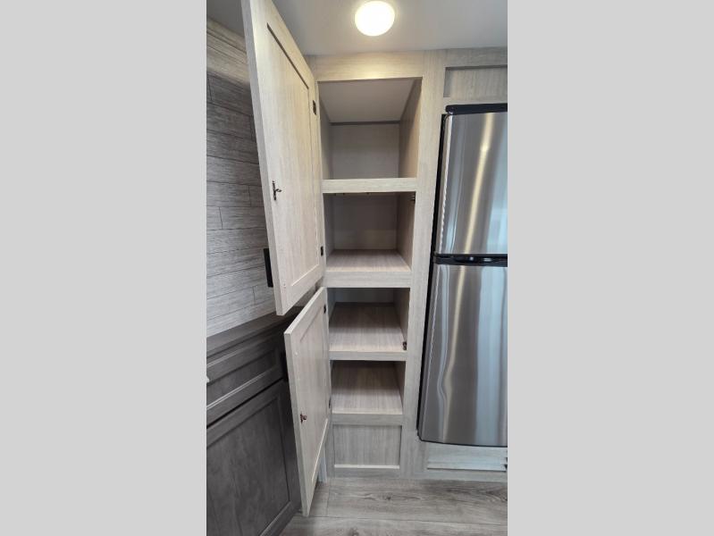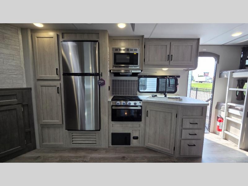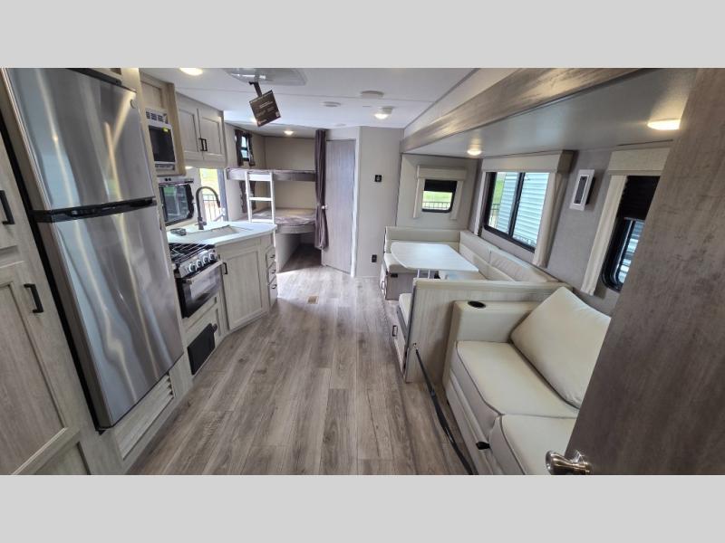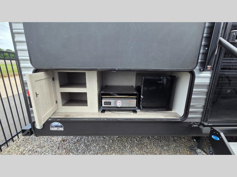 When you enjoy camping with your own accommodations and space for the whole crew, hitch this trailer up and head to the campgrounds! After loading everything easily thanks to the dual entry doors and all the interior and exterior storage, you will have no worries that you left anything behind. The electric awning is easy to set up, like the large slide out, and the awning offers multicolor LED lights to choose from by using the remote. When you are outside the cook might like to make a meal using the outside camper kitchen. The interior kitchen offers full amenities including a pantry, and everyone can enjoy the angled entertainment center. There are double-size bunks with a ladder for the kids and a walk-around queen bed for the owner to sleep on, plus furniture in the living area that doubles as additional sleeping space!