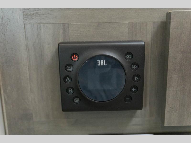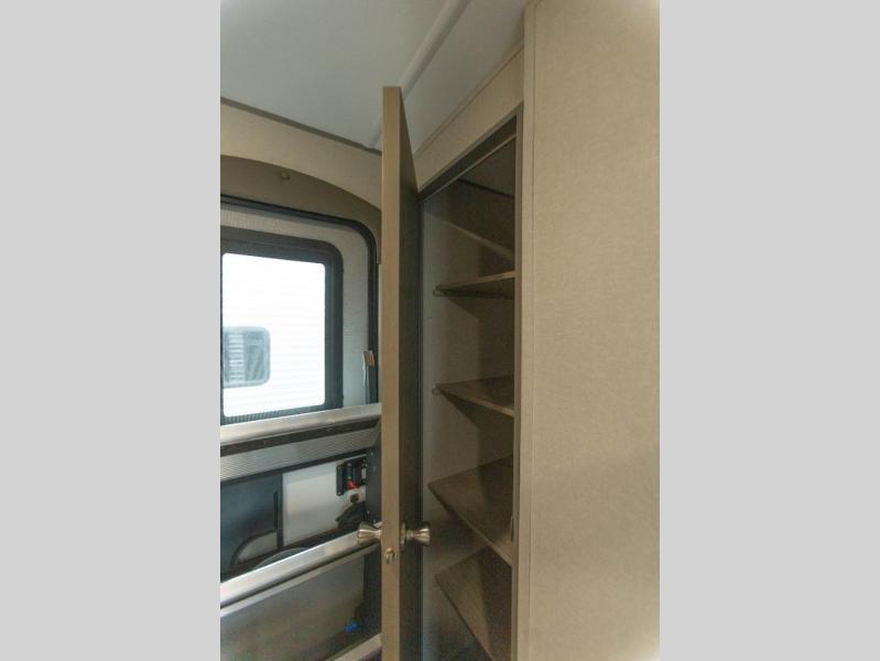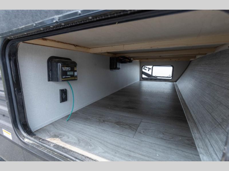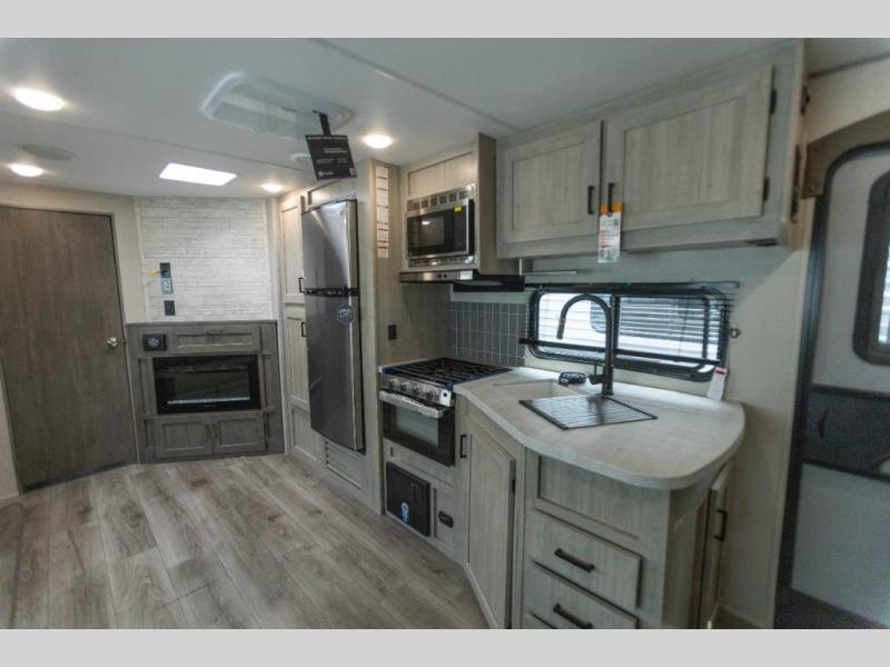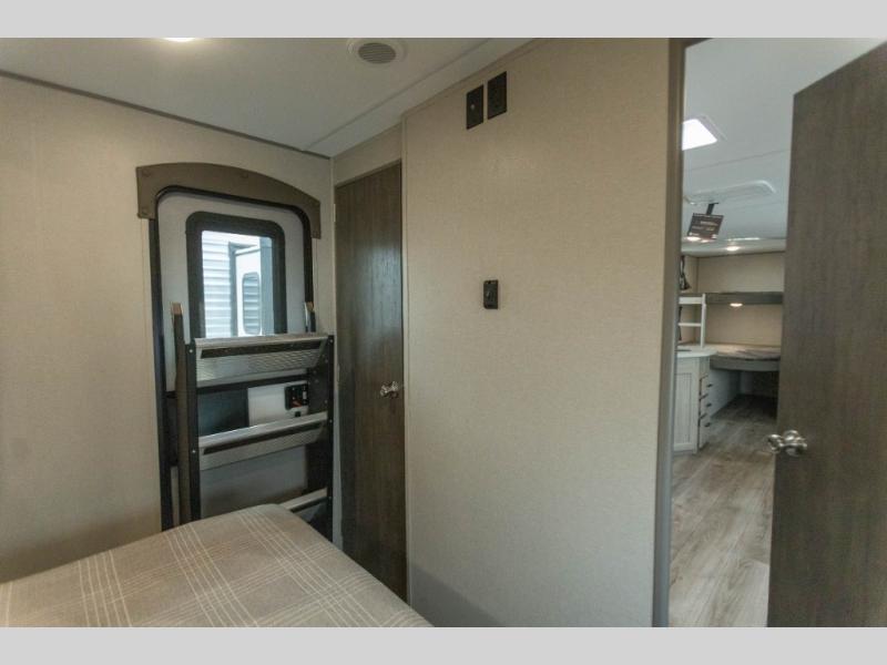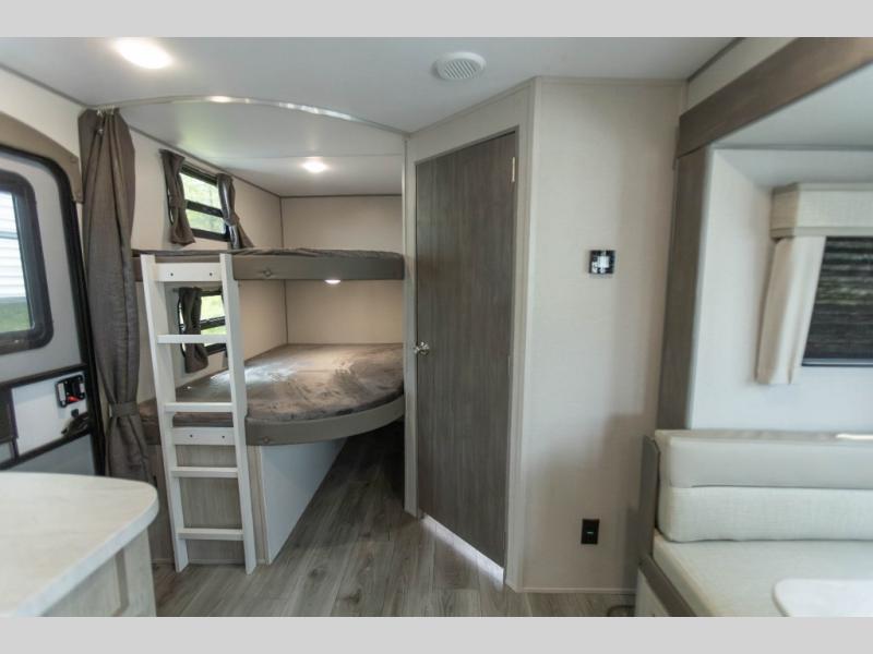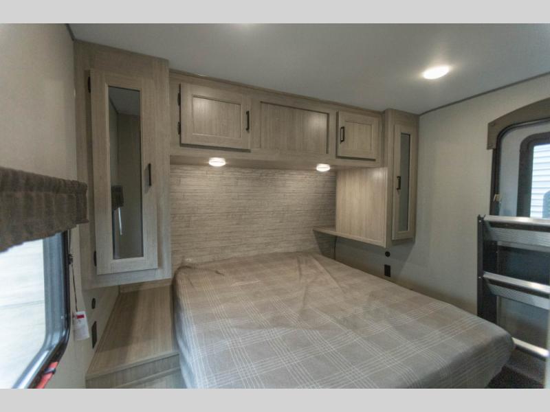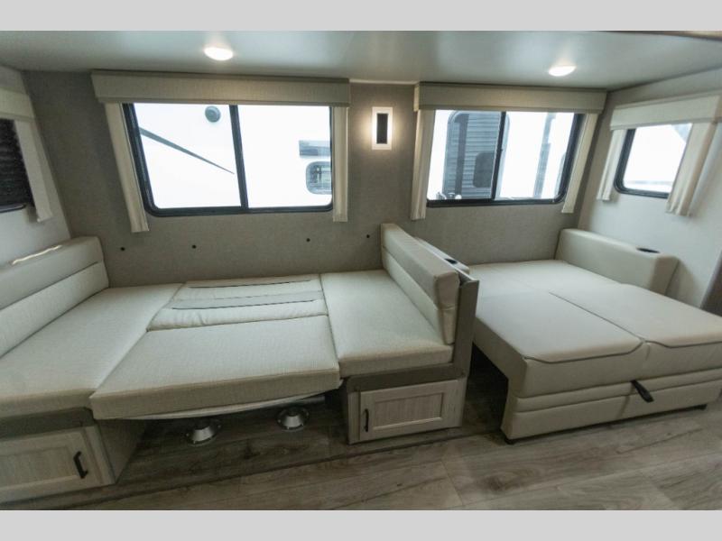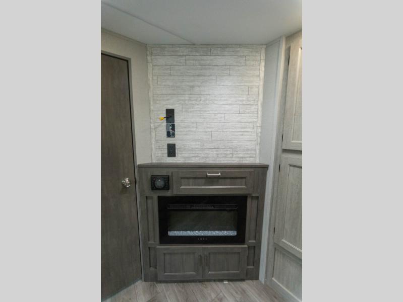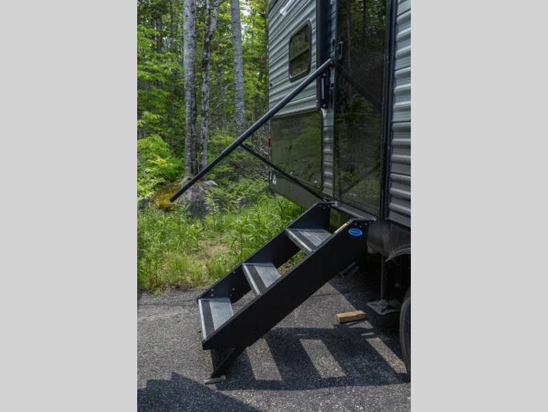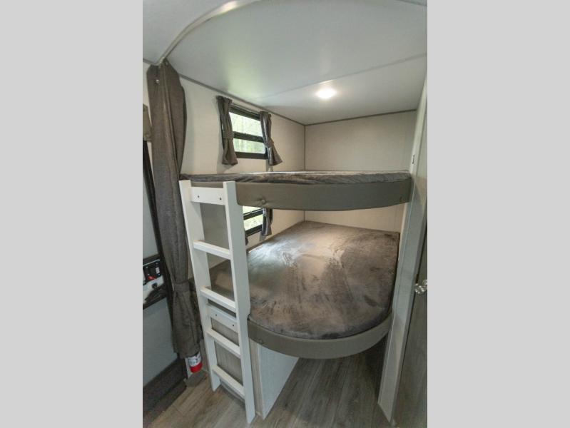 When you enjoy camping with your own accommodations and space for the whole crew, hitch this trailer up and head to the campgrounds! After loading everything easily thanks to the dual entry doors and all the interior and exterior storage, you will have no worries that you left anything behind. The electric awning is easy to set up, like the large slide out, and the awning offers multicolor LED lights to choose from by using the remote. When you are outside the cook might like to make a meal using the outside camper kitchen. The interior kitchen offers full amenities including a pantry, and everyone can enjoy the angled entertainment center. There are double-size bunks with a ladder for the kids and a walk-around queen bed for the owner to sleep on, plus furniture in the living area that doubles as additional sleeping space!
